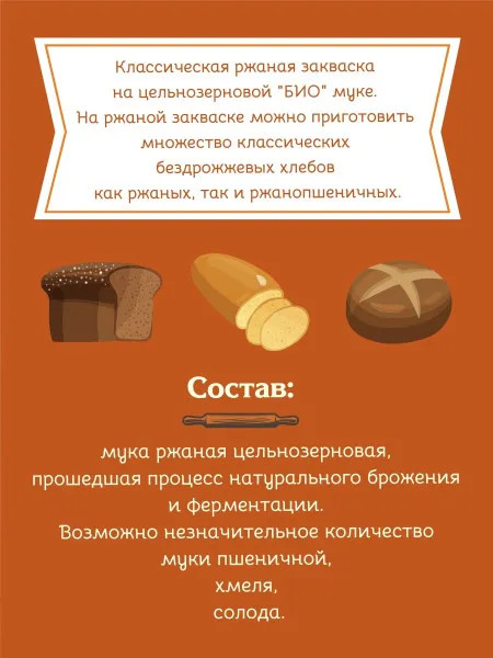 Приобрела Закваску Ржаную. Очень понравилась. Завела как написано в рецепте на обороте пакета, сделала впервые опару, затем завела на ней тесто. Понравилась выпечка. Потом только добавляла пару раз по 100 г муки и 40 мл теплой воды. Закваска очень хорошо выброжена и поднимает тесто отлично. Кто хаводил сам бездрожжевую закваску - оценит и качество, и очень простое использование закваски. Спасибо Flip.