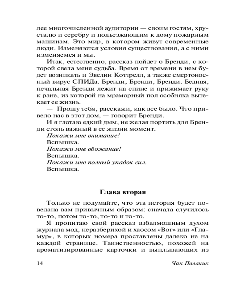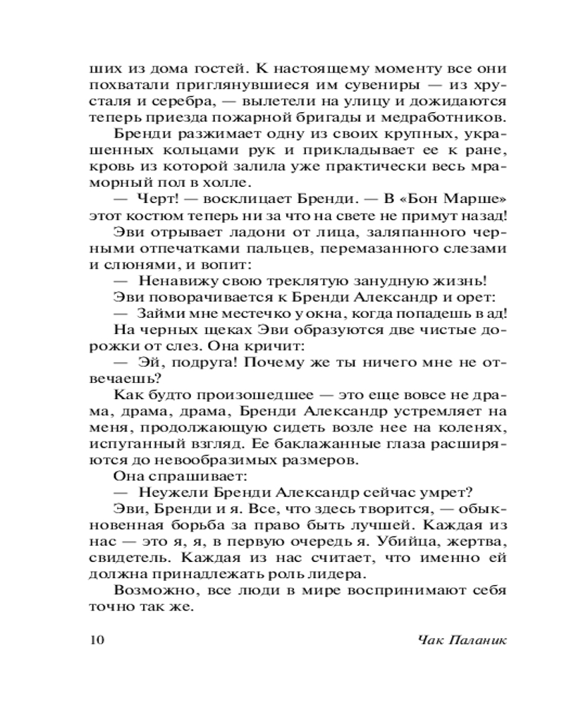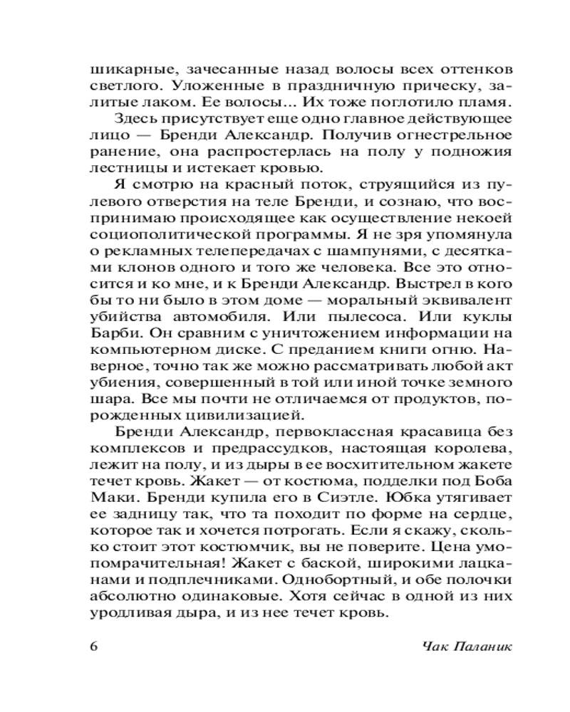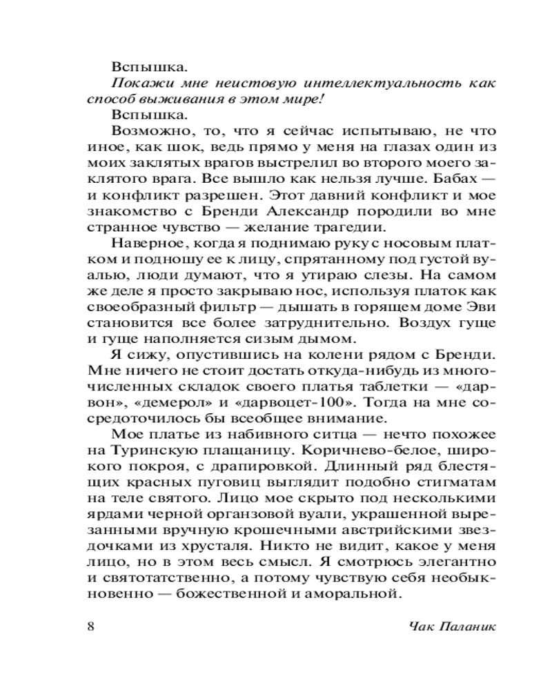 Когда читаешь ее, возникает ощущение, что собственной кровью ее написал Чак Паланик... |