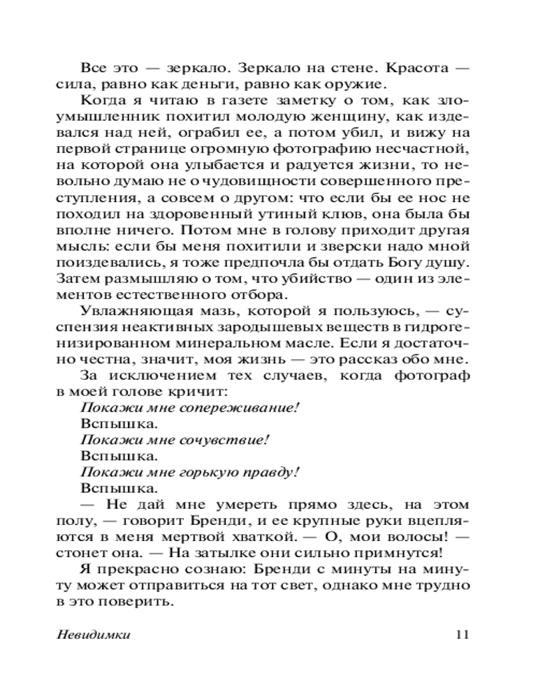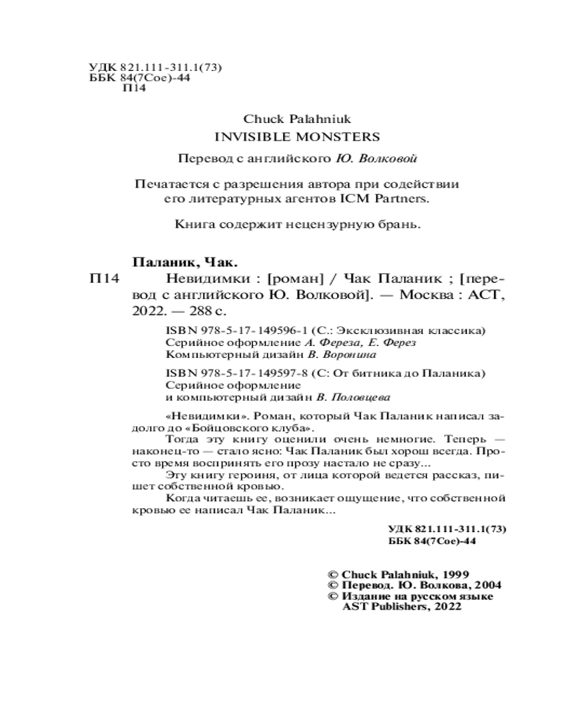 мягкий переплёт без повреждений удобное чтение В данный момент этот товар отсутствует в продаже. Возможно, у нас найдется аналогичный или похожий товар здесь. Серия: Эксклюзивная классика «Невидимки». Роман, который Чак Паланик написал задолго до «Бойцовского клуба».