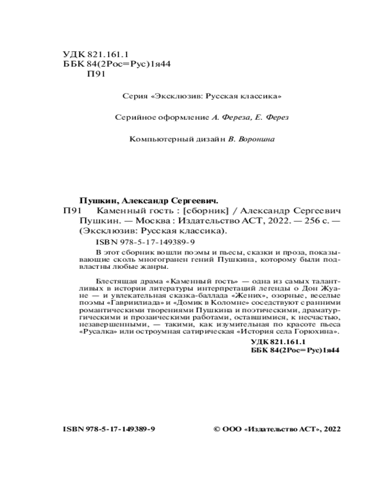 Каменный гостьВ данный момент этот товар отсутствует в продаже. Возможно, у нас найдется аналогичный или похожий товар здесь. Серия: Эксклюзив: Русская классика В этот сборник вошли поэмы и пьесы, сказки и проза, показывающие сколь многогранен гений Пушкина, которому были подвластны любые жанры. |