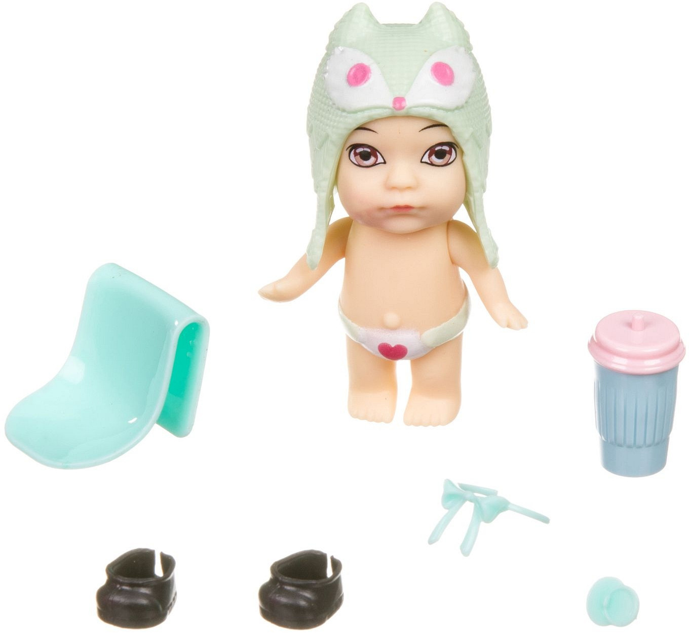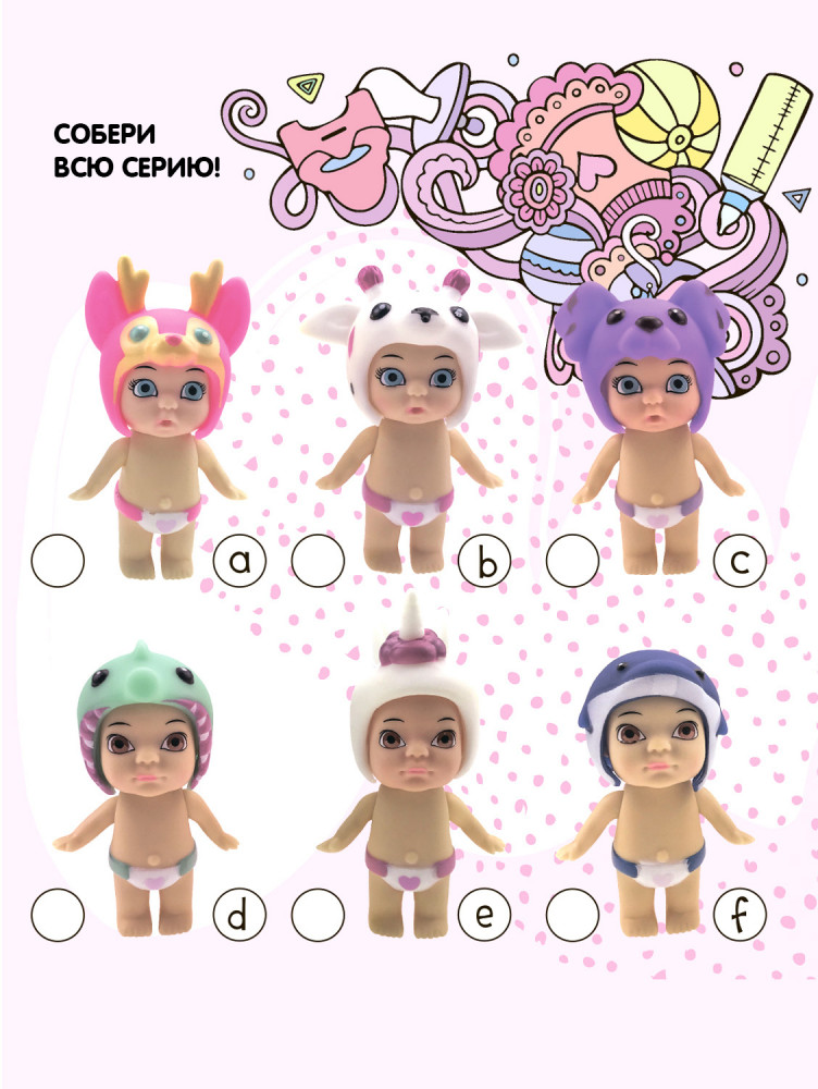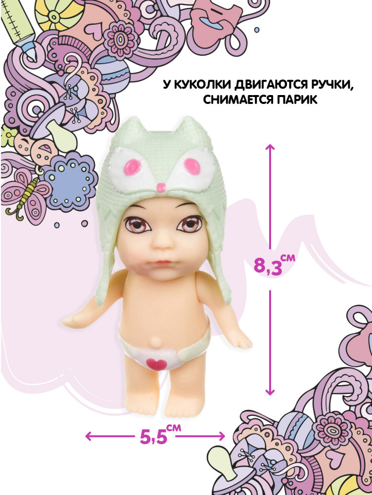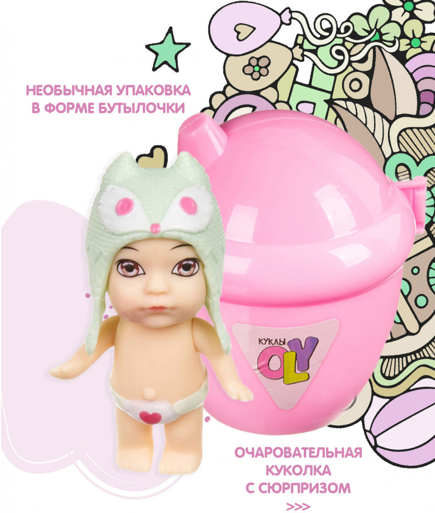 Упаковка в виде бутылочки с носиком, внутри которой расположены полочки для аксессуаров, непременно заинтересует малышку. В коллекции «Кукла в бутылочке» — 12 пупсиков в разноцветных шапочках-ушанках в виде животных. Соберите всю серию кукол OLY!