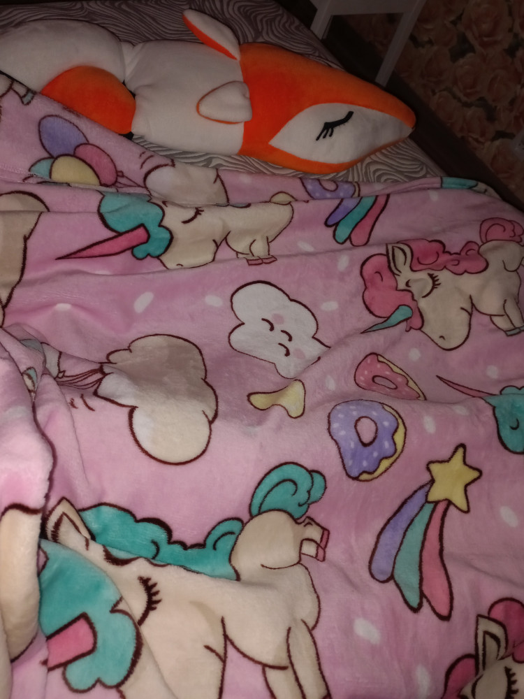 Принт красивый, в меру яркий, единороги крупные. Тоненький. Для младенца можно его сложить пополам, как раз под размер коляски. С одной стороны кривой заводской срез. В принципе за такие смешные деньги грех жаловаться))