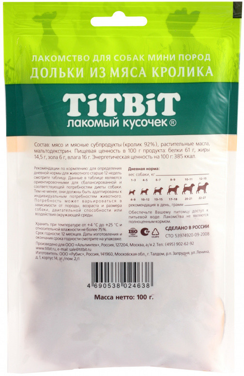 TiTBiT Лакомство для собак мини пород «Дольки из мяса кролика»