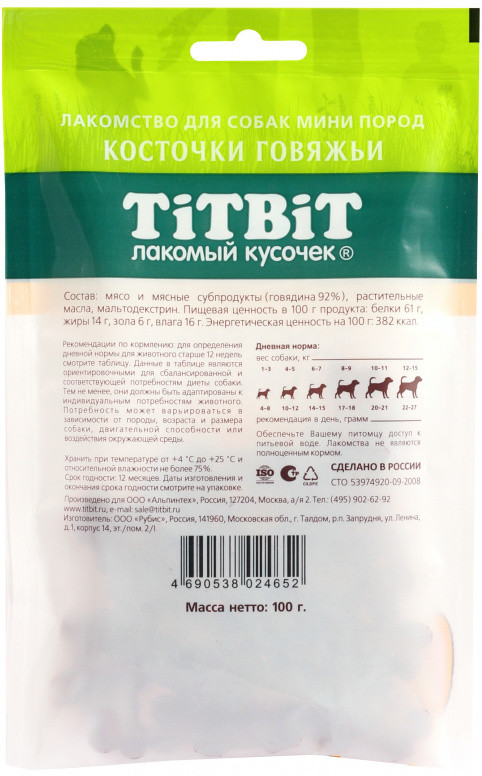 TiTBiT Лакомство для собак мини пород «Косточки говяжьи»В данный момент этот товар отсутствует в продаже. Возможно, у нас найдется аналогичный или похожий товар здесь. Серия: Лакомый кусочек Условия хранения товара: температурный режим от -10 до +25°С. |