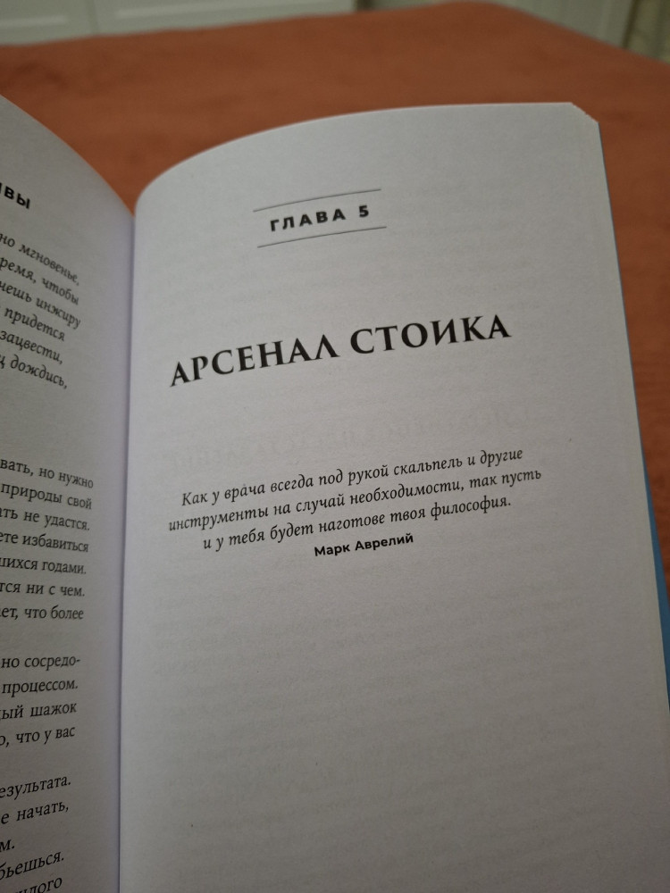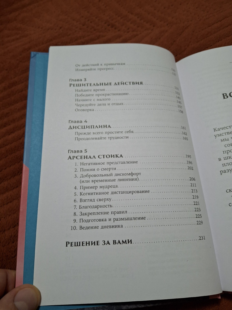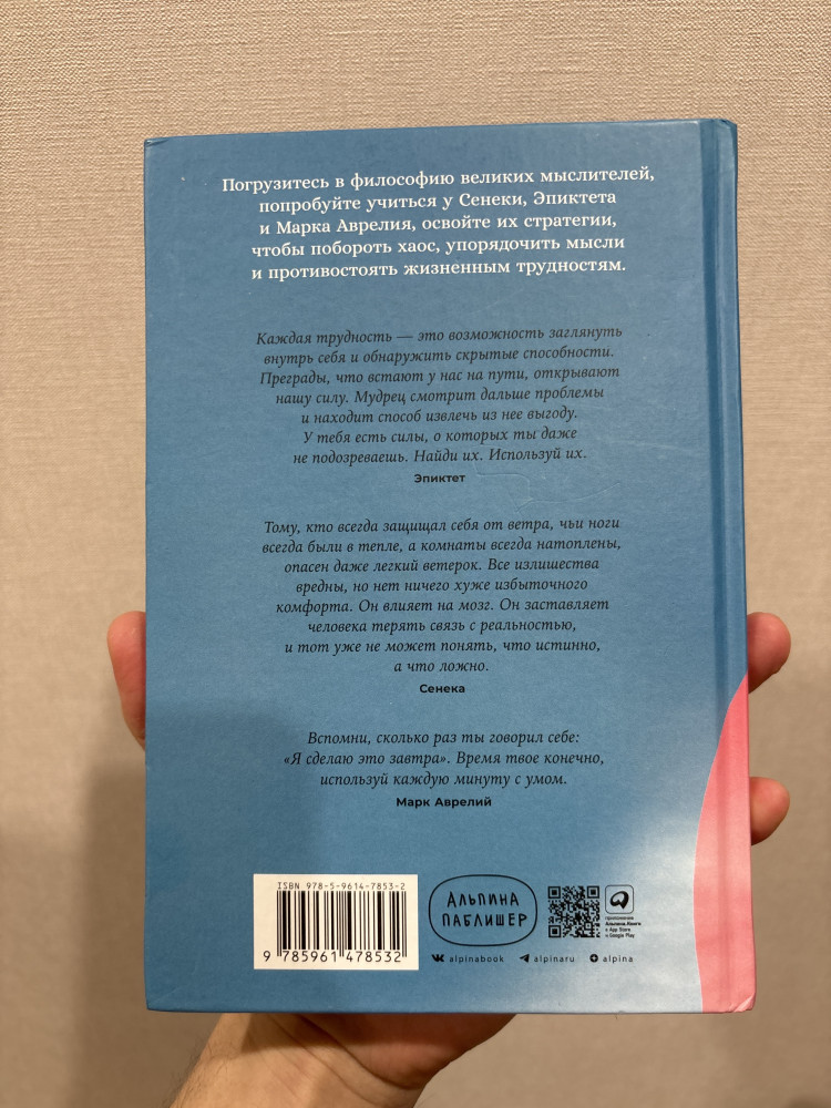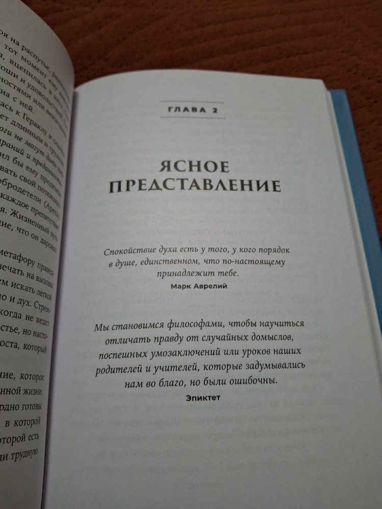 За 2 вечера прочла половину книги. Я в восторге! Описание философии стоицизма с переходом в КПТ. Как я поняла, далее будут методы управления своими эмоциями. Мне кажется эта книга заменяет несколько сеансов психотерапии). Основной урок стоицизма - концентрация усилий на том, что от нас зависит. Переживания из-за вещей, которые от нас не зависят, приводят лишь к тревоге и фрустрации. Однозначно советую тем, у кого низкая самооценка, кто не может или не умеет ставить цели и добиваться их, тревожным людям, может даже тем у кого есть ПА, кто хочет придти к спокойствию разума и чистоте души. Очень полезная книга, не жалею что купила. Магазину Flip спасибо! Курьер тоже молодец. Книга в твердой обложке, листы белые. Есть немного косяков по шрифту, но для меня не критично.