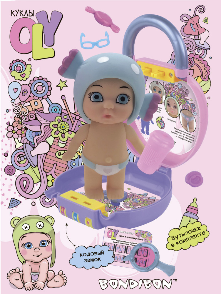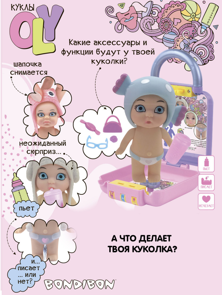 Bondibon представляет эксклюзивную линейку кукол OLY! Это очаровательные куколки высотой 8 см, у каждой из которых есть свой оригинальный стиль, набор аксессуаров, а также особенные функции, наличие и разнообразие которых варьируется от одной куколки к другой. Например, одна куколка пьет, другая пьет и писает, а третья реагирует на влагу! У куколки двигаются ручки, снимается головной убор — у каждой куколки он свой. На неё можно примерить все аксессуары из любого набора OLY. Упаковка в виде чемоданчика с кодовым замочком поможет хранить в тайне все свои секретики и аксессуары пупса. Соберите всю серию кукол OLY!