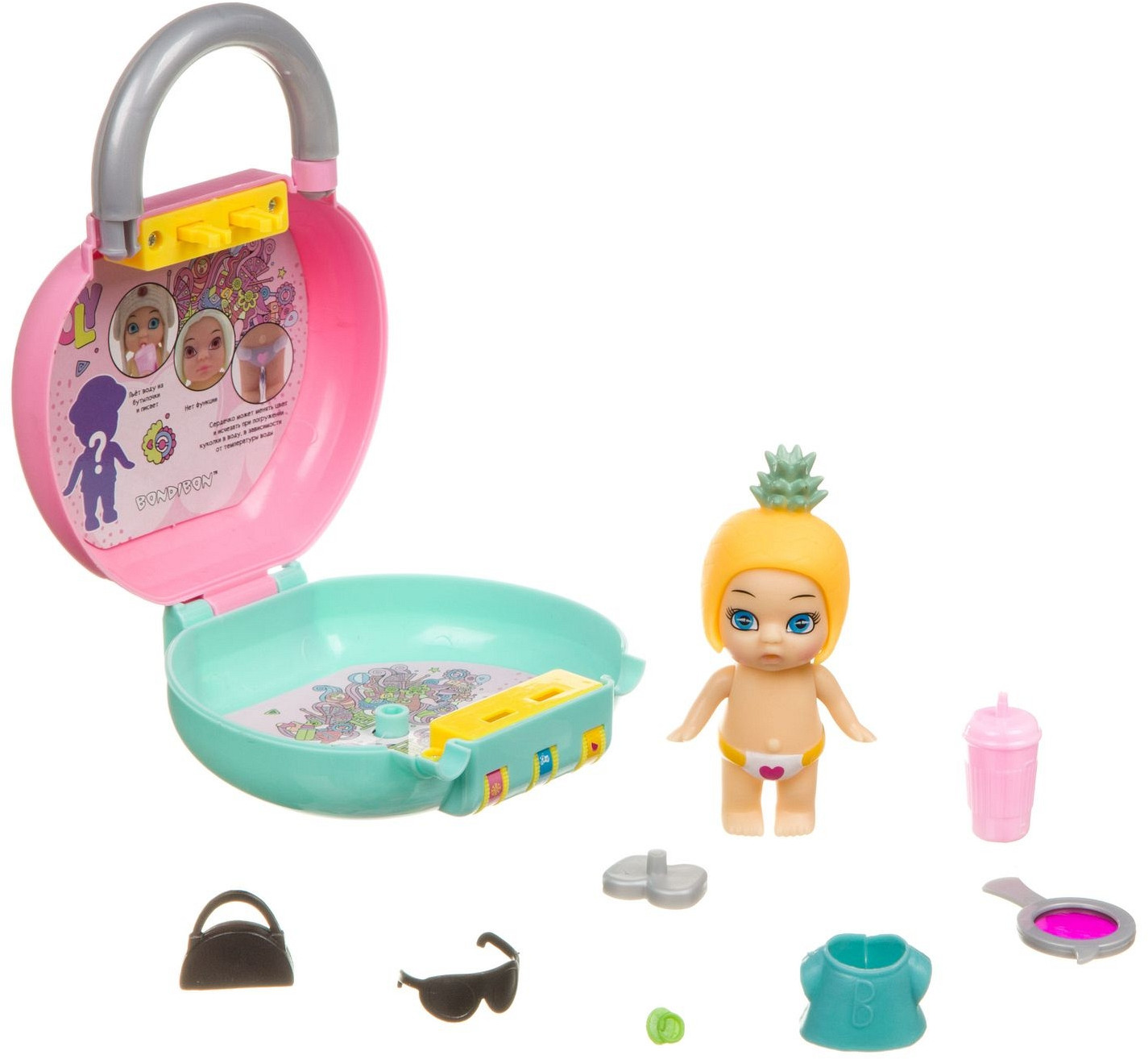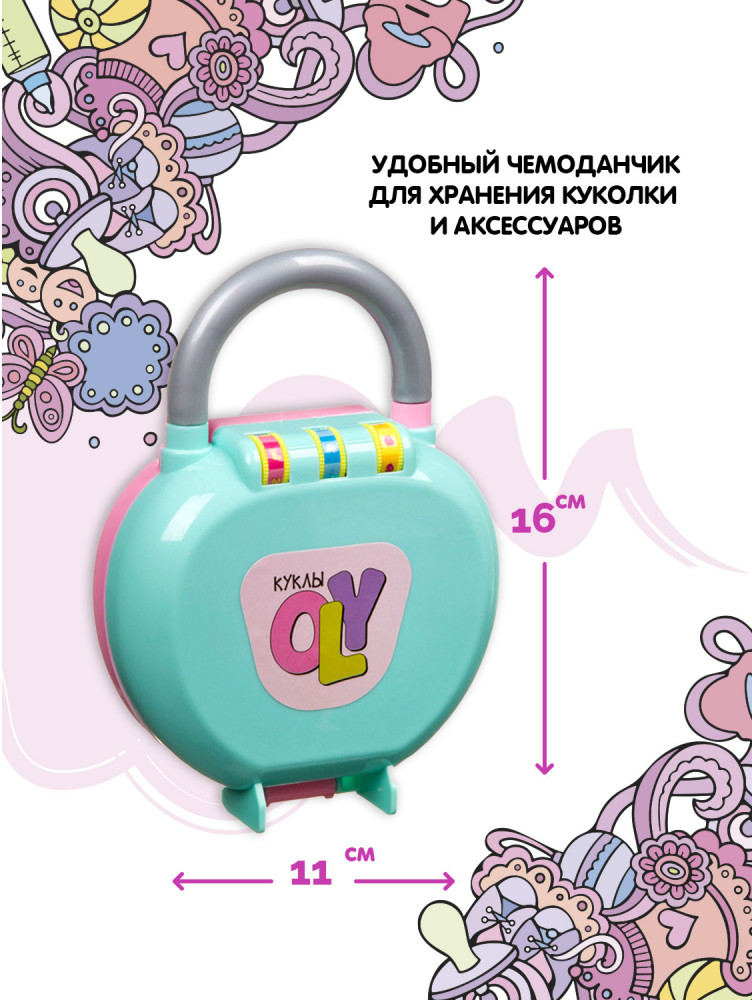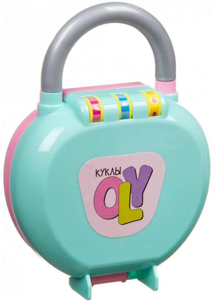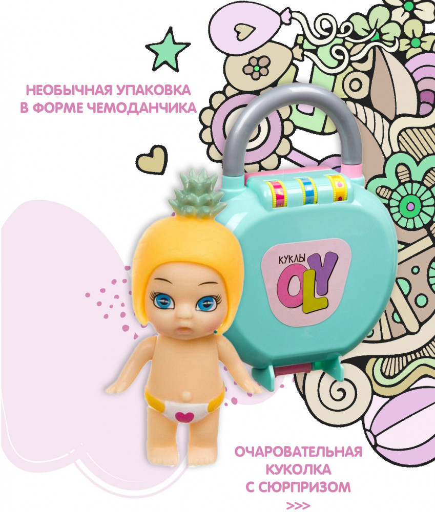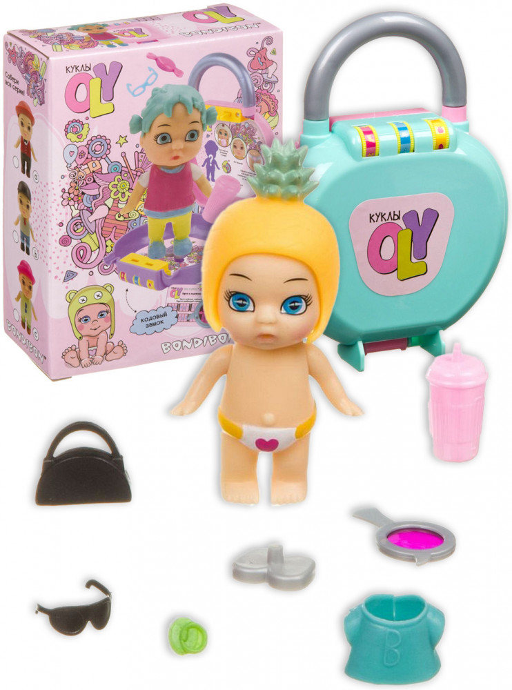 Куколка OLY с шапочкой в виде ананаса и аксессуарами в чемодане с кодовом замком.