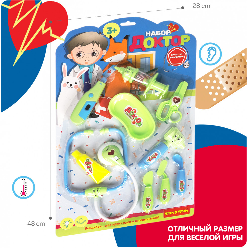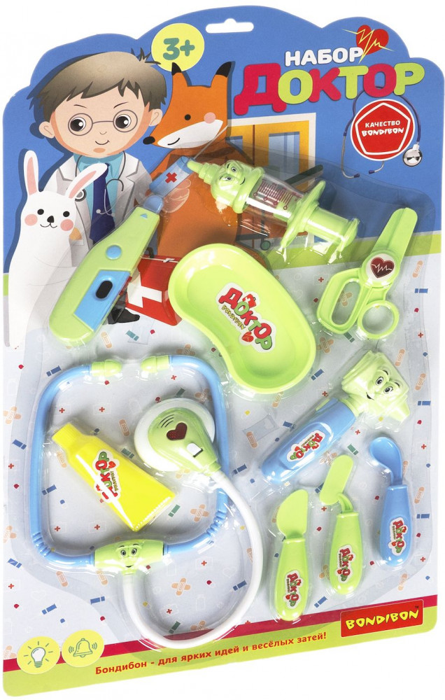 Bondibon Набор игровой «Доктор»В данный момент этот товар отсутствует в продаже. Возможно, у нас найдется аналогичный или похожий товар здесь. Даже игрушки иногда болеют. Предложите ребенку побывать на месте врача и полечить свои игрушки. Замечательный игровой набор «Доктор» от «Bondibon» поможет ребенку почувствовать себя настоящим доктором и понять важность профессии. А еще получится максимально снизить тревожность малыша и показать ему, что врач — это человек, который помогает людям, лечит их и желает исключительно добра. Со временем малыш перестанет бояться визитов в больницу. Сюжетно-ролевая игра «Доктор» нравится мальчикам и девочкам. Ведь с игровым набором можно легко вылечить заболевшие игрушки, измерить им температуру или сделать укол. А световые и звуковые эффекты создадут подходящую игровую атмосферу. |