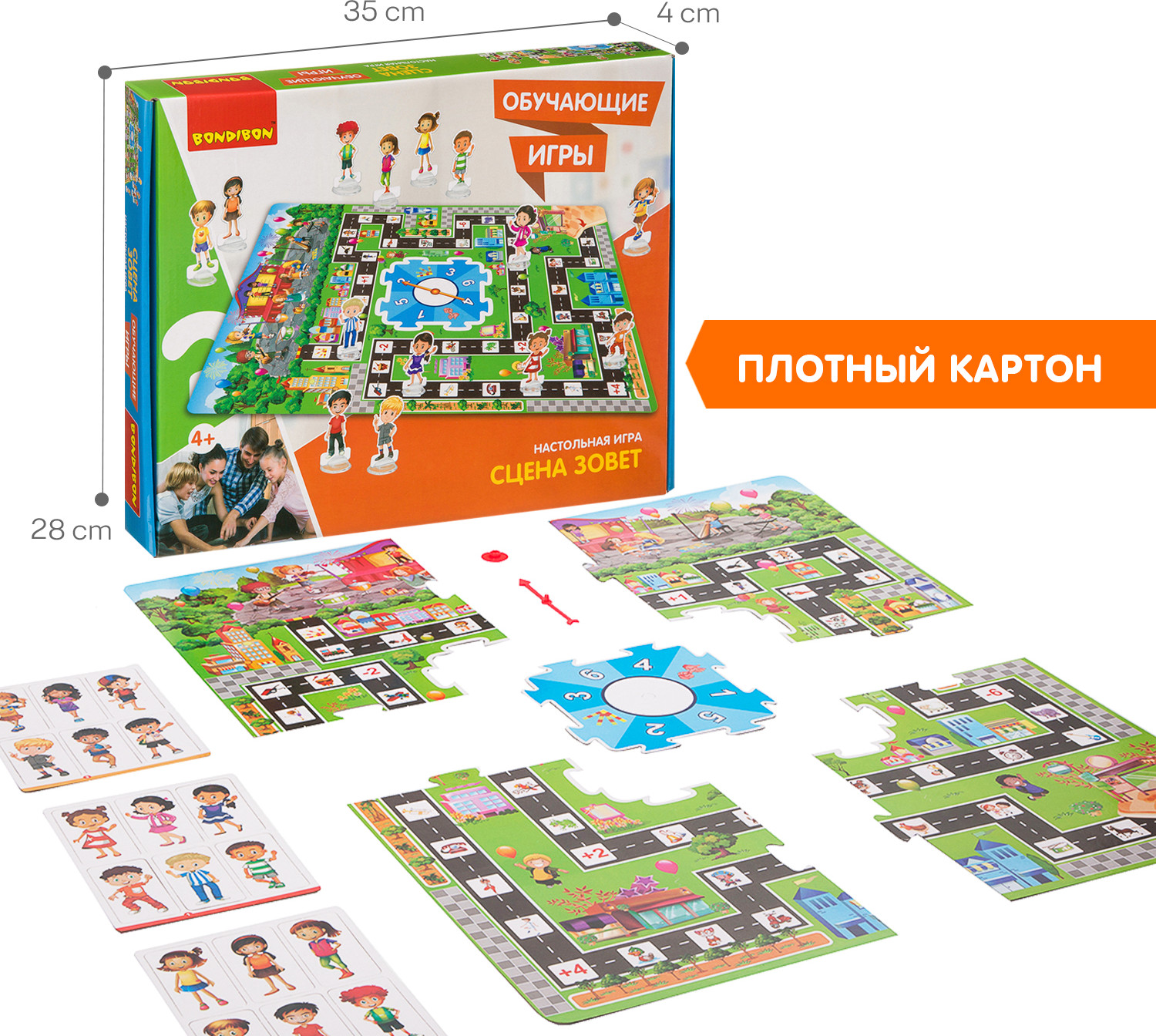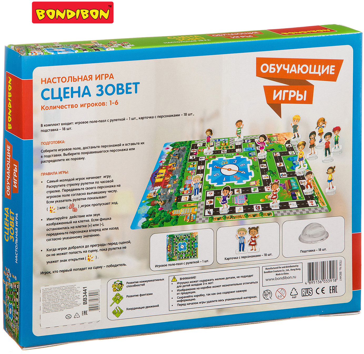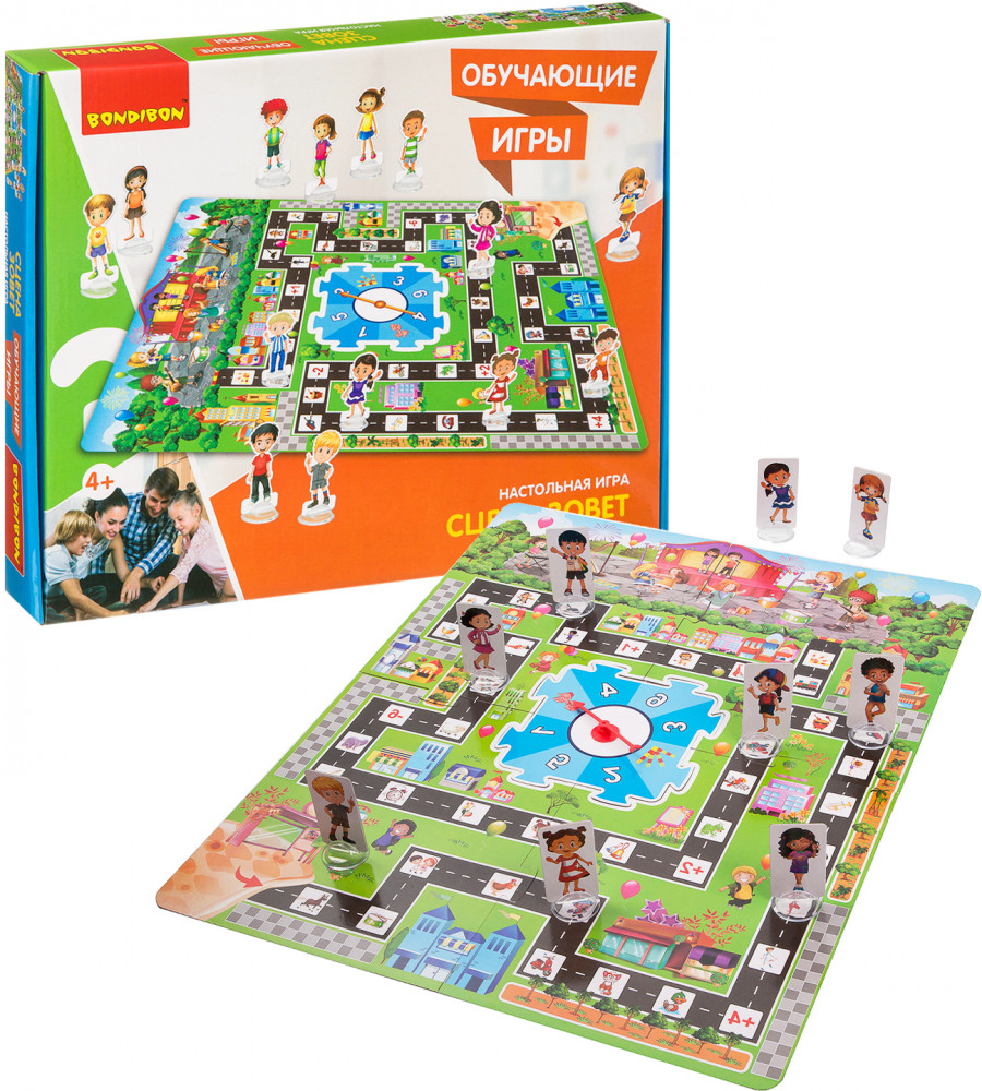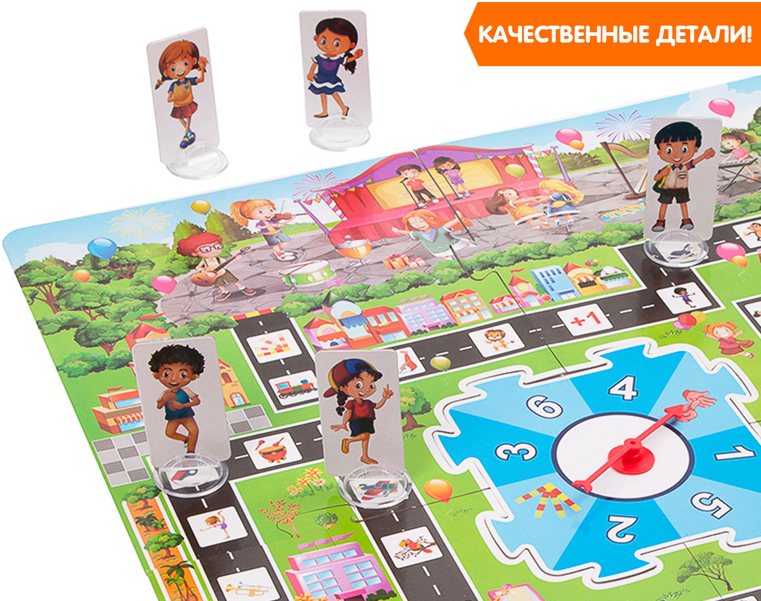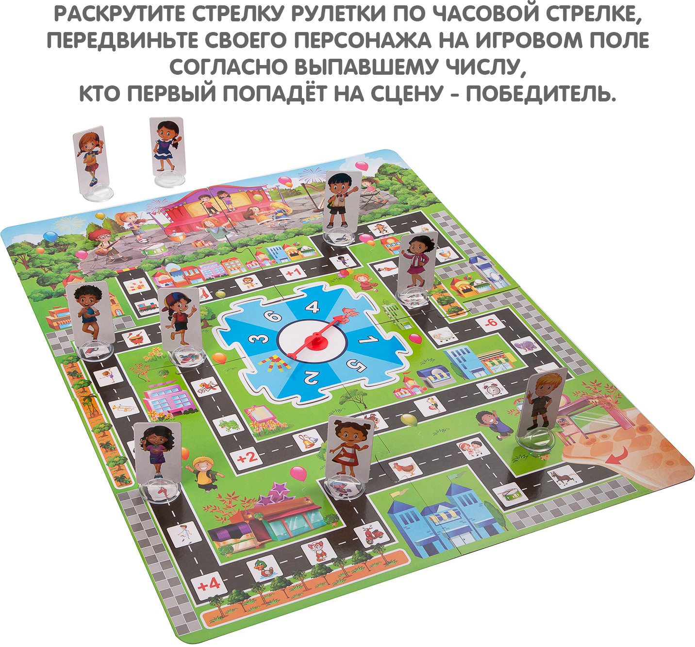 Серия: Обучающие игры Соберите игровое поле, достаньте персонажей и вставьте их в подставки. Выберите понравившегося персонажа и распределите их поровну. Самый молодой игрок начинает игру. Раскрутите стрелку рулетки по часовой стрелке. Передвиньте своего персонажа на игровом поле согласно выпавшему числу. Имитируйте действие или звук изображенный на клетке. Если фишка остановилась на клетке (+) или (-), передвиньте персонажа вперед или назад согласно указанному значению. Когда игрок добрался до преграды перед сценой, он не может попасть на сцену, пока рулетка не укажет знак открытия. Игрок, кто первый попадет на сцену — победитель. Игра направлена на развитие коммуникативных способностей, фантазии, координации движения. |