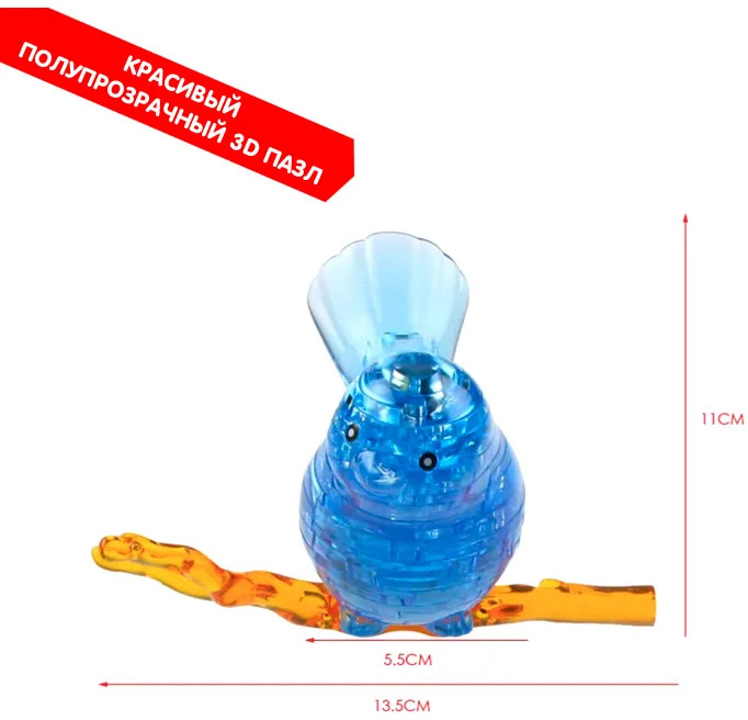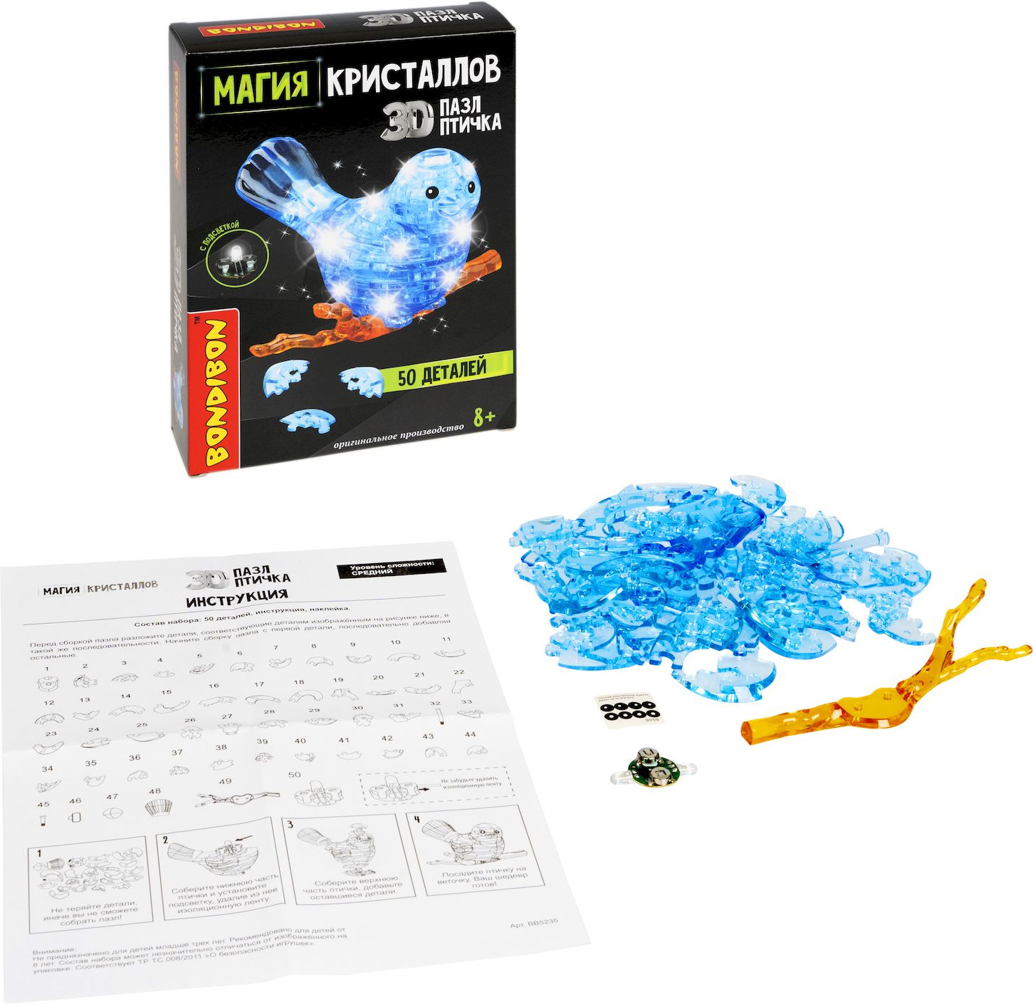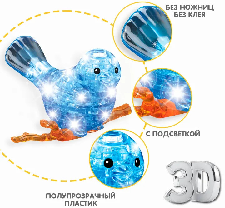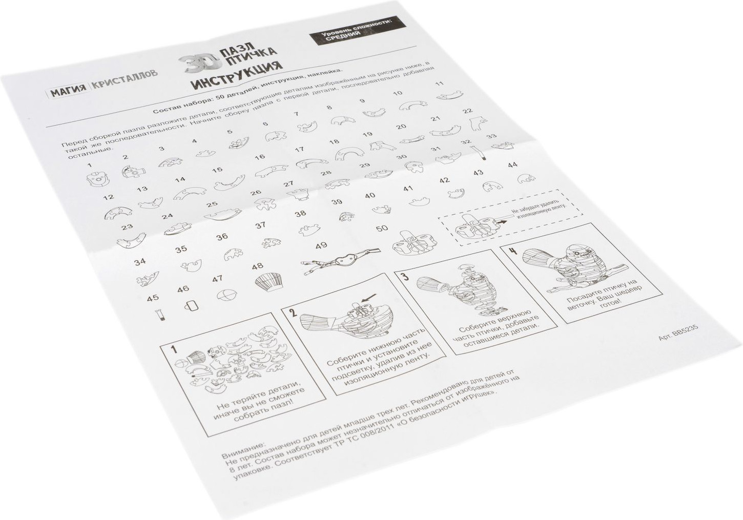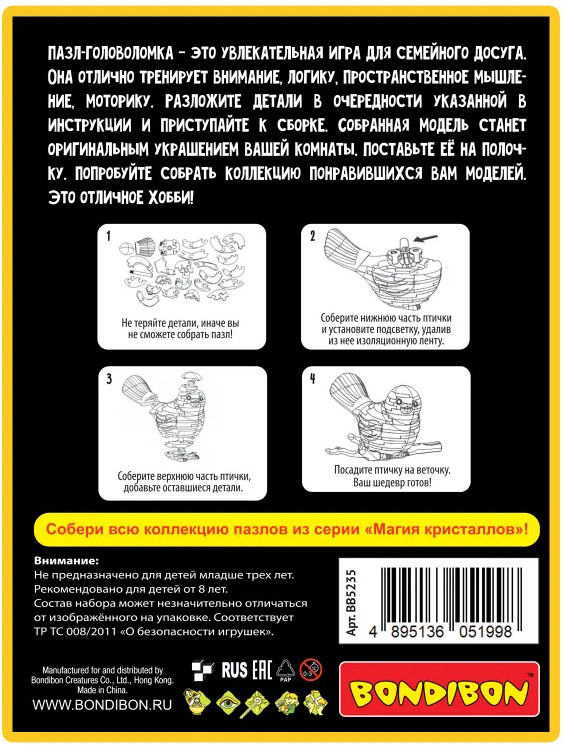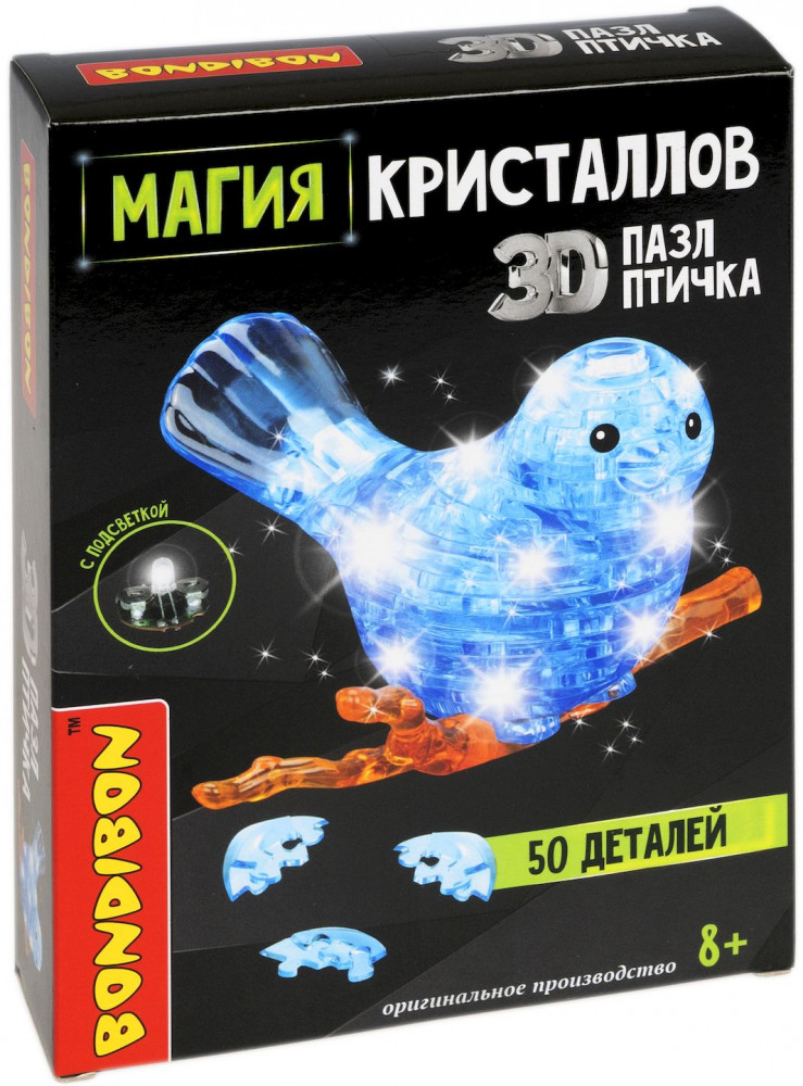 Пазл 3D «Птичка» с подсветкой из серии «Магия кристаллов» Bondibon — это необычный набор с полупрозрачными деталями, с помощью которых можно создать фигуру в виде кристалла. Процесс сборки отлично развивает логику, пространственное мышление, внимание и мелкую моторику. Собирать можно как самостоятельно, так и всей семьей — так будет даже интереснее! Разложите детали в порядке, который указан в инструкции и начинайте скреплять их — вам не понадобятся ни ножницы, ни клей. В комплекте 50 деталей, в том числе деталь-подсветка с двумя батарейками AG13. Попробуйте собрать пазл без инструкции — процесс будет дольше, но интереснее!