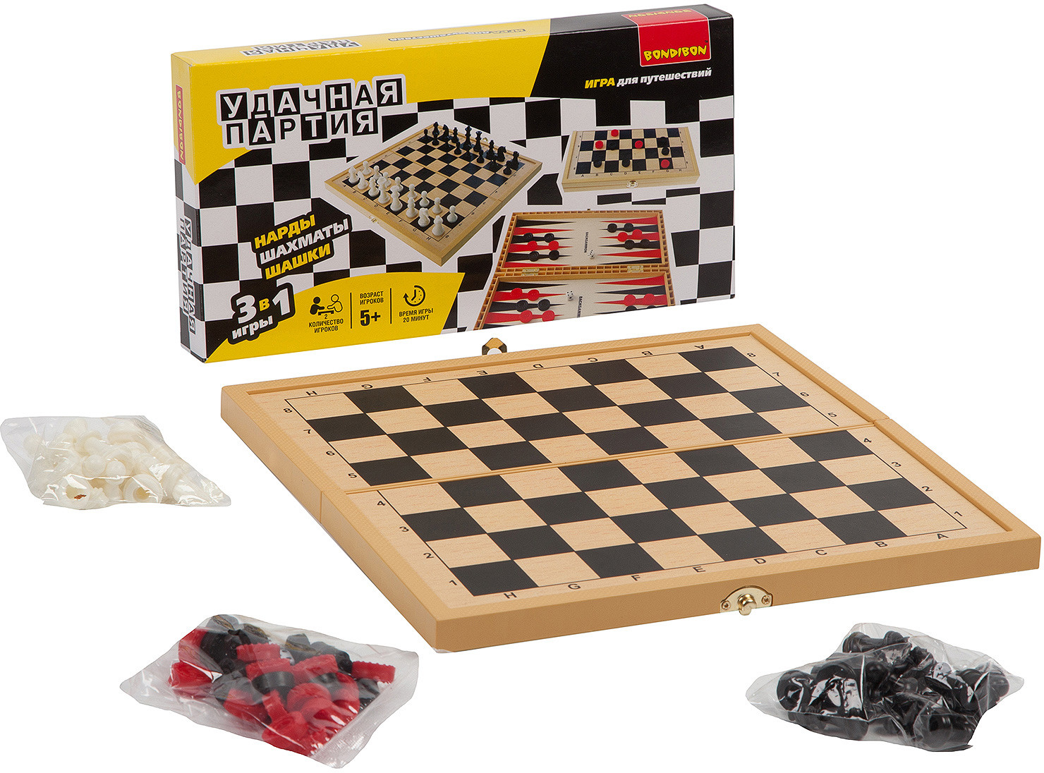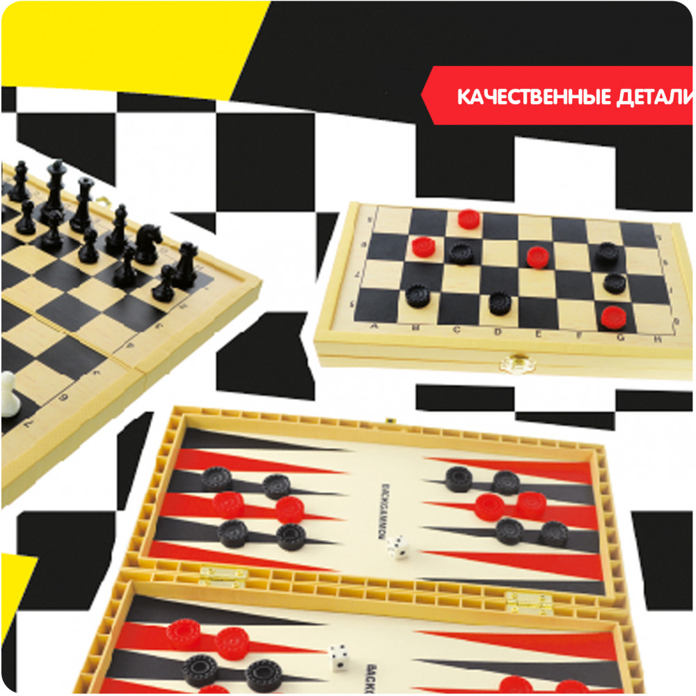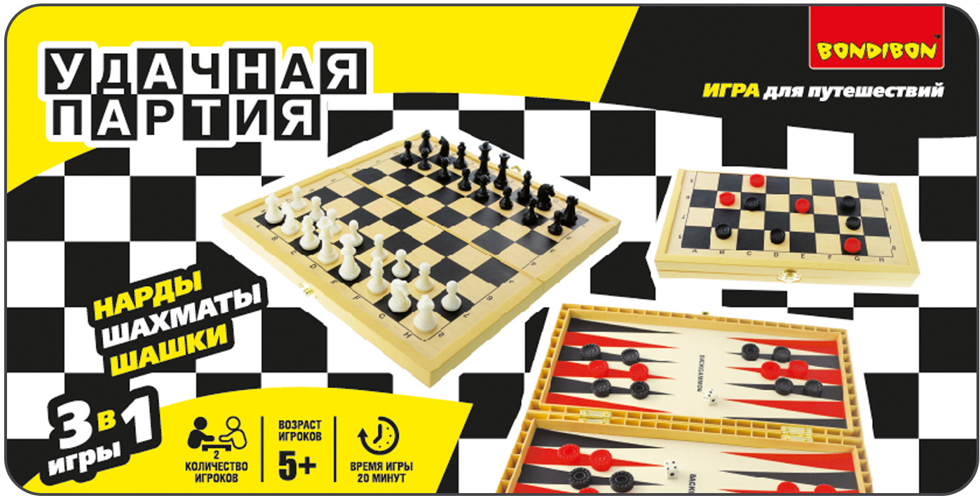 Bondibon Набор настольных игр «Шашки, шахматы, нарды»В данный момент этот товар отсутствует в продаже. Возможно, у нас найдется аналогичный или похожий товар здесь. Серия: Удачная партия Вы не знаете, как скоротать длинную дорогу в поезде, что взять с собой на пляж, чтобы не грустить или как скоротать вечер-другой в непогоду на даче? Отличный вариант — набор «Удачная партия», в котором есть сразу несколько самых популярных настольных игр всех времен и народов — шахматы, шашки, нарды. Есть шахматная доска, размер которой можно выбрать (в разных наборах он разный, в данном наборе ширина доски 30 см). А для удобства шашки, фишки и шахматные фигуры сделаны на магнитиках, они не растеряете на свежем воздухе или в дороге. Вечные ценности в одном комплекте, это ли не мечта интеллектуала? |