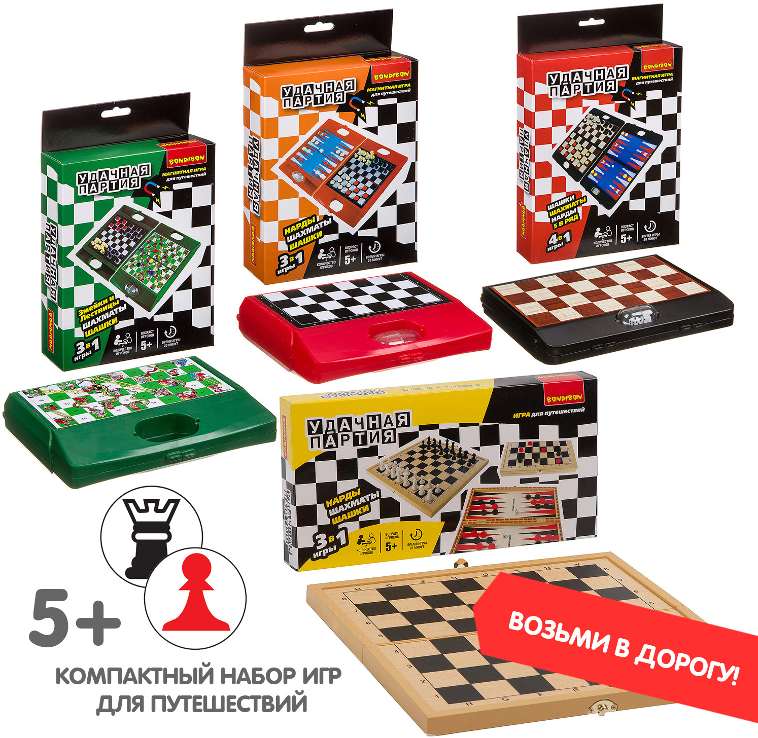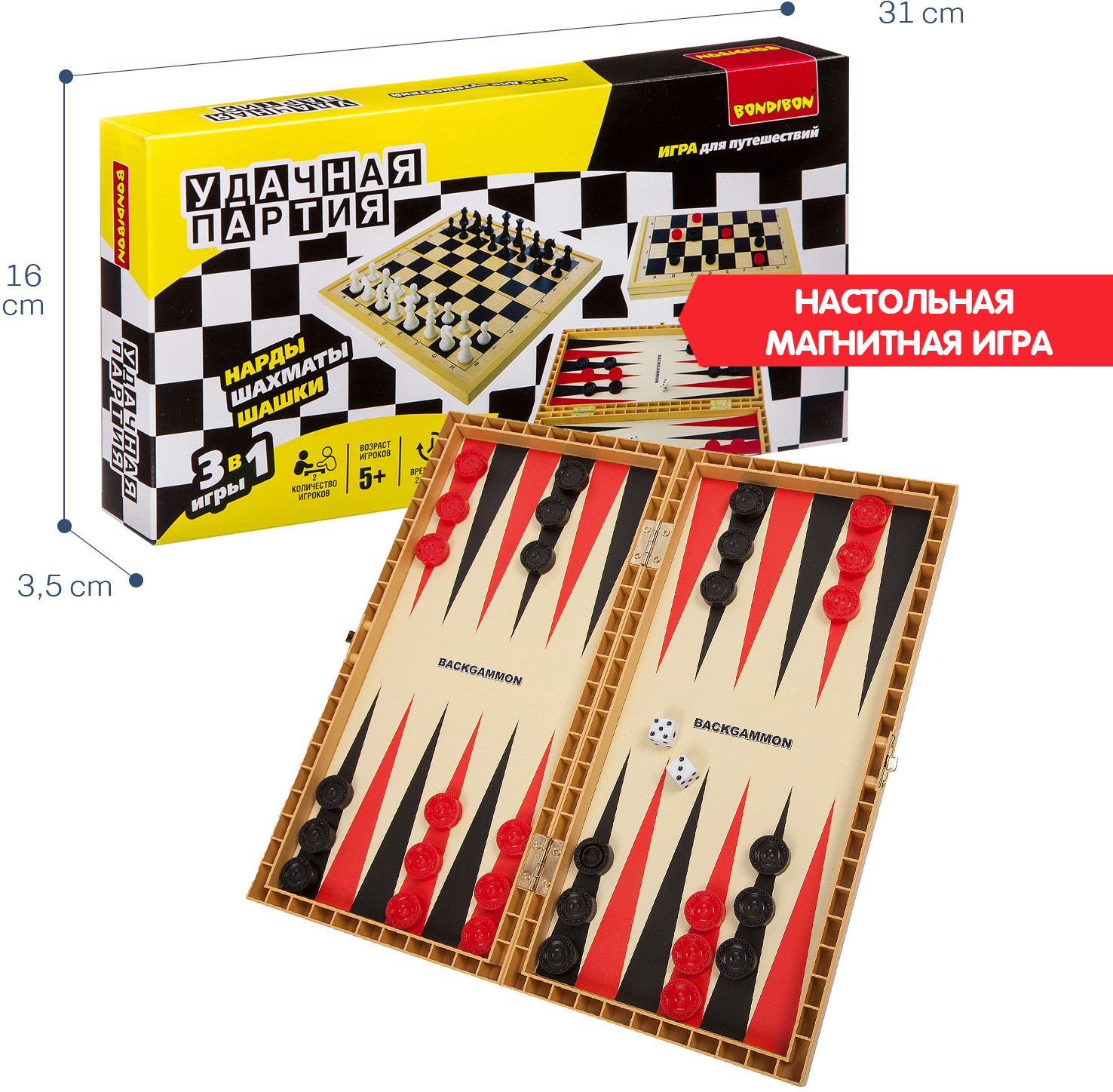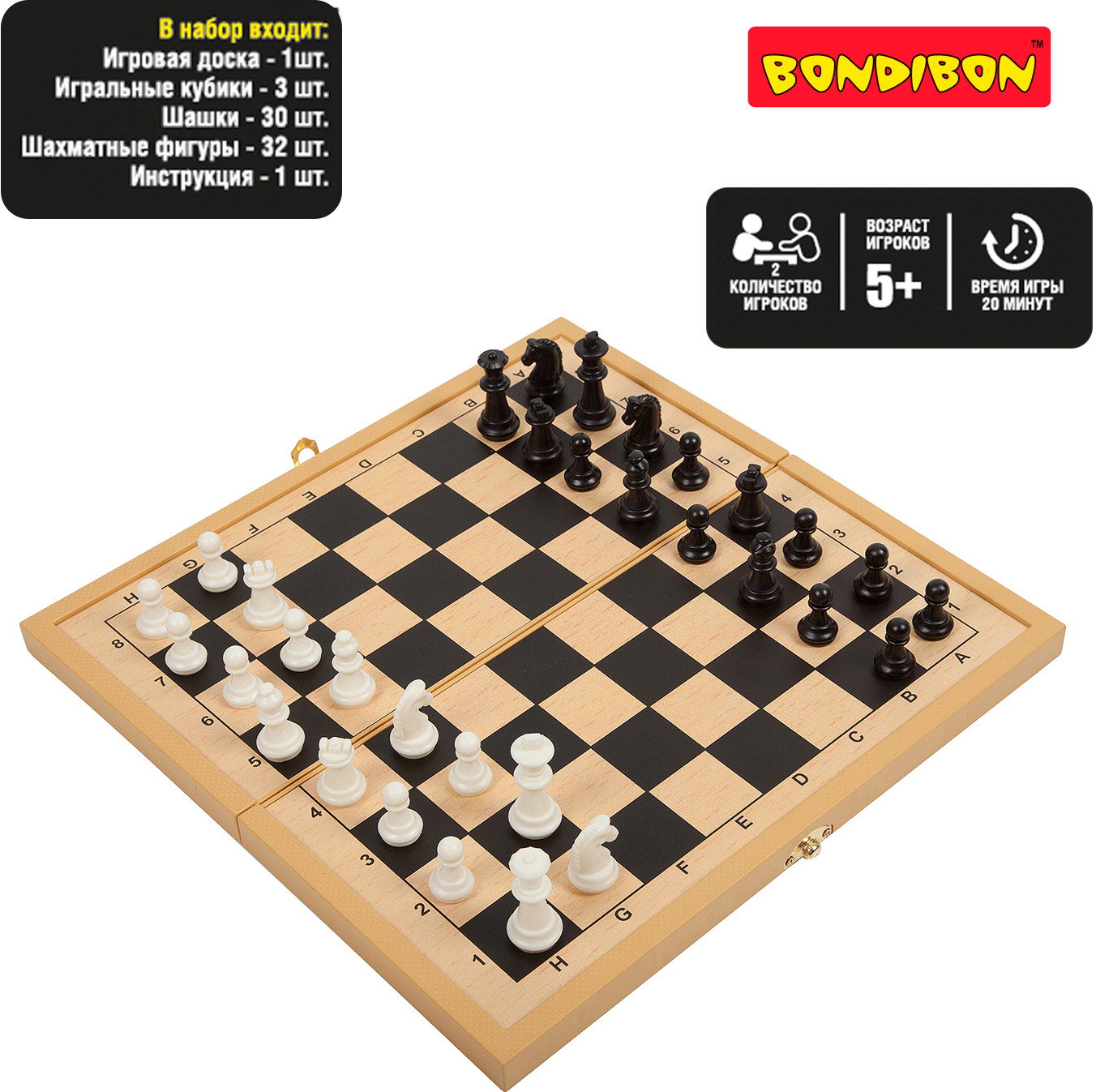 Bondibon Набор настольных игр «Шашки, шахматы, нарды»В данный момент этот товар отсутствует в продаже. Возможно, у нас найдется аналогичный или похожий товар здесь. Серия: Удачная партия Вы не знаете, как скоротать длинную дорогу в поезде, что взять с собой на пляж, чтобы не грустить или как скоротать вечер-другой в непогоду на даче? Отличный вариант — набор «Удачная партия», в котором есть сразу несколько самых популярных настольных игр всех времен и народов — шахматы, шашки, нарды. Есть шахматная доска, размер которой можно выбрать (в разных наборах он разный, в данном наборе ширина доски 30 см). А для удобства шашки, фишки и шахматные фигуры сделаны на магнитиках, они не растеряете на свежем воздухе или в дороге. Вечные ценности в одном комплекте, это ли не мечта интеллектуала? |