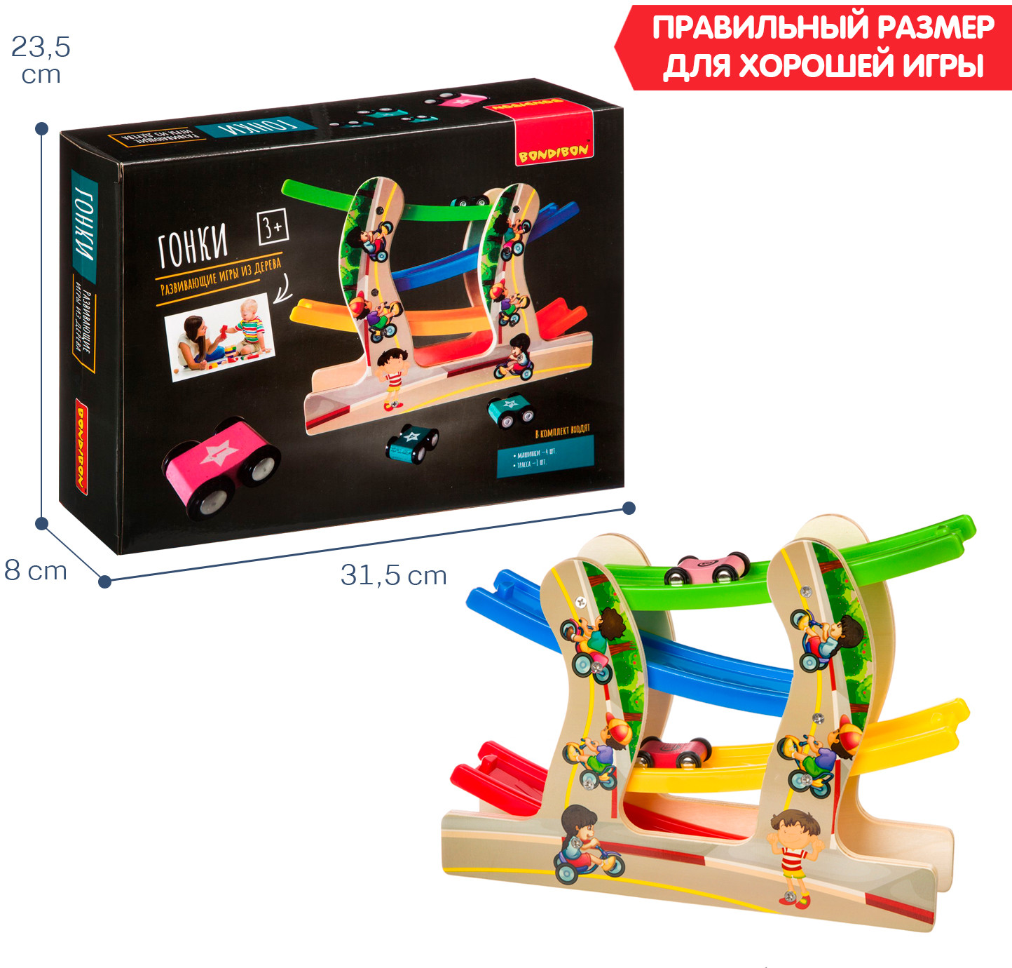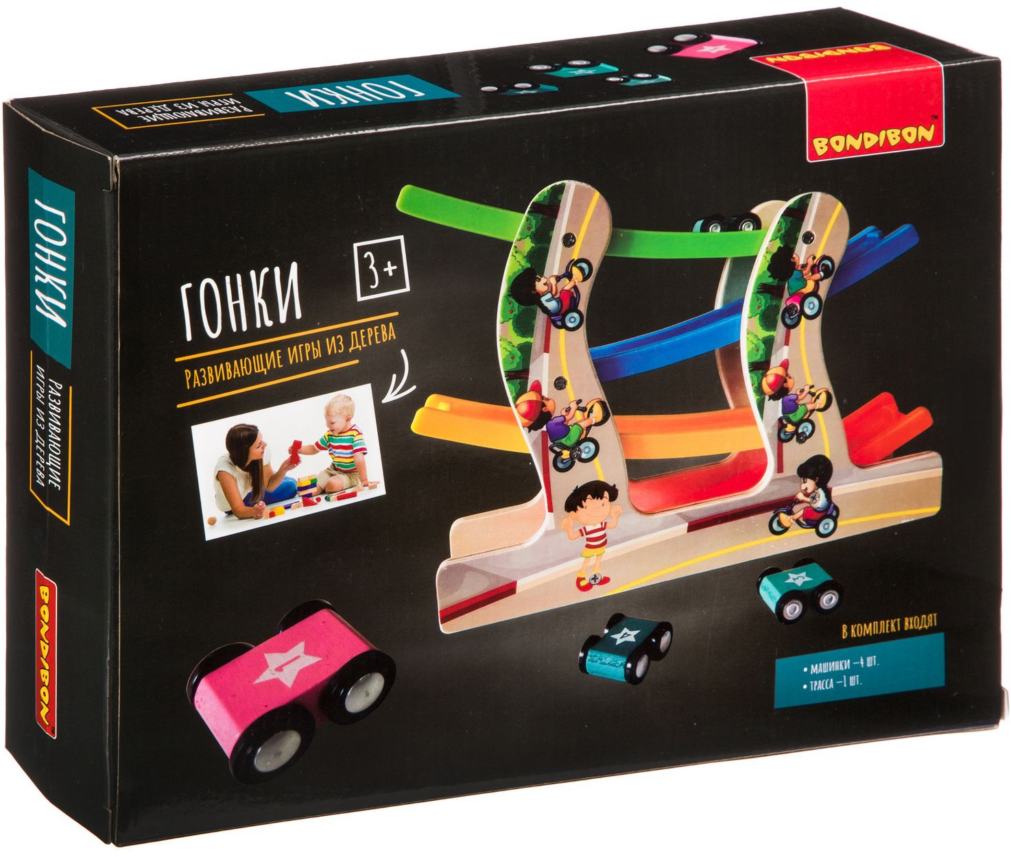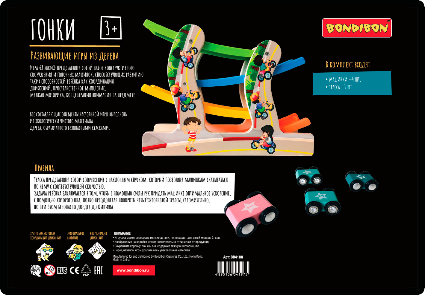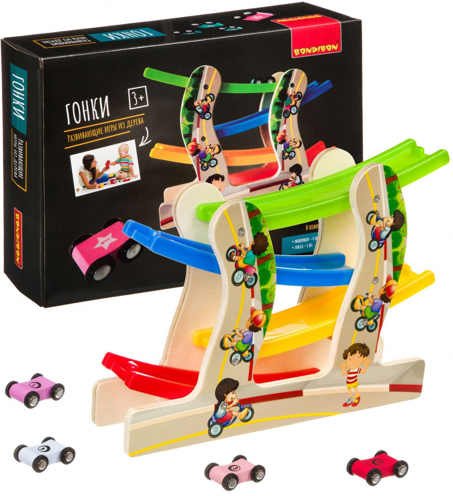 Игра «Гонки» представляет собой набор конструктивного сооружения и гоночных машинок, способствующих развитию таких способностей ребёнка как координация движений, пространственное мышление, мелкая моторика, концентрация внимания на предмете. Трасса представляет собой сооружение с наклонным спуском, который позволяет машинкам скатываться по нему с соответствующей скоростью. Задача игрока заключается в том, чтобы с помощью силы рук придать машинке оптимальное ускорение, с помощью которого она, ловко преодолевая повороты четырёхуровневой трассы, стремительно, но при этом безопасно доедет до финиша. |