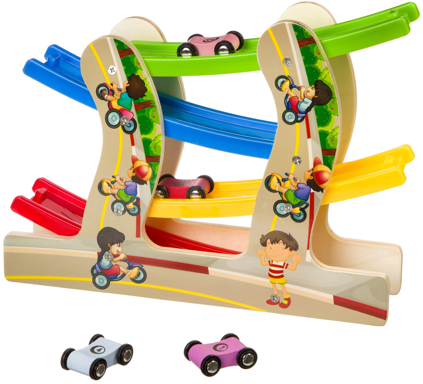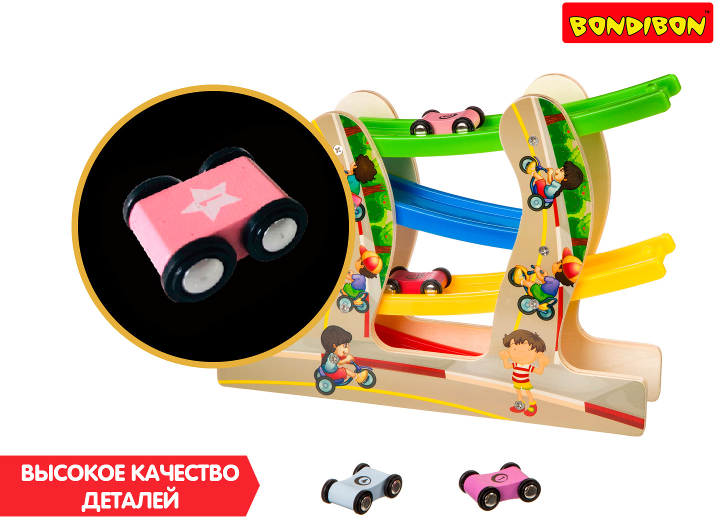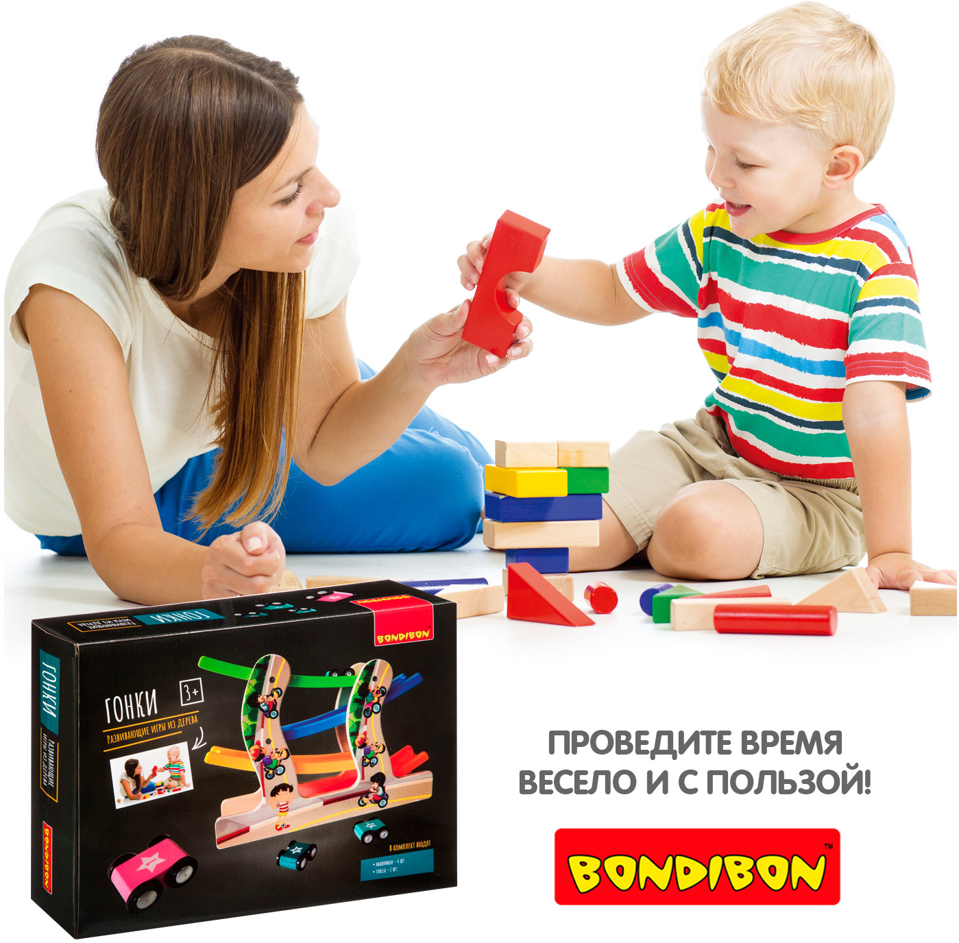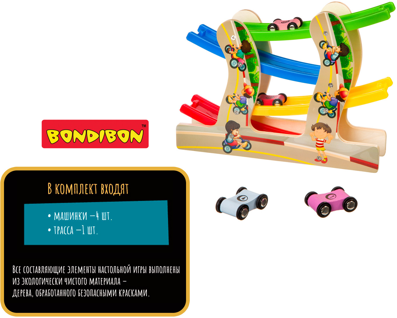 Игра «Гонки» представляет собой набор конструктивного сооружения и гоночных машинок, способствующих развитию таких способностей ребёнка как координация движений, пространственное мышление, мелкая моторика, концентрация внимания на предмете. Трасса представляет собой сооружение с наклонным спуском, который позволяет машинкам скатываться по нему с соответствующей скоростью. Задача игрока заключается в том, чтобы с помощью силы рук придать машинке оптимальное ускорение, с помощью которого она, ловко преодолевая повороты четырёхуровневой трассы, стремительно, но при этом безопасно доедет до финиша. |