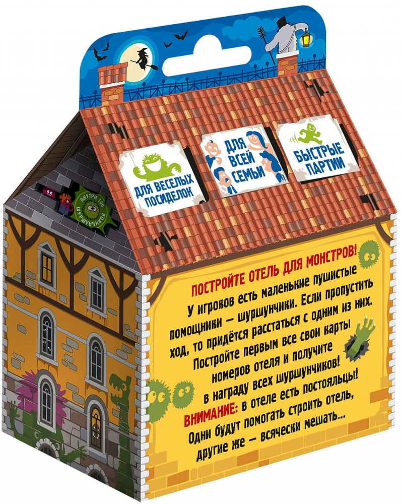 💳 Оплатить за товар можно при получении 🇰🇿 Есть бесплатная доставка по Казахстану от 1 дня 🎁 Копите бонусы с каждой покупки Игроки помогают графу Дракуле строить отель для монстров. Каждый участник получает карты номеров отеля, которые предстоит построить. У каждого игрока есть шуршунчики — маленькие пушистые помощники. Если игрок не добавит к отелю новых карт в свой ход, то ему придется отправить одного шуршунчика к Дракуле за новой картой. Карту игрок получит, а вот шуршунчик останется у Дракулы до конца партии. Первый игрок, кто «отстроит» все имеющиеся на руках карты, побеждает и получает от Дракулы всех собранных шуршунчиков. А чем больше шуршунчиков, тем лучше! |