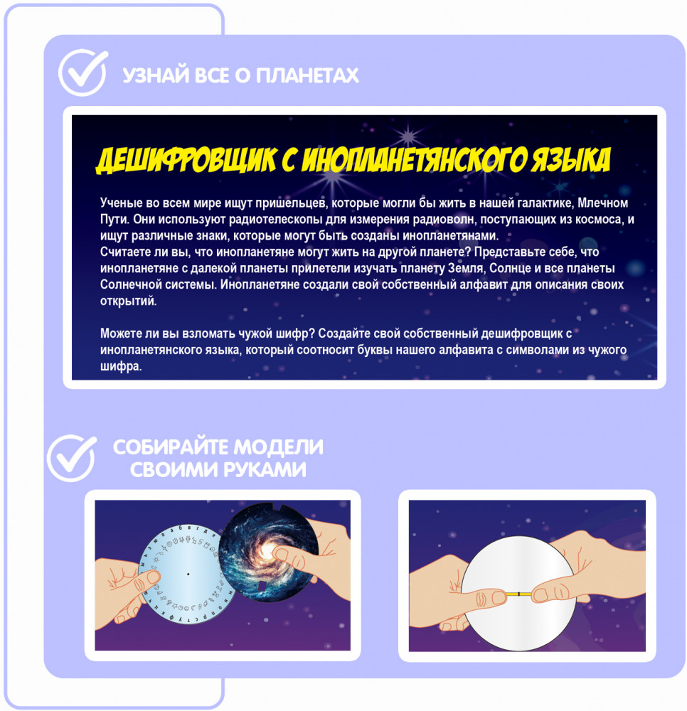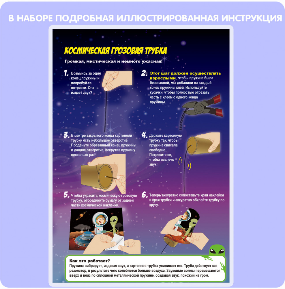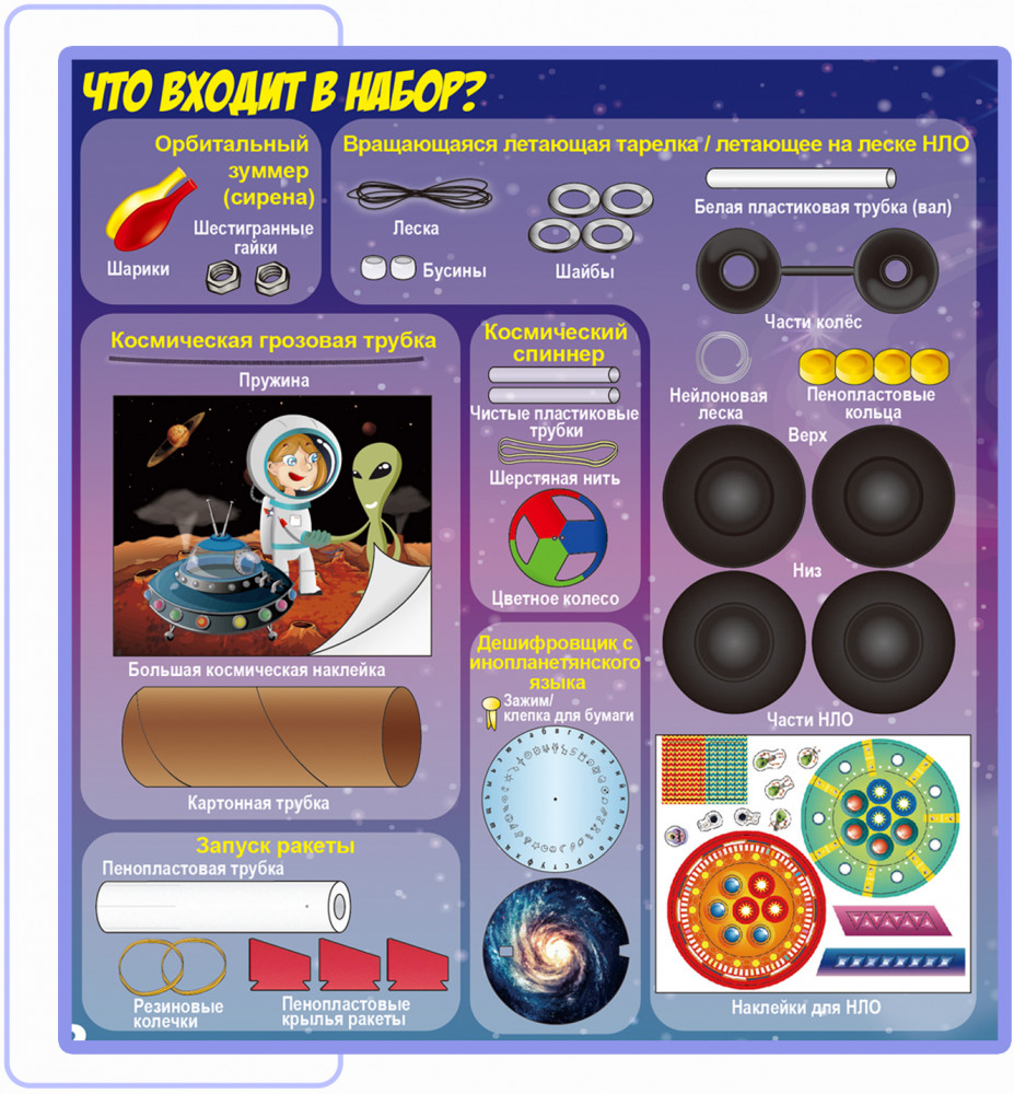 Серия: Науки с Буки. Французские опыты Космическая лаборатория — это настоящий подарок для будущих покорителей неизведанных звездных глубин! А как известно, ко всему великому надо готовиться заранее, поэтому с этим набором могут работать дети, начиная с 6 лет. В лаборатории есть всё, чтобы запустить ракету в открытый космос, собрать орбитальный зумер, космический спиннер и вращающийся НЛО, сделать дешифровщик с инопланетянского языка, и многое-многое другое! |