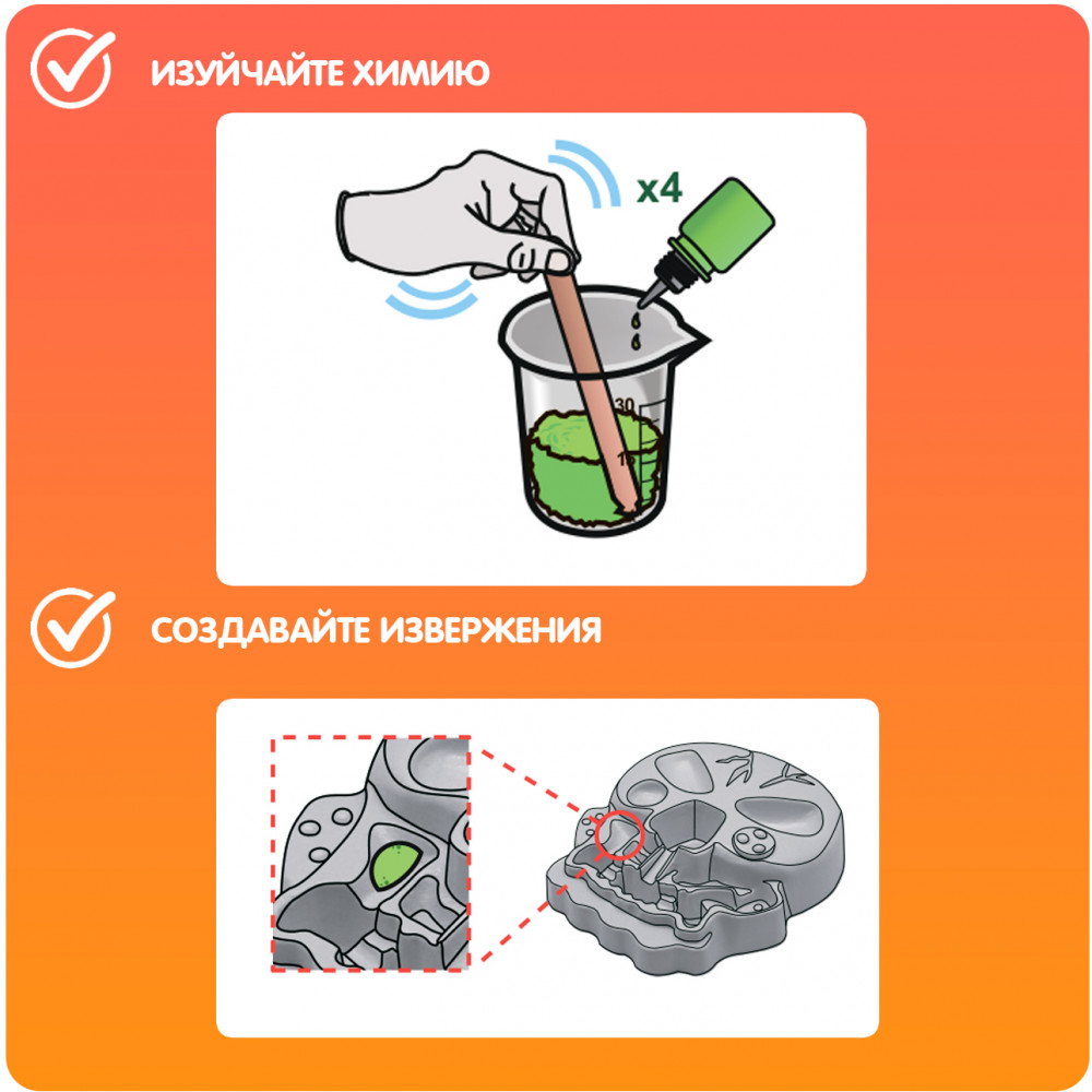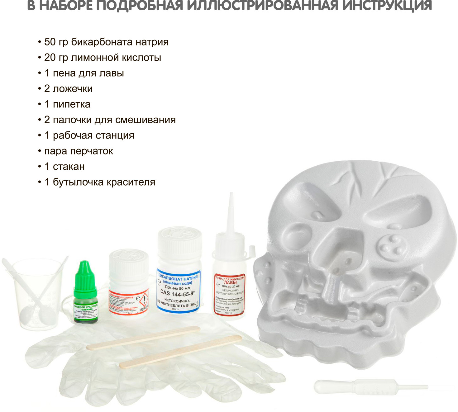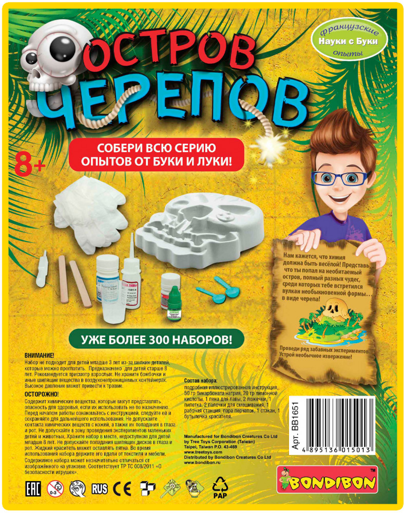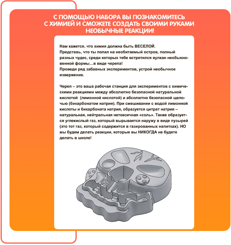 Серия: Науки с Буки. Французские опыты Этот научно-познавательный набор поможет развить у ребёнка интерес к такой увлекательной науке, как химия. Представьте, что Вы попали на необитаемый остров, полный разных чудес, среди которых встретился вулкан необыкновенной формы в виде черепа! С его помощью можно узнать про реакции щелочей и кислот, углекислый газ и различные спецэффекты, провести ряд забавных экспериментов, устроить необычное извержение! В состав набора входят |