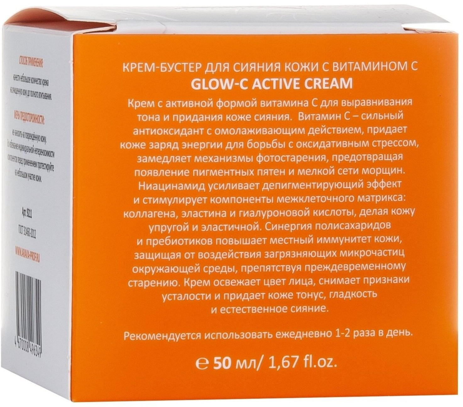 Aravia Крем-бустер для сияния кожи «Glow-C Active Cream»-25% +46 быстро впитывается матирует увлажняет питает
