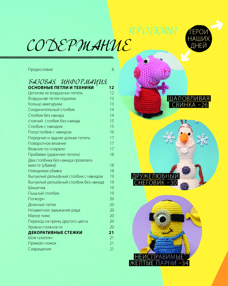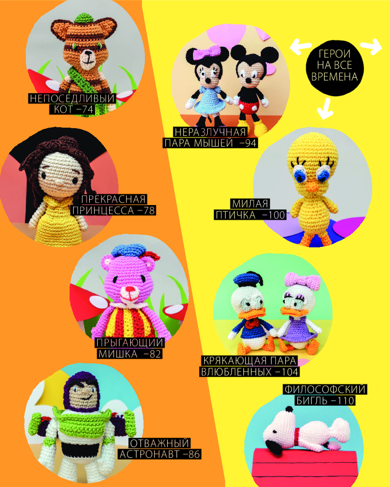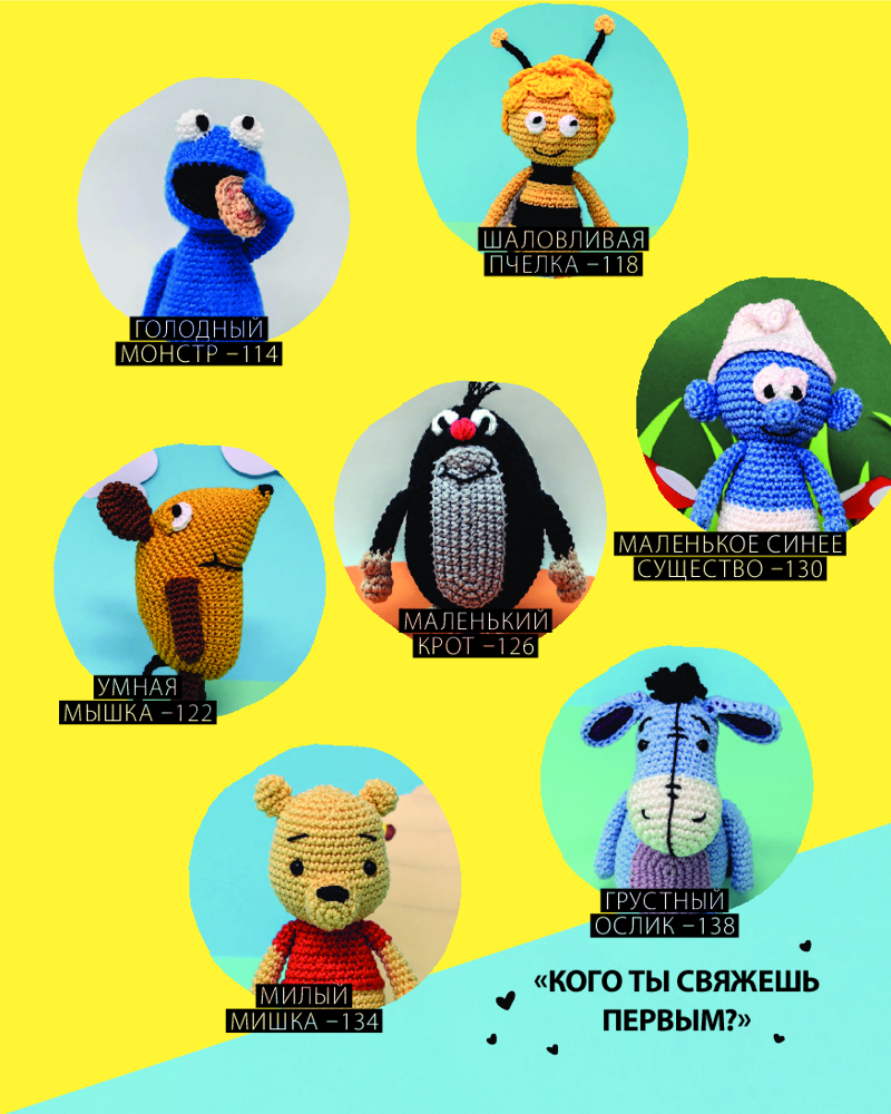 Описание основных петель и техник, условные обозначения, инструкции по выбору пряжи и крючка — все это поможет связать любимого персонажа даже новичку! Размеры готовых амигуруми — от 9,5 см до 18 см! |
