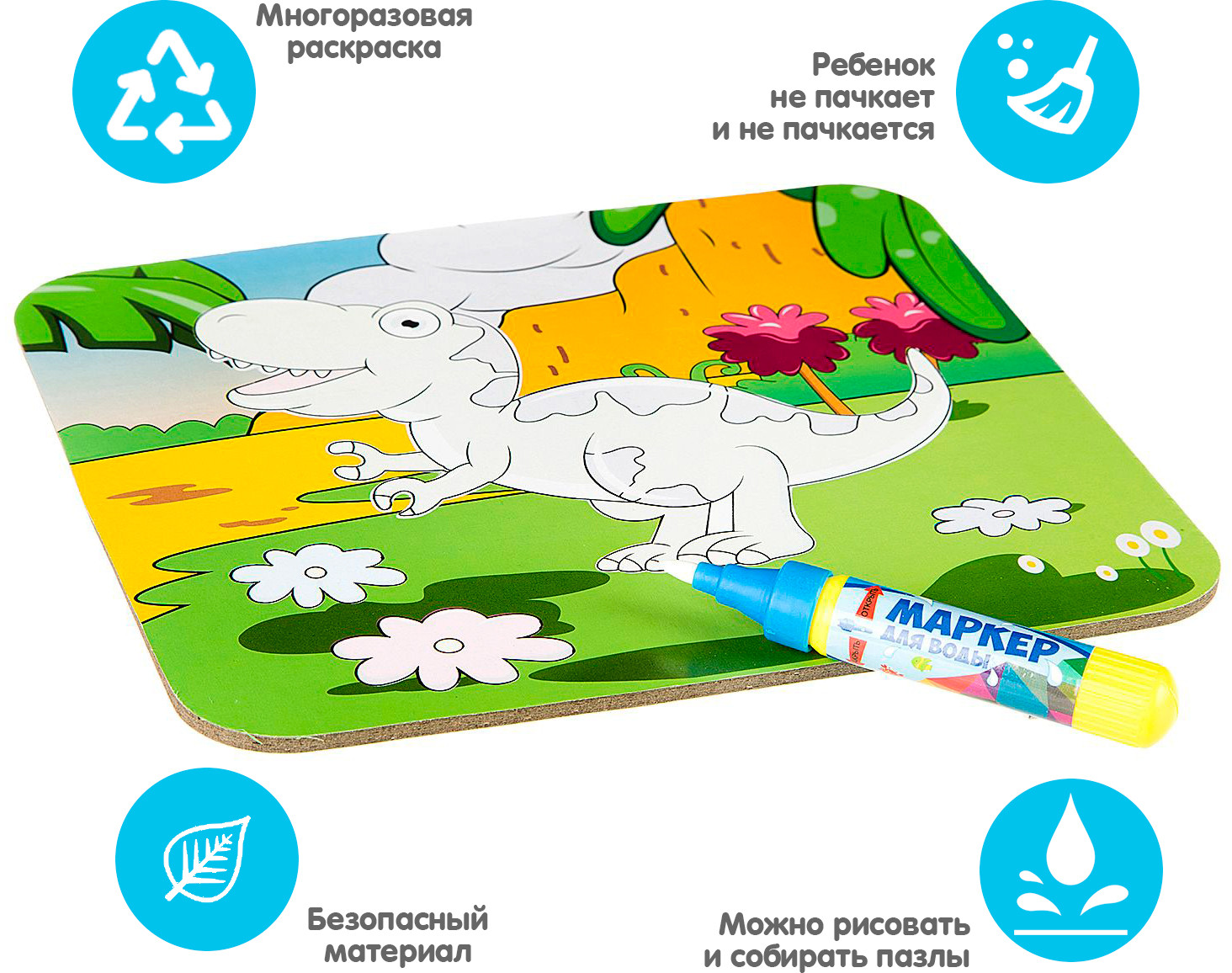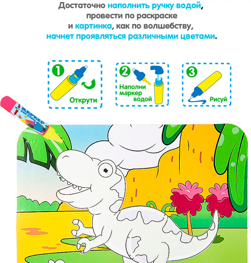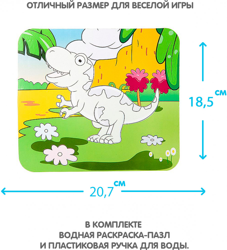 Bondibon Раскраска-пазл многоразовая «Тираннозавр»В данный момент этот товар отсутствует в продаже. Возможно, у нас найдется аналогичный или похожий товар здесь. Серия: Baby You Многоразовая водная раскраска-пазл — замечательный набор 2 в 1. Водная раскраска послужит увлекательным занятием для юных начинающих художников, даже для тех, кто еще совсем не умеет рисовать. Достаточно наполнить ручку водой и провести по стороне раскраске, и картинка, как по волшебству, начнет проявляться различными цветами. После высыхания картинка опять становится бесцветной, и ребенок снова может творить. После рисования можно перевернуть картинку на другую сторону и собрать пазл. В комплект входит пластиковая ручка для воды. |