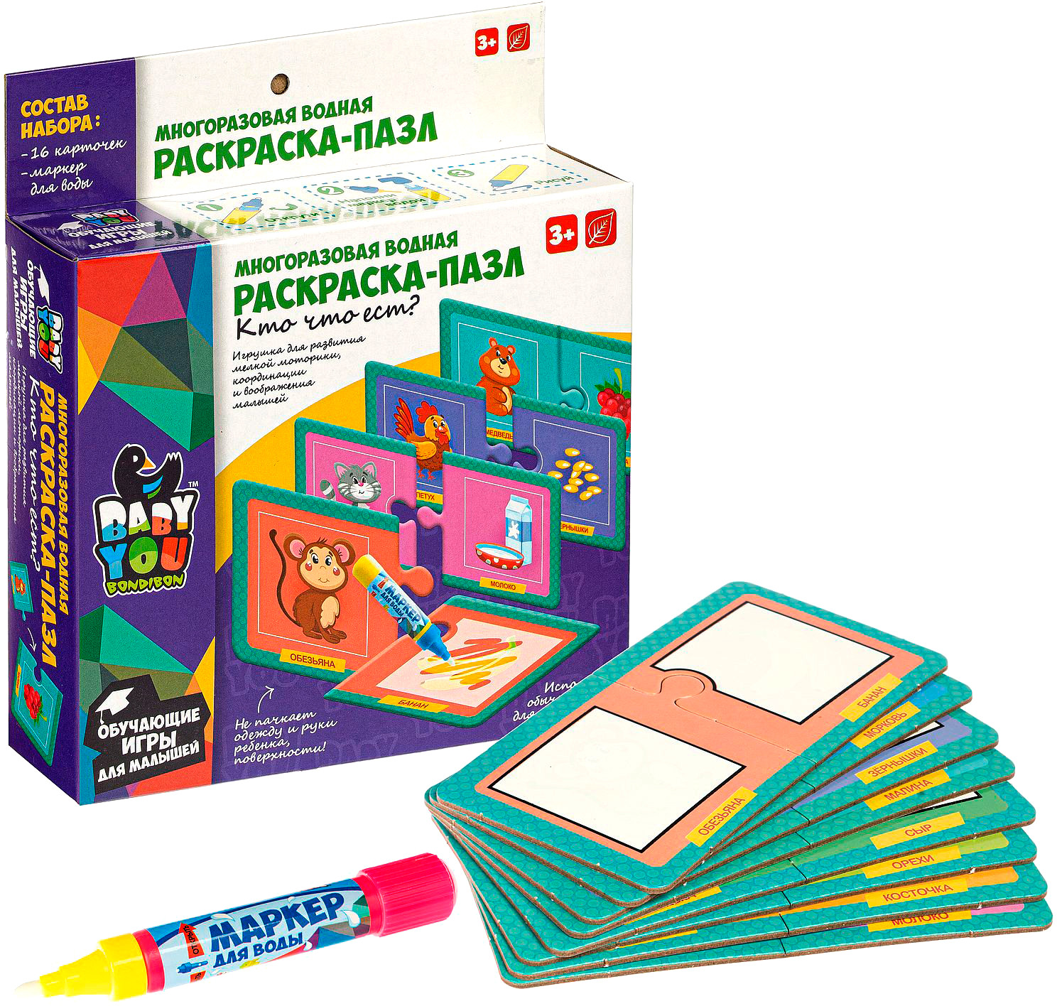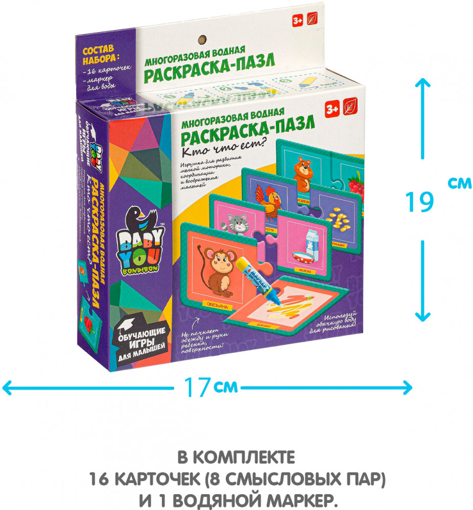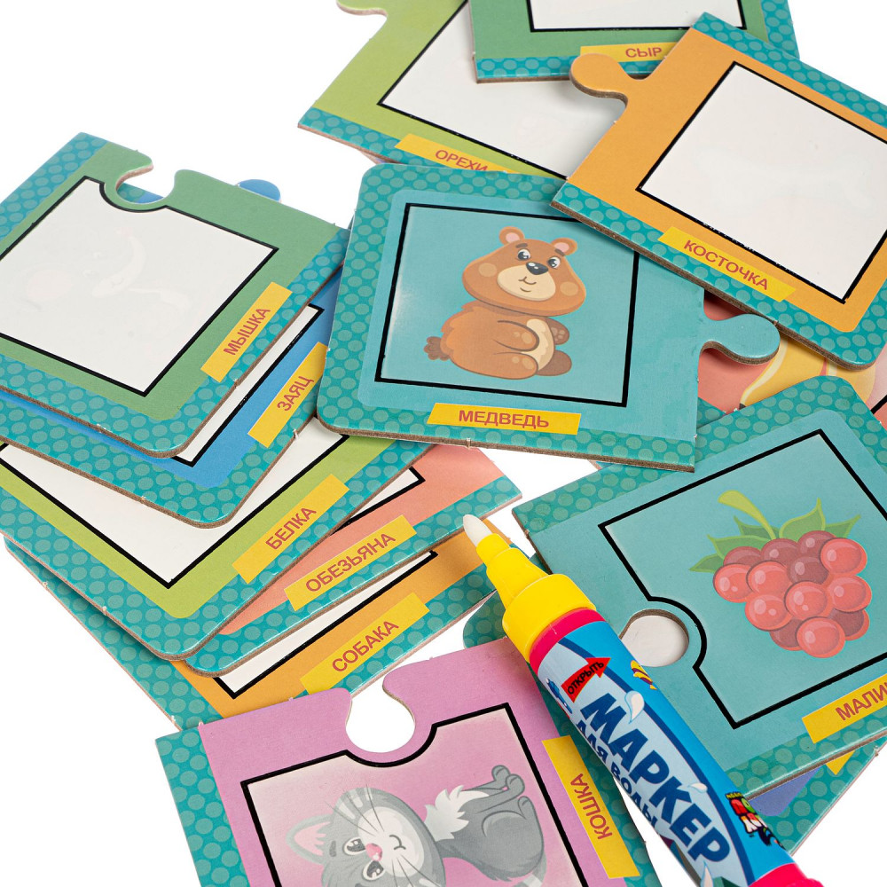 Но это ещё не всё! Ребёнку нужно подобрать каждой картинке соответствующую картинку по форме и по смысловому значению, как в играх лото. Ребенок изучит животных, и что они едят. Для рисования можно использовать обычную воду, маркер не пачкает одежду и руки ребенка.
