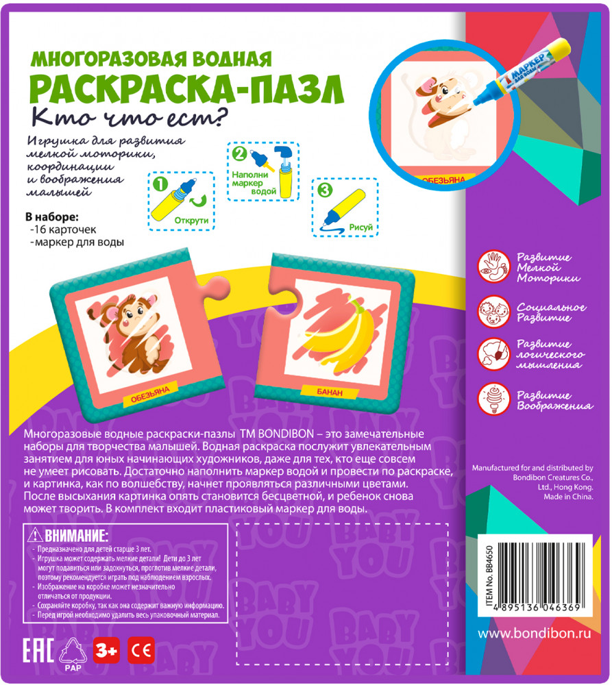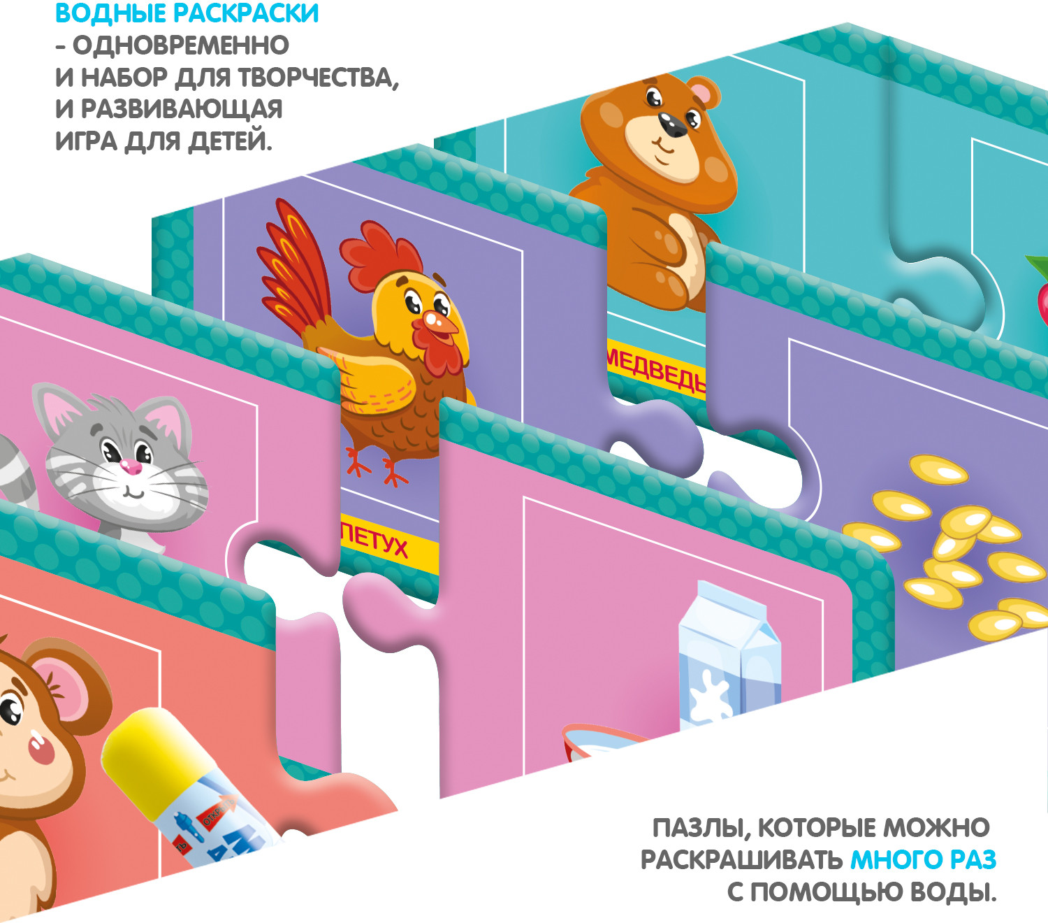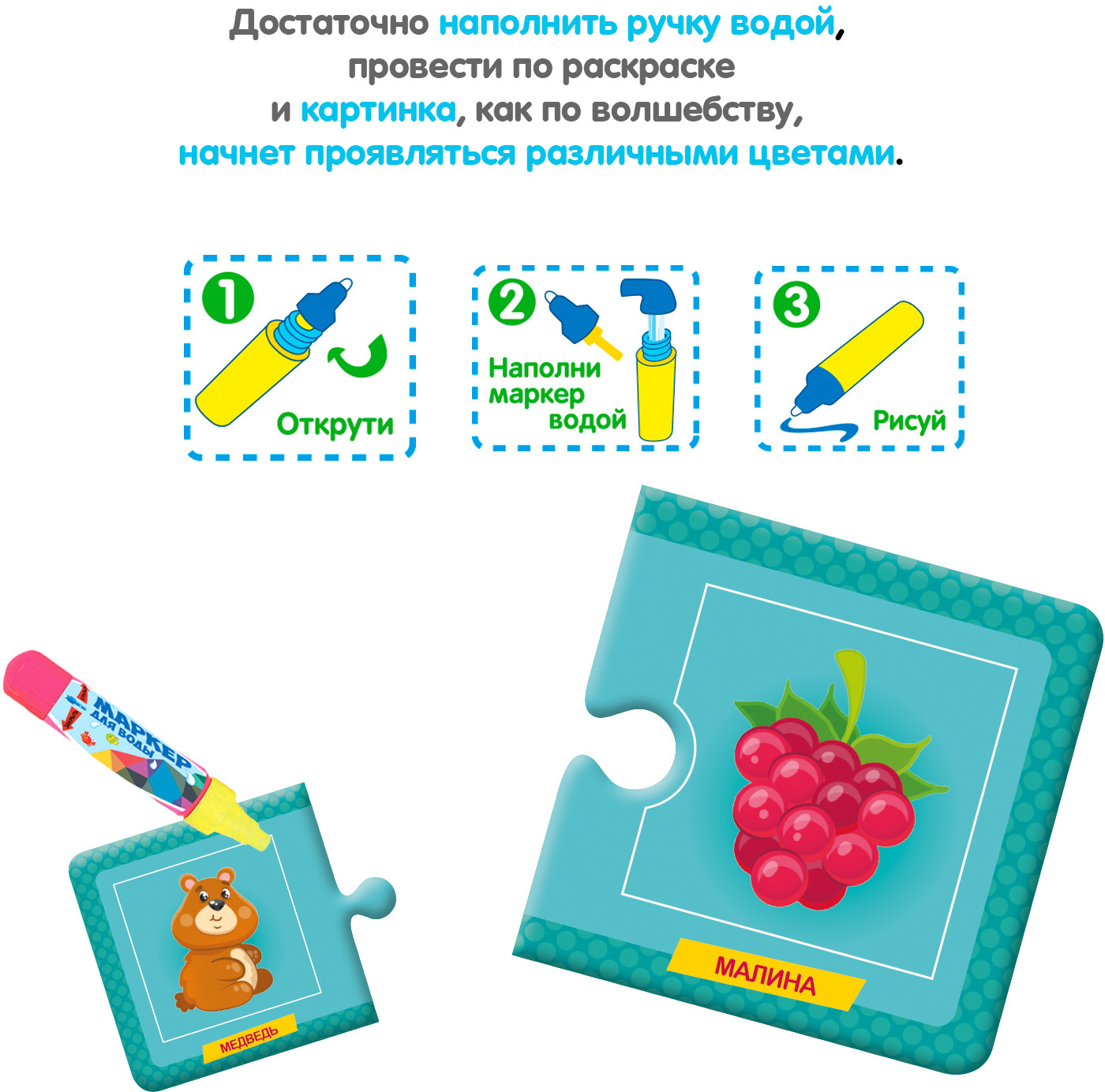 Многоразовые водные раскраски-пазлы — это замечательные наборы для творчества малышей от 3 лет. Водная раскраска послужит увлекательным занятием даже для тех, кто еще совсем не умеет рисовать. Достаточно наполнить ручку водой и провести по раскраске, и картинка, как по волшебству, начнёт проявляться различными цветами. После высыхания картинка опять становится бесцветной, и ребенок снова может раскрашивать её. Пазлы развивают образное и логическое мышление, наблюдательность и внимательность, а также мелкую моторику и координацию движений рук.