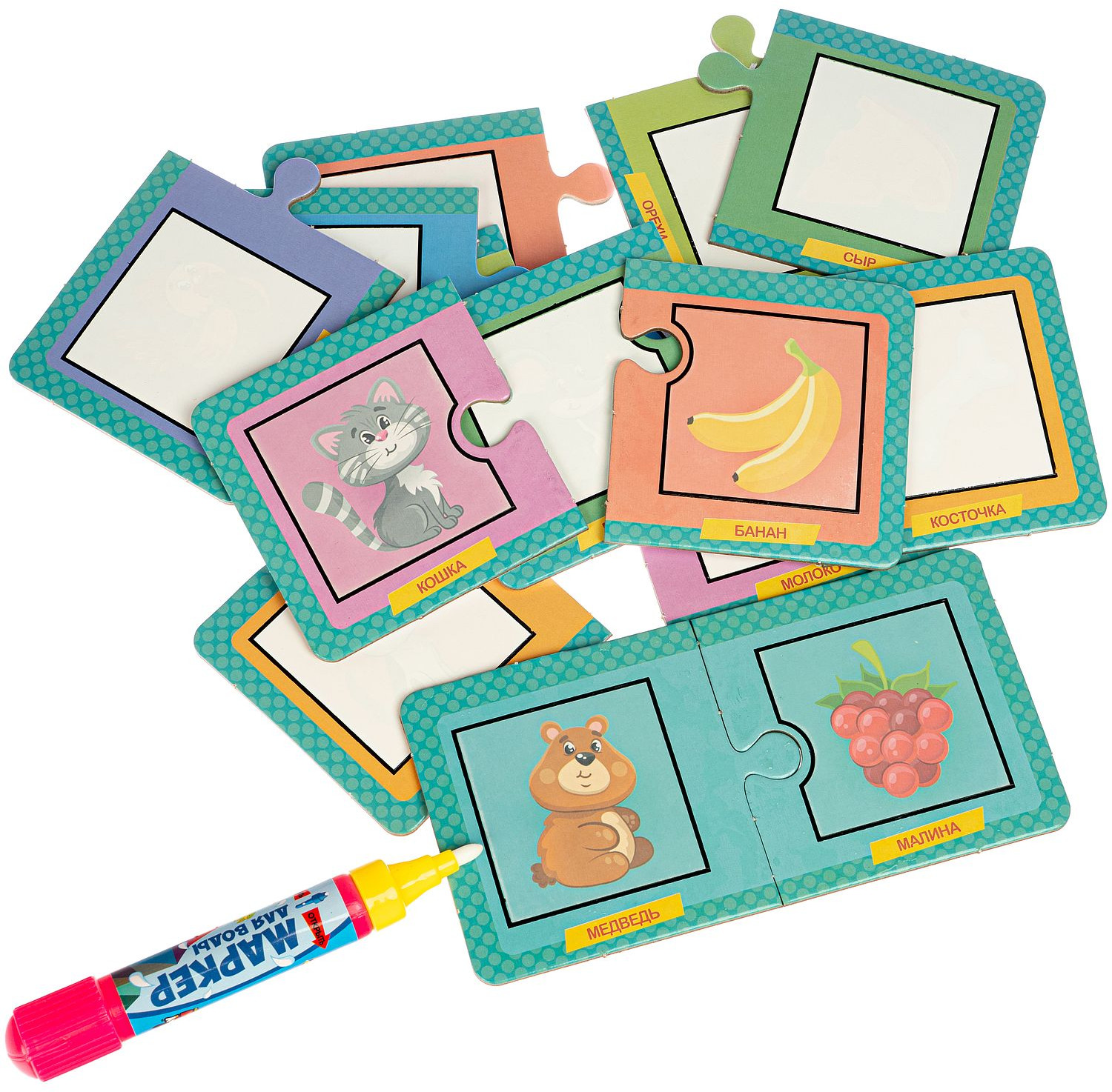 В наборе: 16 карточек (8 смысловых пар) и 1 водяной маркер.