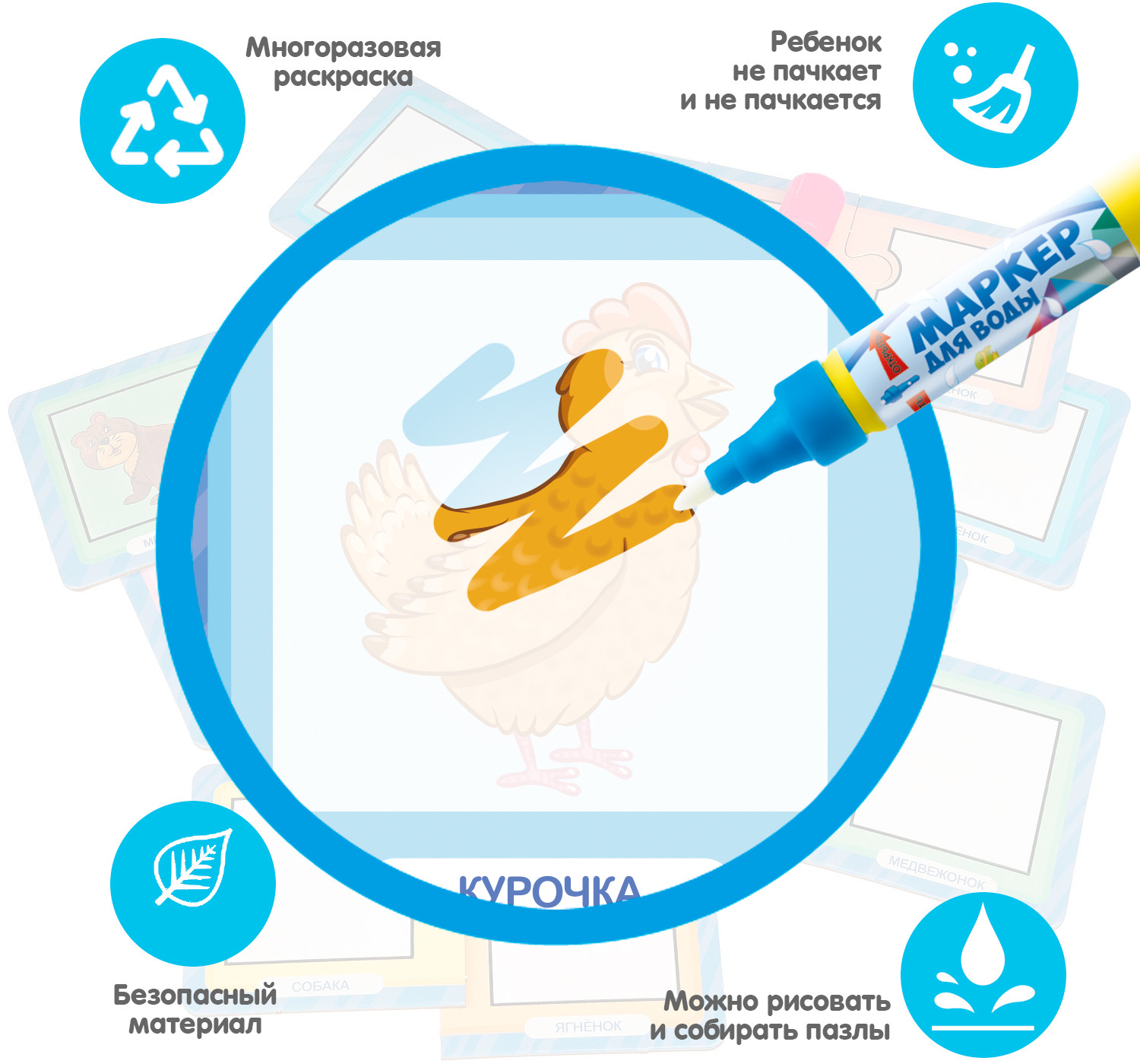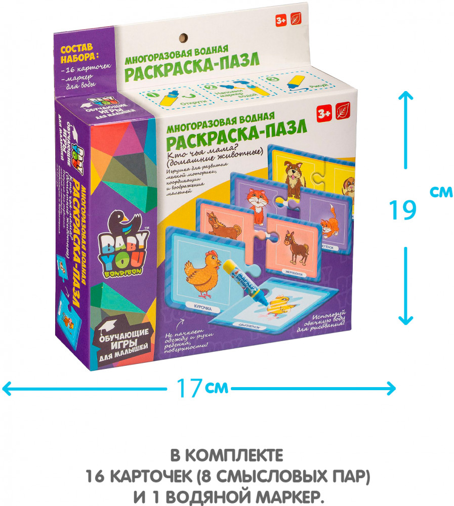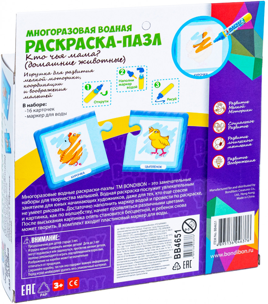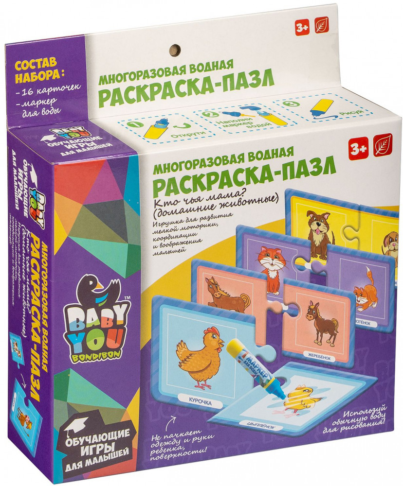 Bondibon Набор раскрасок-пазлов многоразовых «Кто чья мама?»В данный момент этот товар отсутствует в продаже. Возможно, у нас найдется аналогичный или похожий товар здесь. Серия: Baby You Многоразовые водные раскраски-пазлы — это замечательные наборы для творчества малышей от 3 лет. Водная раскраска послужит увлекательным занятием даже для тех, кто еще совсем не умеет рисовать. Достаточно наполнить ручку водой и провести по раскраске, и картинка, как по волшебству, начнёт проявляться различными цветами. После высыхания картинка опять становится бесцветной, и ребенок снова может раскрашивать её. Пазлы развивают образное и логическое мышление, наблюдательность и внимательность, а также мелкую моторику и координацию движений рук. |