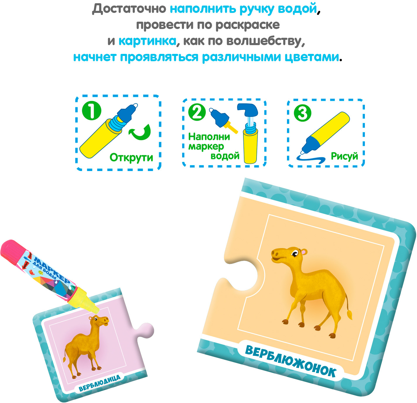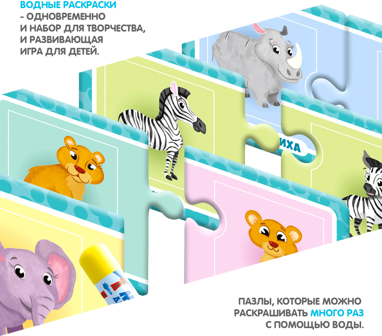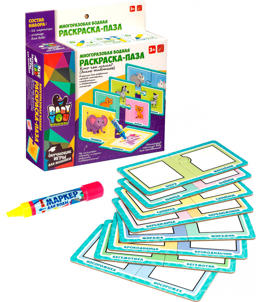 Многоразовые водные раскраски-пазлы — это замечательные наборы для творчества малышей от 3 лет. Водная раскраска послужит увлекательным занятием даже для тех, кто еще совсем не умеет рисовать. Достаточно наполнить ручку водой и провести по раскраске, и картинка, как по волшебству, начнёт проявляться различными цветами. После высыхания картинка опять становится бесцветной, и ребенок снова может раскрашивать её. Пазлы развивают образное и логическое мышление, наблюдательность и внимательность, а также мелкую моторику и координацию движений рук.