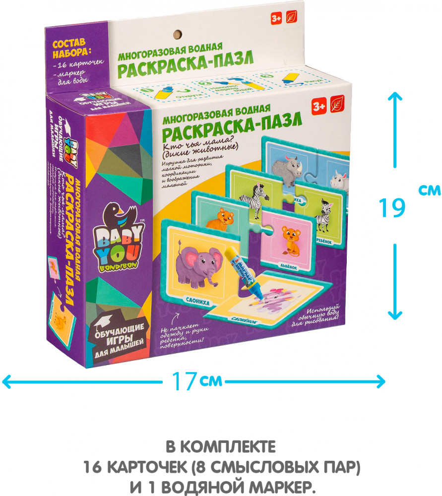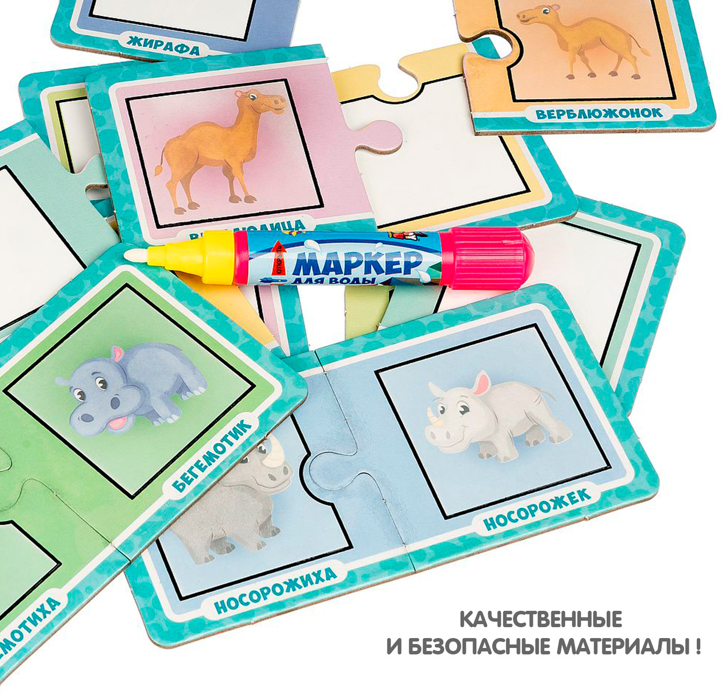 Но это ещё не всё! Ребёнку нужно подобрать каждой картинке соответствующую картинку по форме и по смысловому значению, как в играх лото. Ребенок изучит животных, и что они едят. Для рисования можно использовать обычную воду, маркер не пачкает одежду и руки ребенка.