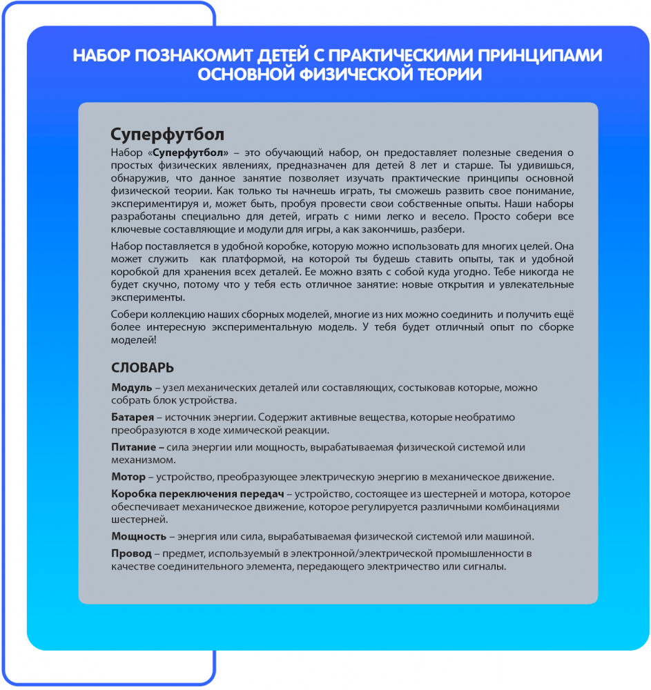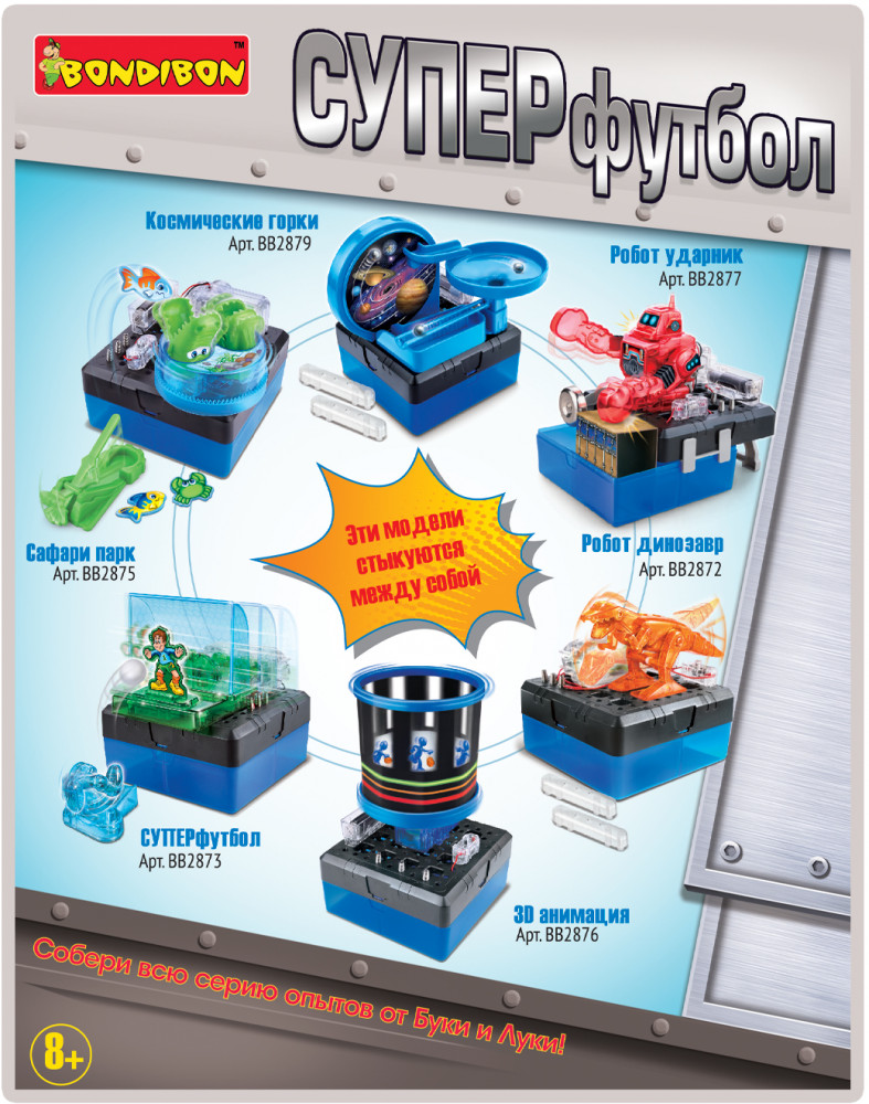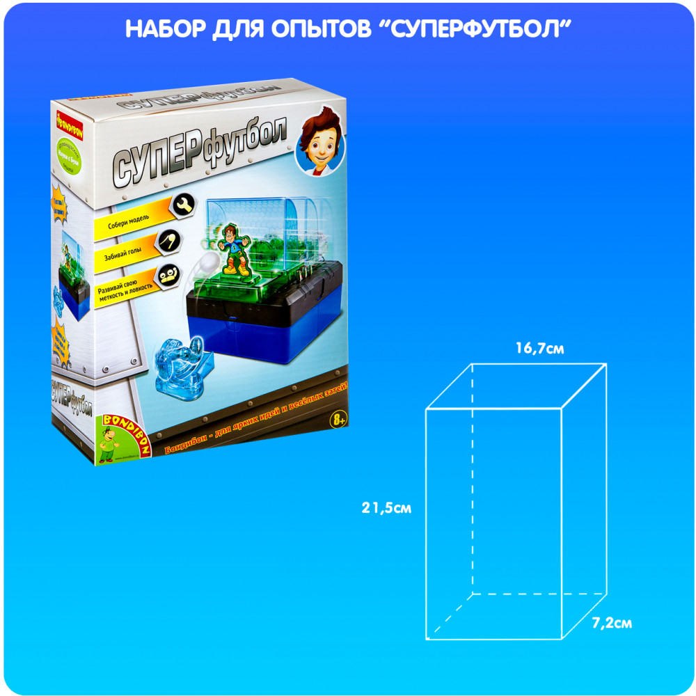 Bondibon Набор для опытов «Суперфутбол»В данный момент этот товар отсутствует в продаже. Возможно, у нас найдется аналогичный или похожий товар здесь. Серия: Науки с Буки. Французские опыты Футбол, без преувеличения, самая популярная игра в мире, в которую с удовольствием играют и дети, и взрослые. Для игры необходимы две команды и мяч, а главная цель игры — забить гол во вражеские ворота, обхитрив вратаря. Устроить футбольную тренировку теперь можно прямо в своей комнате, и для этого не нужен ни мяч, ни 11 игроков. Суперфутбол — это научная игра, представляющая собой соревнование с вратарем и заодно прекрасную возможность потренироваться в ловкости, скорости реакции и остроте зрения. Чтобы победить, Вы должны попасть мячом в ворота, пока вратарь двигается из стороны в сторону. Развивайте концентрацию и ловкость рук с этим набором от Бондибон! |