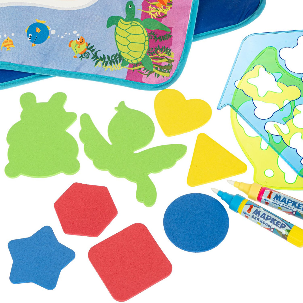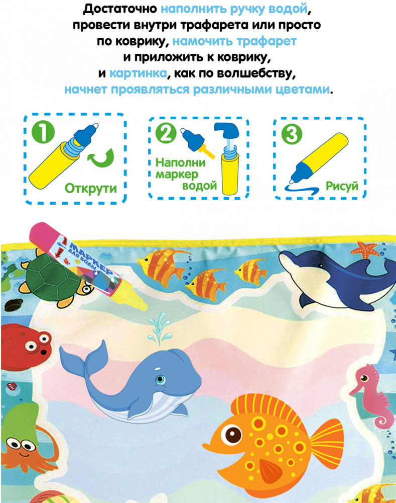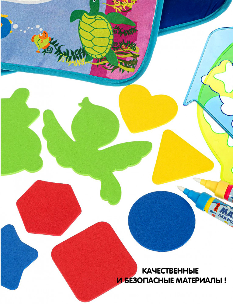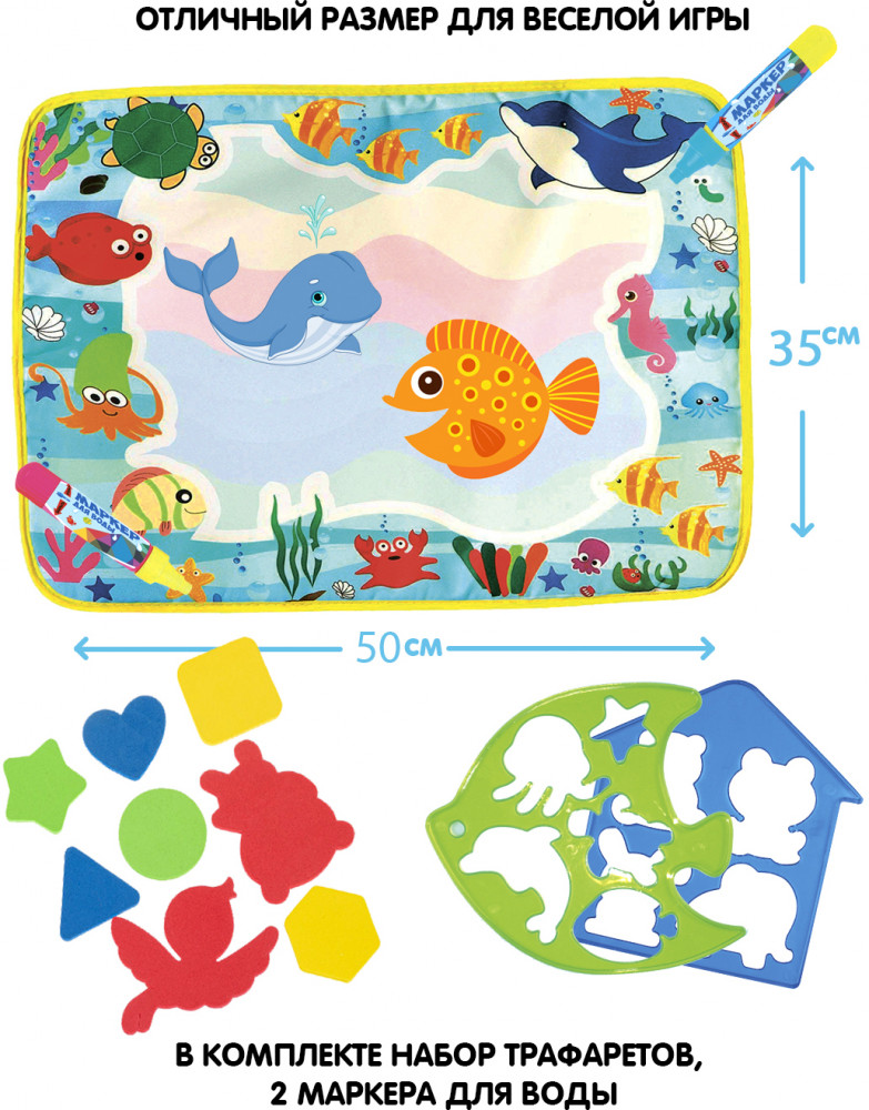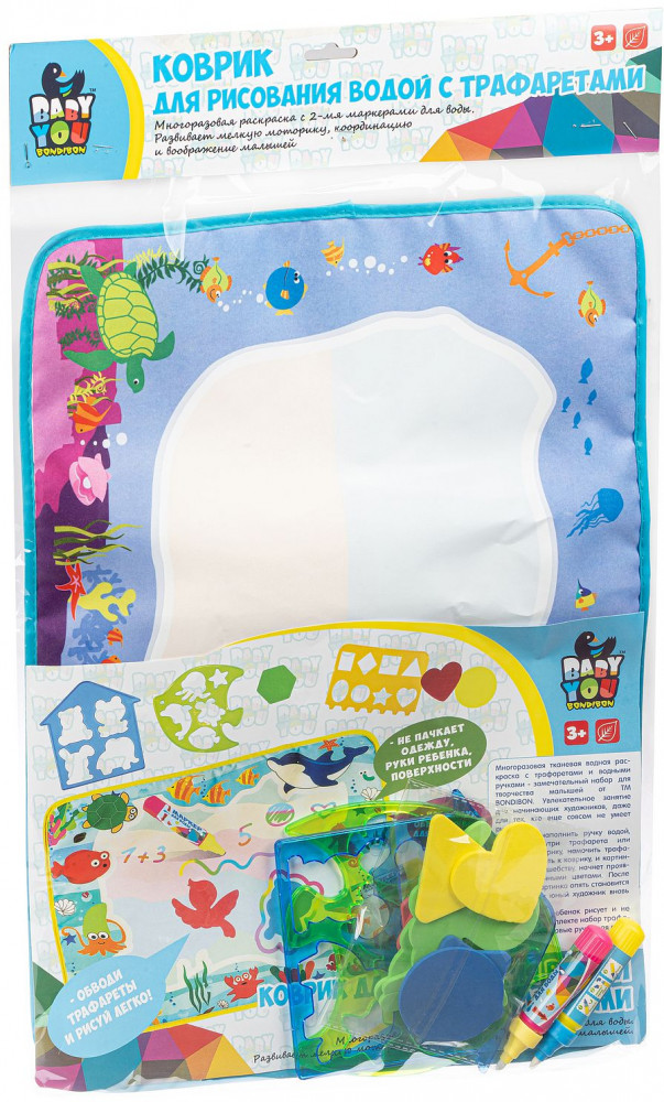 Bondibon Коврик для рисования водой «Подводный мир»В данный момент этот товар отсутствует в продаже. Возможно, у нас найдется аналогичный или похожий товар здесь. Серия: Baby You Коврик-водная раскраска «Веселый счет» серии «Baby You» от «Bondibon» — замечательный набор для творчества и развития малышей от 3 лет. Водная раскраска послужит увлекательным занятием для начинающих художников. Достаточно наполнить ручку водой, провести внутри трафарета или просто по раскраске, намочить деталь-шаблон и приложить к коврику, картинка, как по волшебству, начнет проявляться различными цветами. После высыхания картинка опять становится бесцветной, и ребенок снова может раскрашивать её. Набор позволяет изучать цвета, геометрические фигуры и морских обитателей. Для рисования можно использовать обычную воду, маркер не пачкает одежду и руки ребенка. |