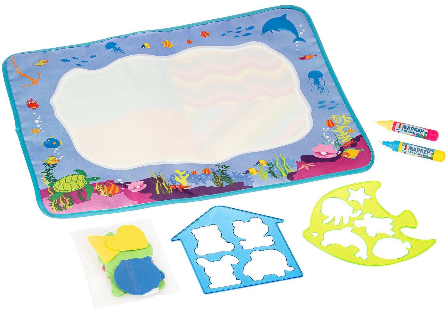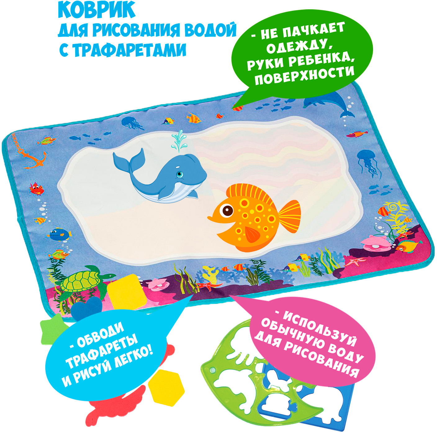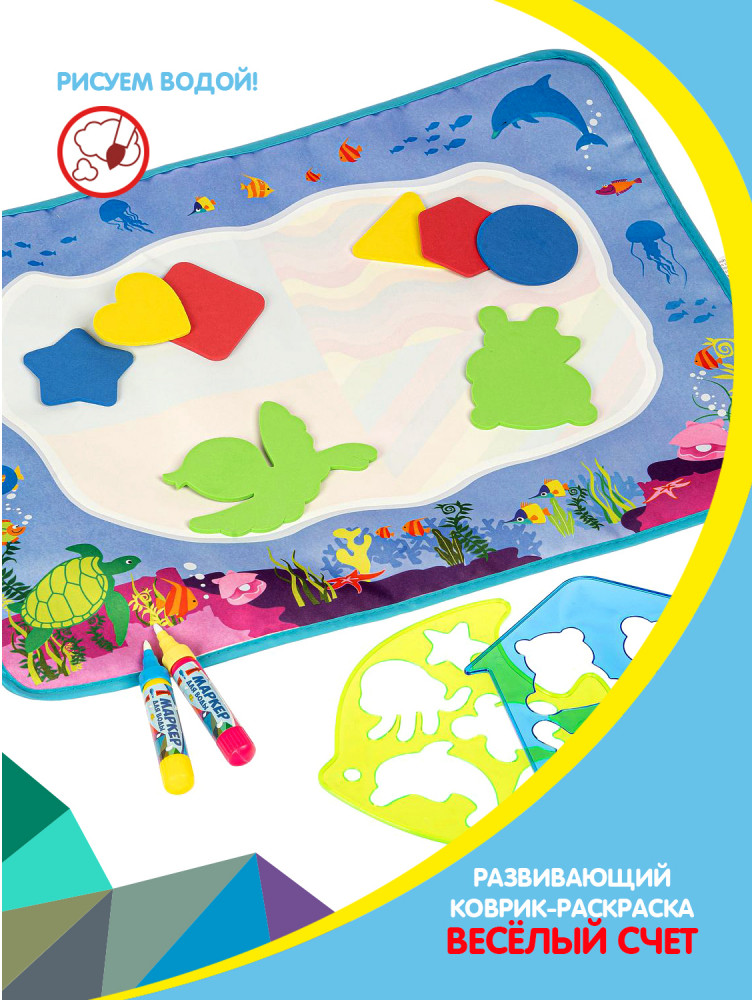 Bondibon Коврик для рисования водой «Подводный мир»В данный момент этот товар отсутствует в продаже. Возможно, у нас найдется аналогичный или похожий товар здесь. Серия: Baby You Коврик-водная раскраска «Веселый счет» серии «Baby You» от «Bondibon» — замечательный набор для творчества и развития малышей от 3 лет. Водная раскраска послужит увлекательным занятием для начинающих художников. Достаточно наполнить ручку водой, провести внутри трафарета или просто по раскраске, намочить деталь-шаблон и приложить к коврику, картинка, как по волшебству, начнет проявляться различными цветами. После высыхания картинка опять становится бесцветной, и ребенок снова может раскрашивать её. Набор позволяет изучать цвета, геометрические фигуры и морских обитателей. Для рисования можно использовать обычную воду, маркер не пачкает одежду и руки ребенка. |