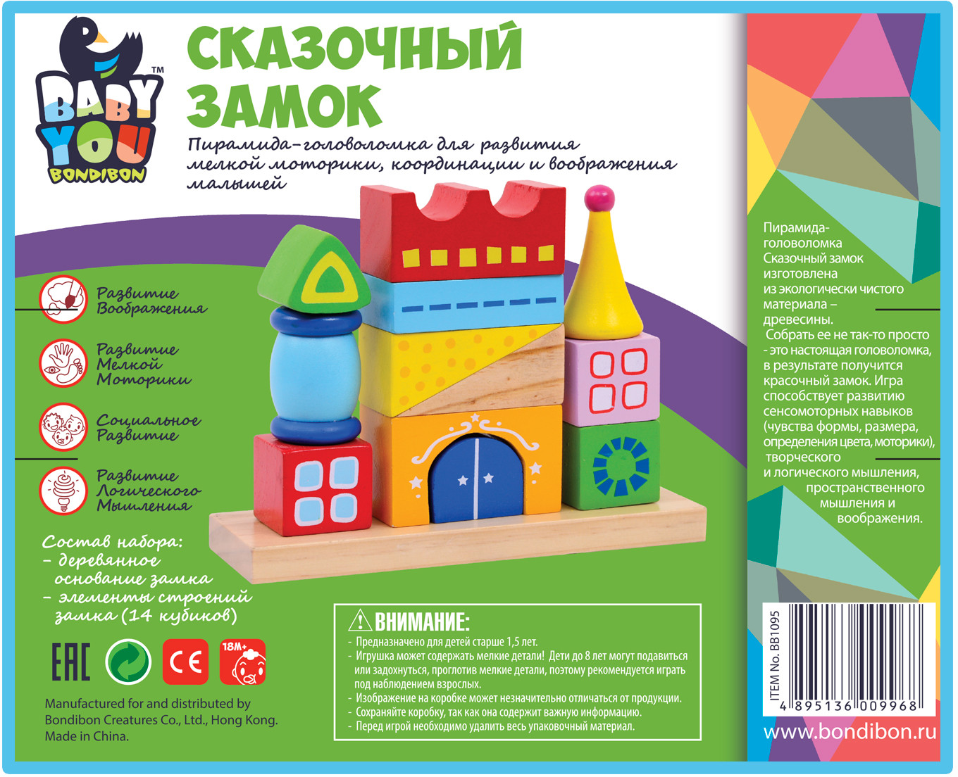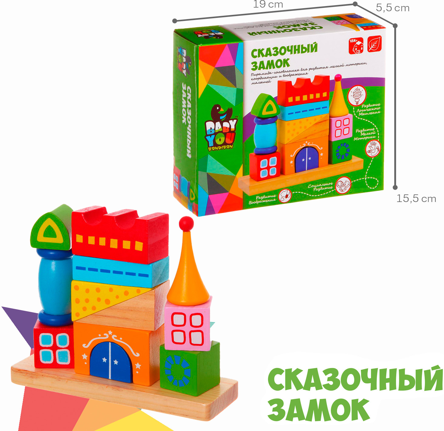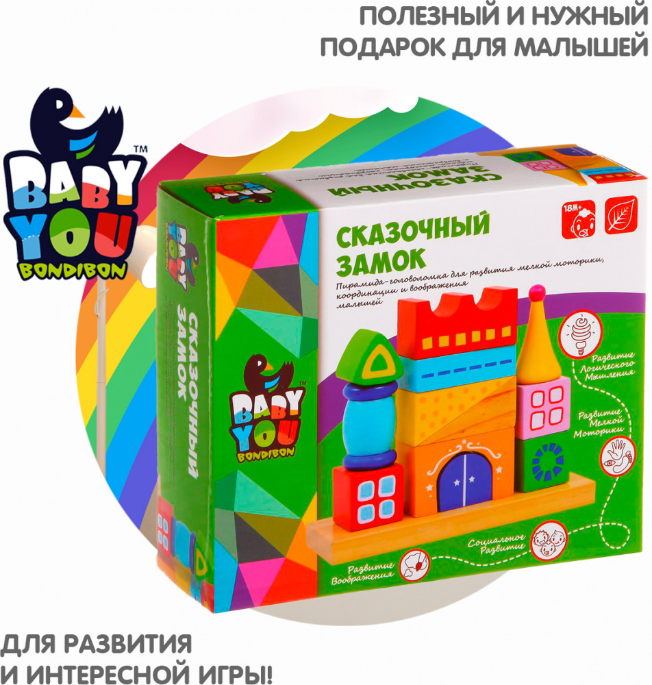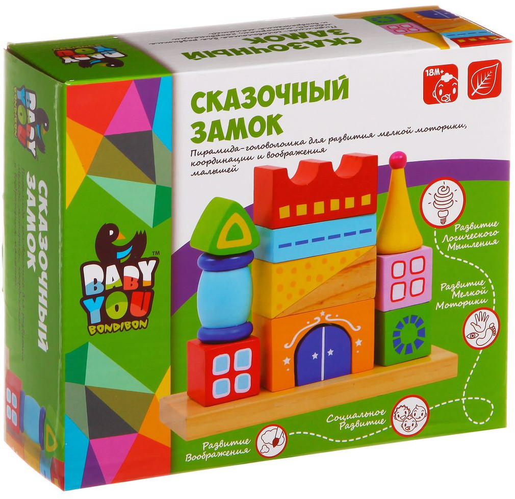 Bondibon Конструктор-пирамидка «Сказочный замок»В данный момент этот товар отсутствует в продаже. Возможно, у нас найдется аналогичный или похожий товар здесь. Серия: Baby You Пирамидка-замок это супер-развивающая игра. Она сродни головоломке. Распределяя различные по цвету и форме детали на разных стержнях, малыш получает представление о соразмерности составных частей единого целого, об их различном предназначении, а самостоятельно собранный паровозик из дерева еще и мотивирует ребенка к двигательной активности. С его помощью уже в полгода карапуз совершит очень важное открытие — паровозик может ехать только при условии того, что собран правильно. |