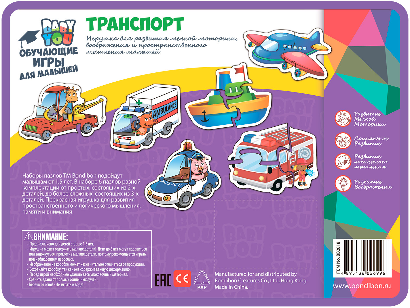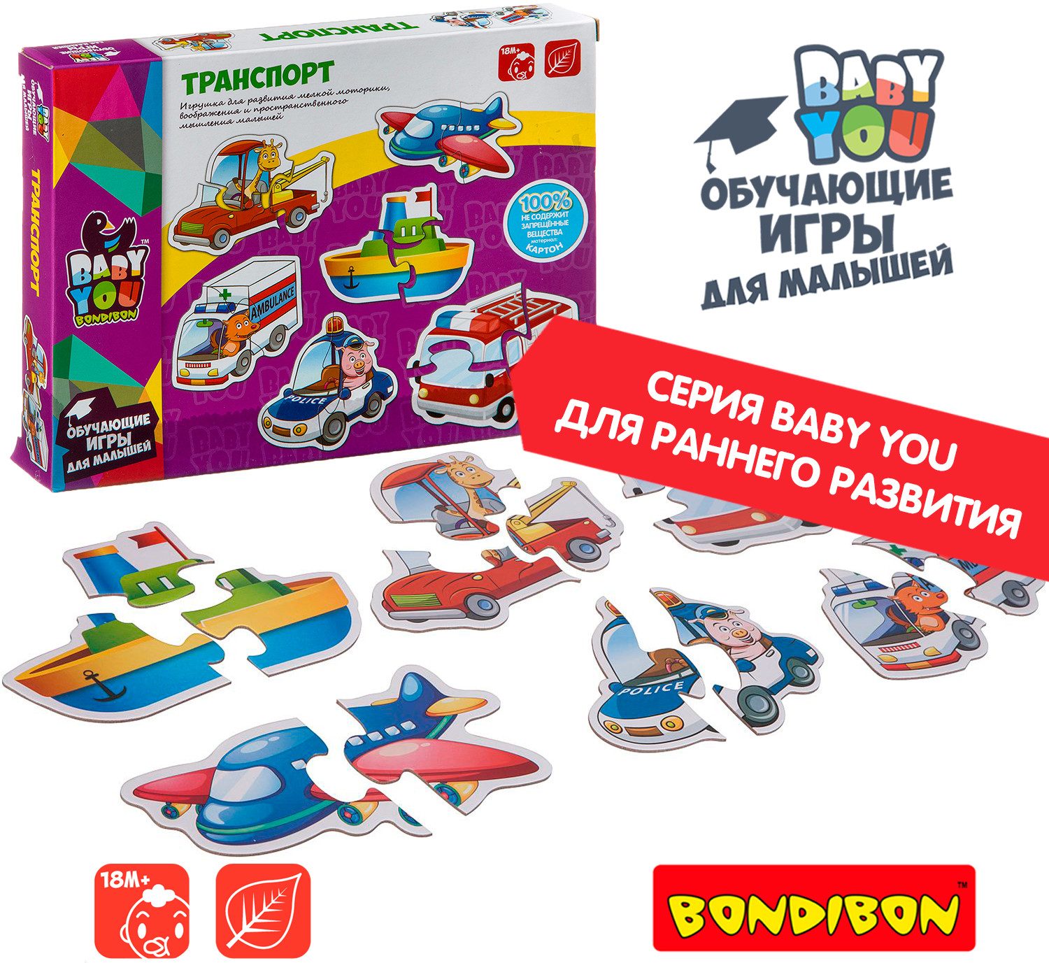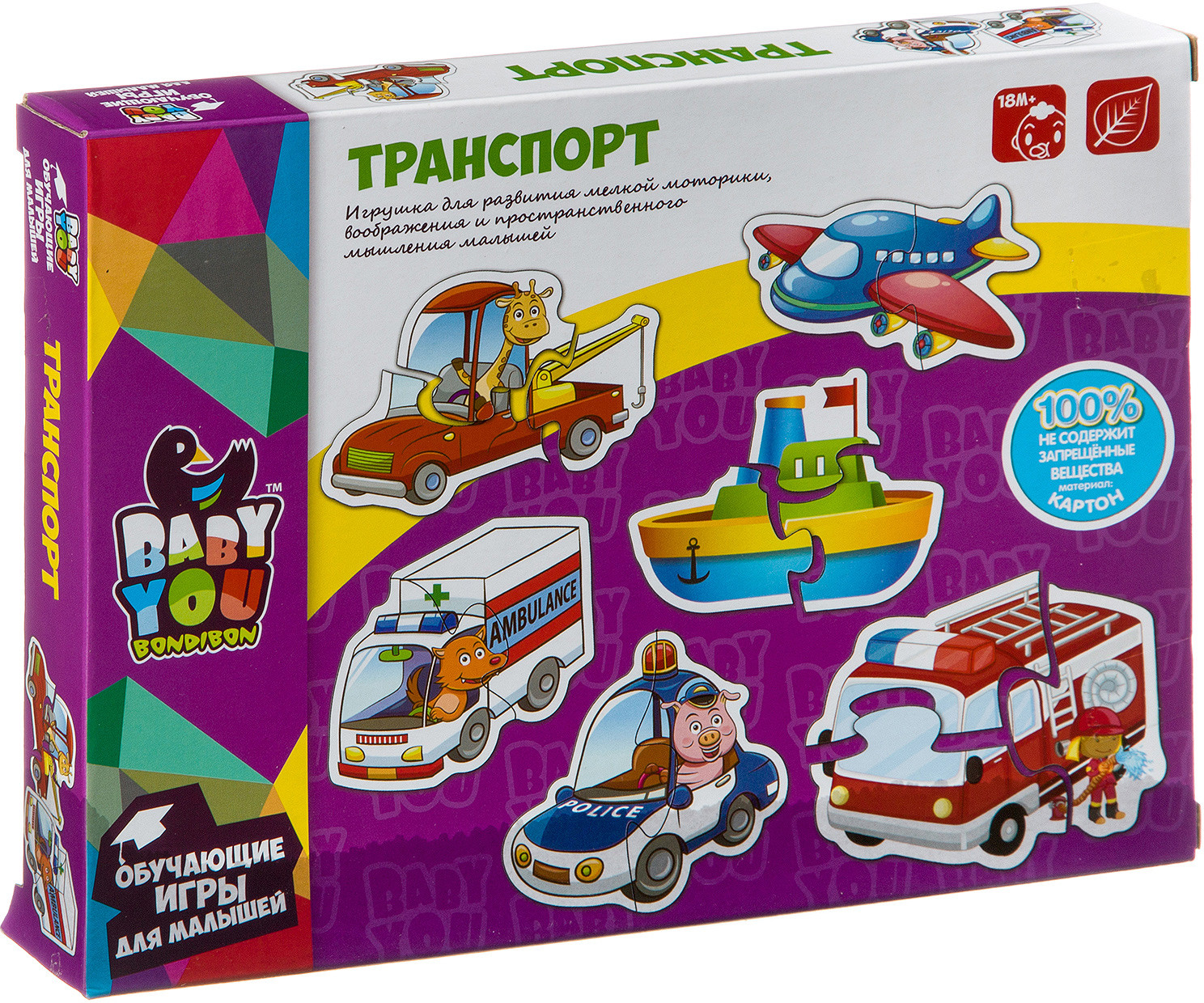 Bondibon Набор пазлов «Транспорт»В данный момент этот товар отсутствует в продаже. Возможно, у нас найдется аналогичный или похожий товар здесь. Серия: Baby You В наборе 6 веселых фигурок транспортных средств. Играя с ними, малыш не только выучит их названия и внешний вид но и разовьет воображение фантазию мелкую моторику и тактильное восприятие. |