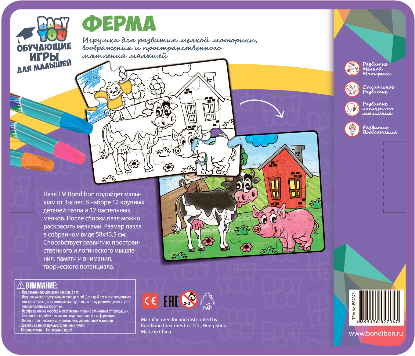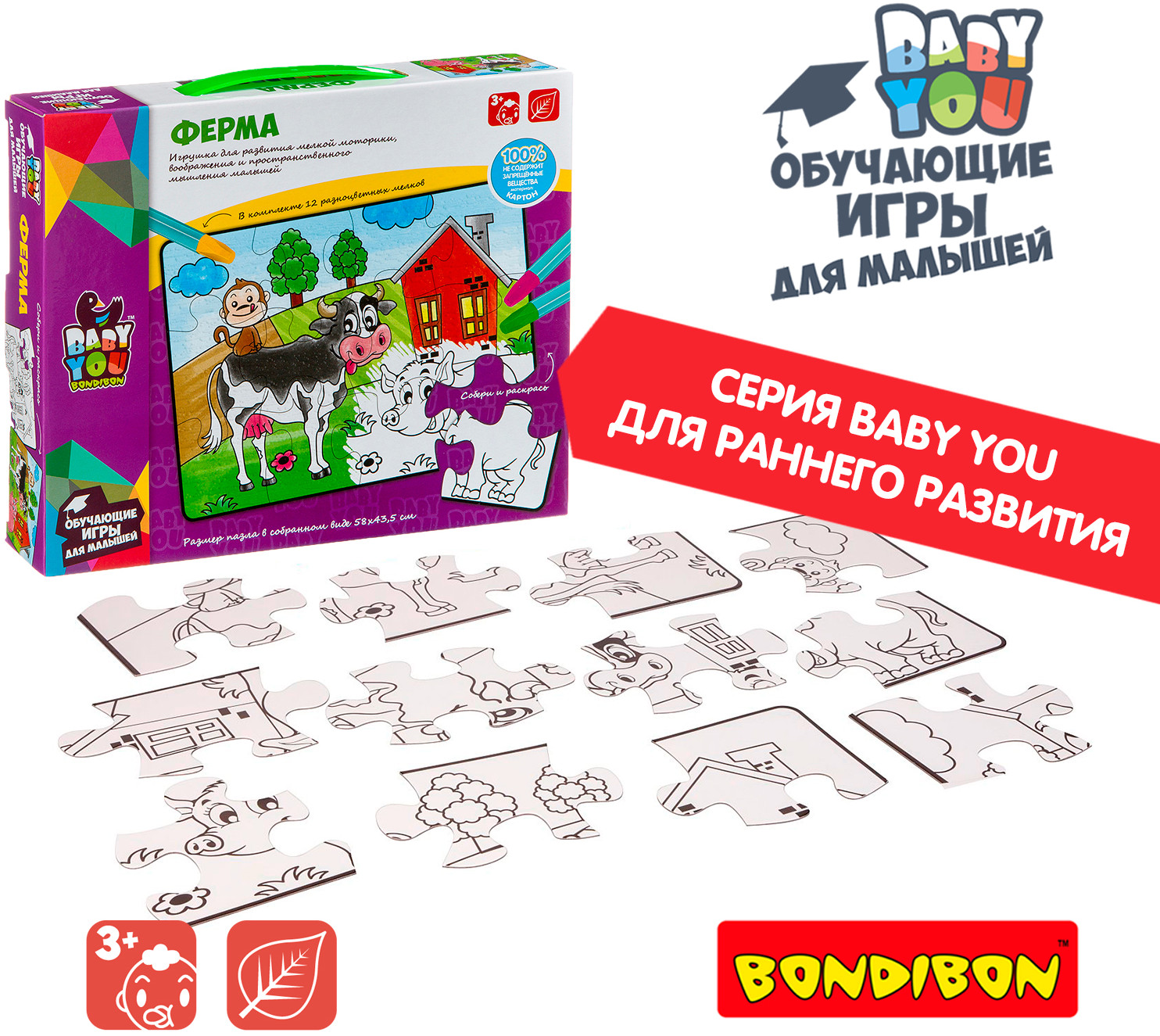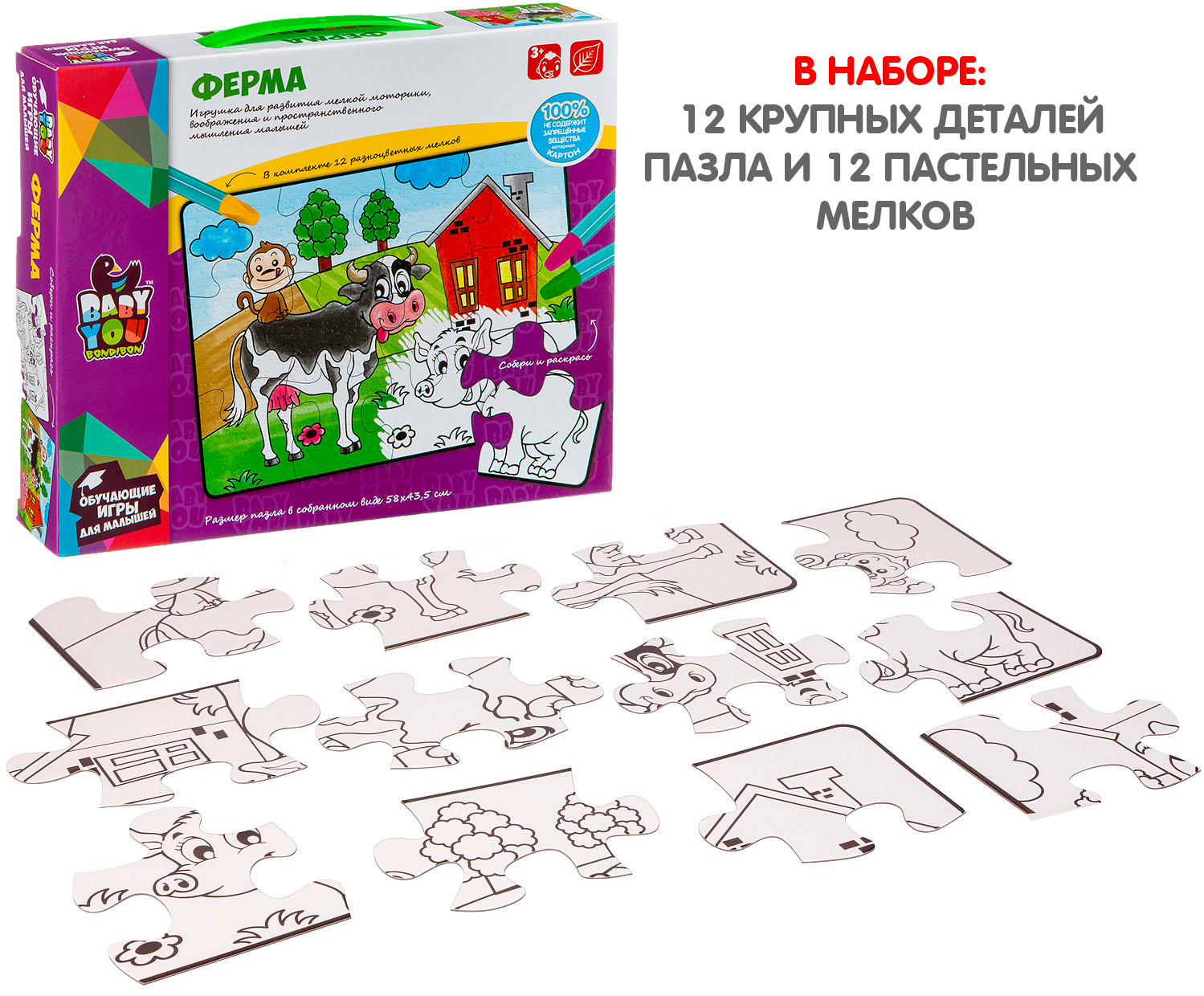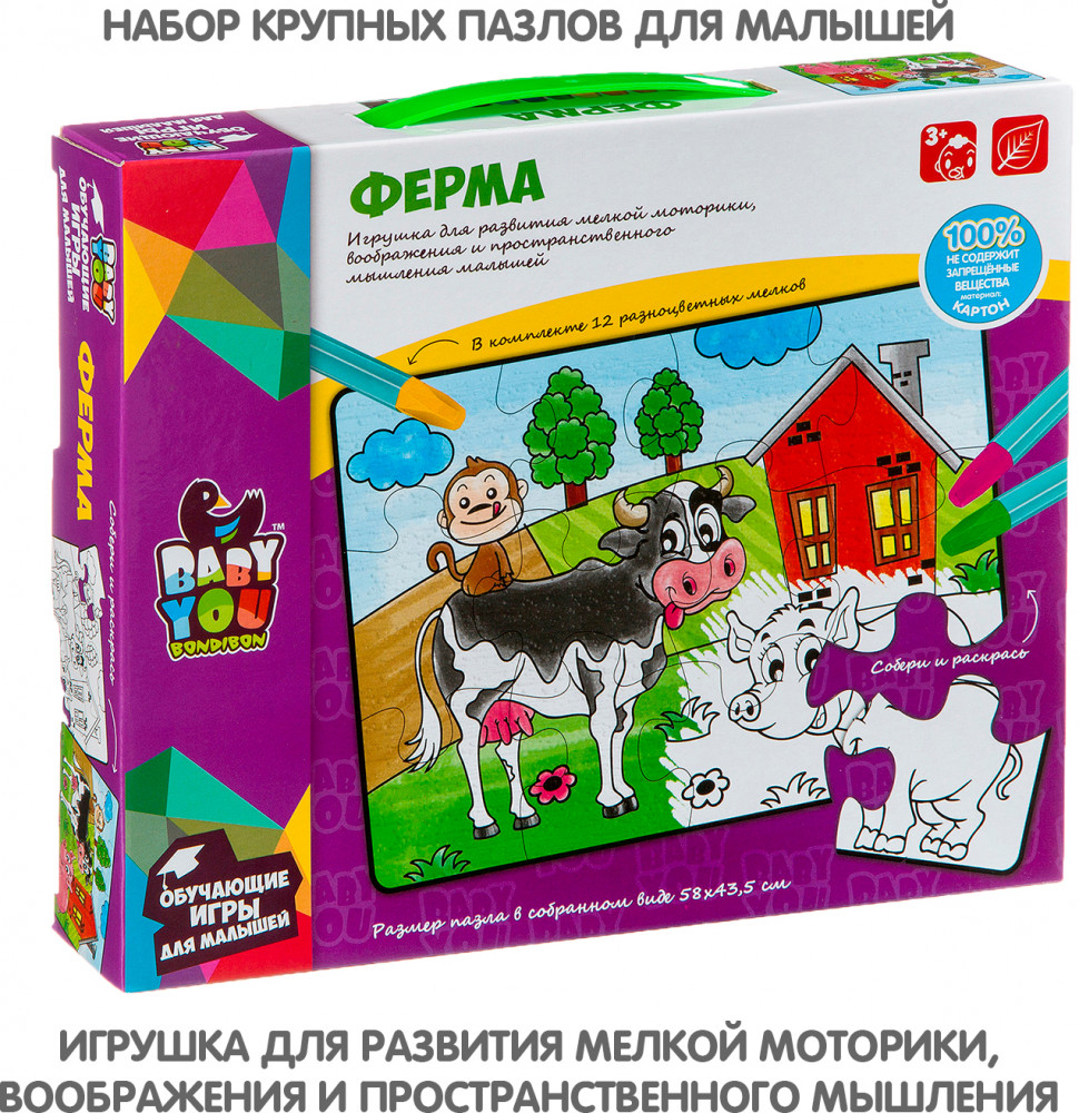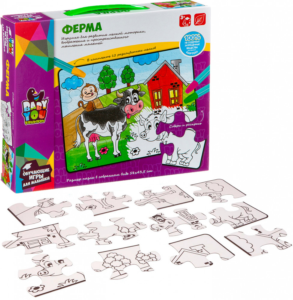 Bondibon Пазл для раскрашивания «Ферма»В данный момент этот товар отсутствует в продаже. Возможно, у нас найдется аналогичный или похожий товар здесь. Серия: Baby You Пазл подойдет малышам от 3-х лет. В наборе 12 крупных деталей пазла и 12 пастельных мелков. После сборки пазл можно раскрасить мелками. Размер пазла в собранном виде 58×43,5 см. Играя с пазлом малыш разовьет воображение фантазию мелкую моторику и тактильное восприятие. |