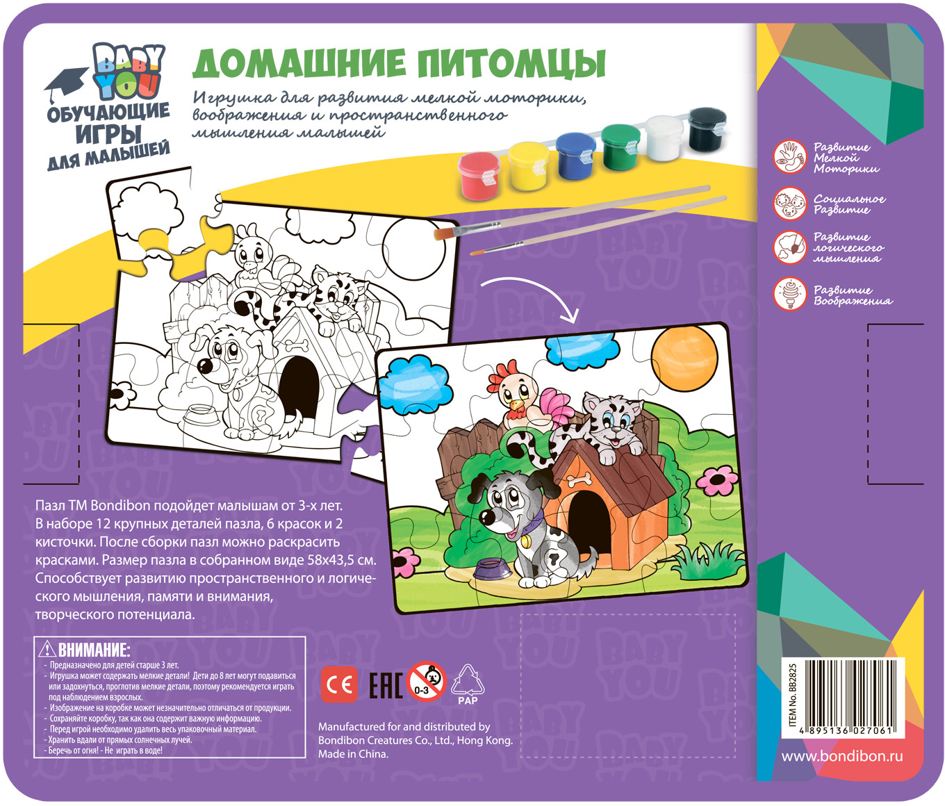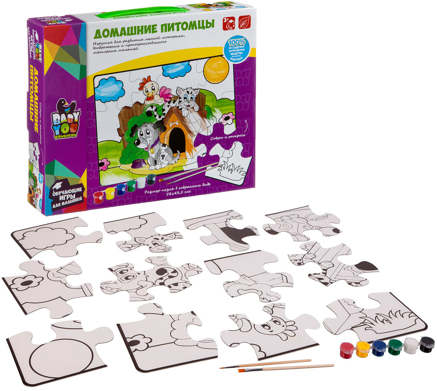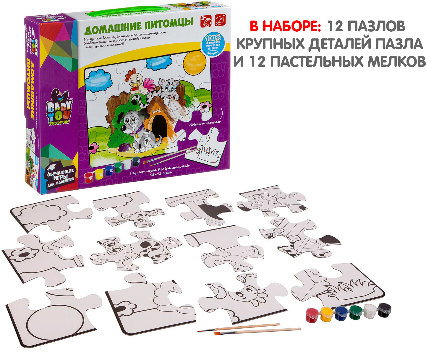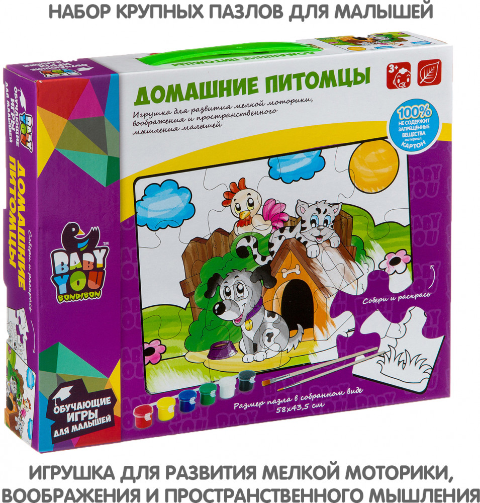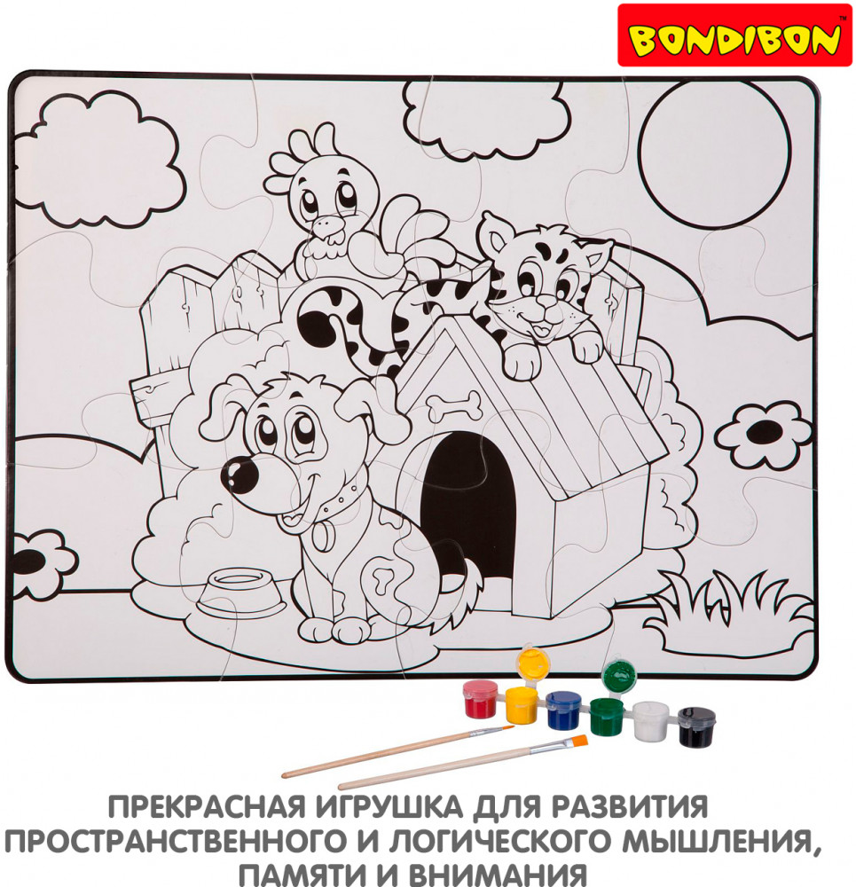 Bondibon Пазл для раскрашивания «Домашние питомцы»В данный момент этот товар отсутствует в продаже. Возможно, у нас найдется аналогичный или похожий товар здесь. Серия: Baby You Пазл подойдет малышам от 3-х лет. В наборе 12 крупных деталей пазла, 6 красок и 2 кисточки. После сборки пазл можно раскрасить красками. Размер пазла в собранном виде 58×43,5 см. Играя с пазлом малыш разовьет воображение фантазию мелкую моторику |