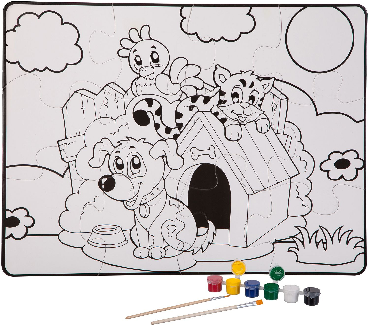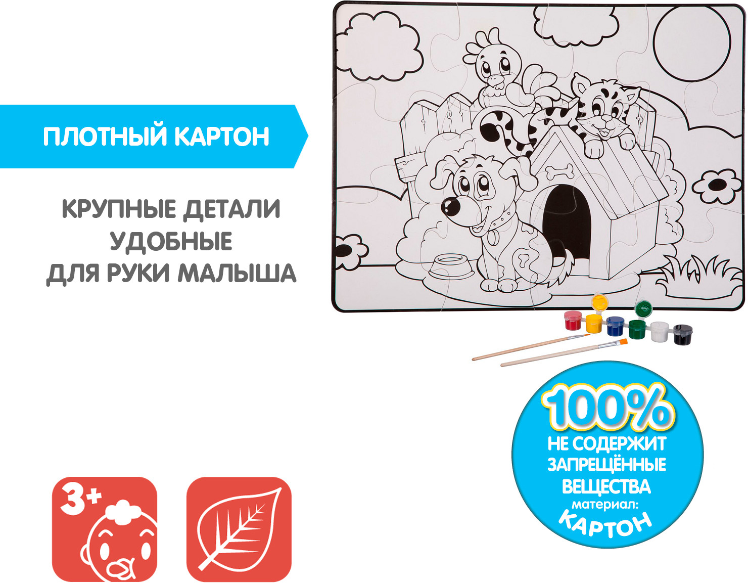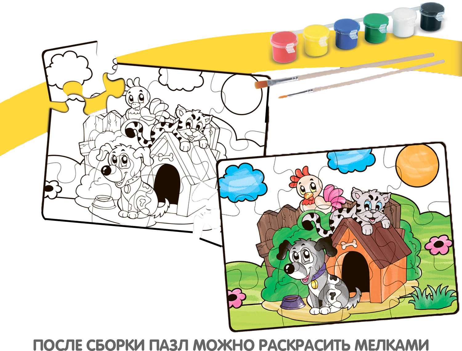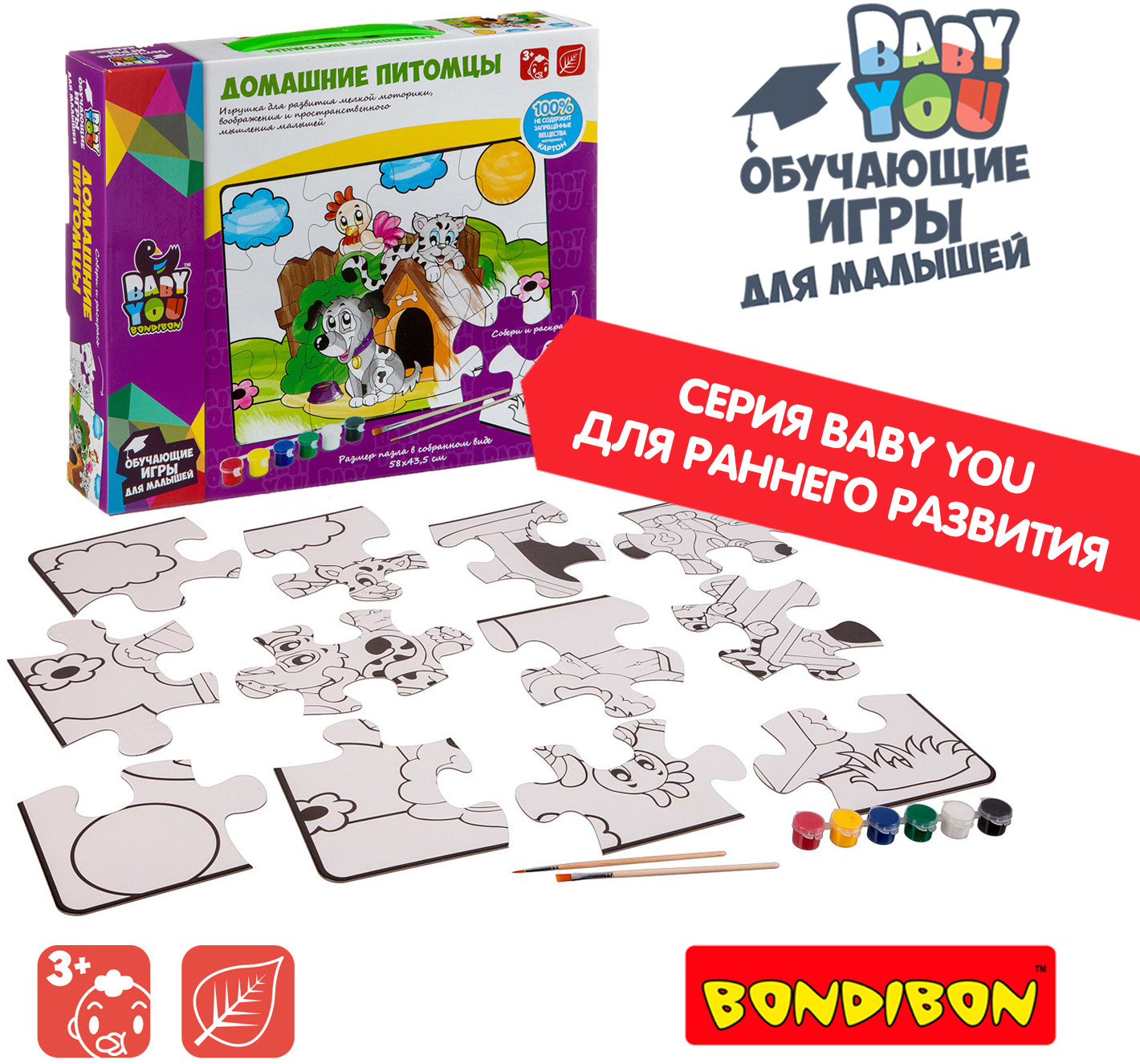 Bondibon Пазл для раскрашивания «Домашние питомцы»В данный момент этот товар отсутствует в продаже. Возможно, у нас найдется аналогичный или похожий товар здесь. Серия: Baby You Пазл подойдет малышам от 3-х лет. В наборе 12 крупных деталей пазла, 6 красок и 2 кисточки. После сборки пазл можно раскрасить красками. Размер пазла в собранном виде 58×43,5 см. Играя с пазлом малыш разовьет воображение фантазию мелкую моторику |
