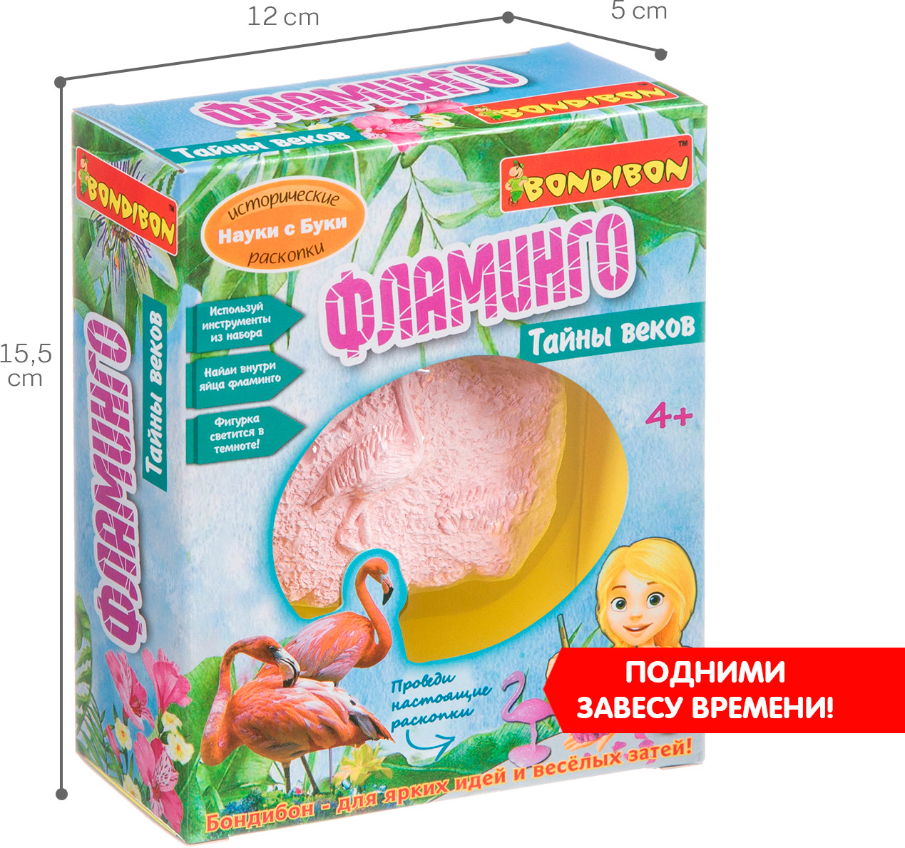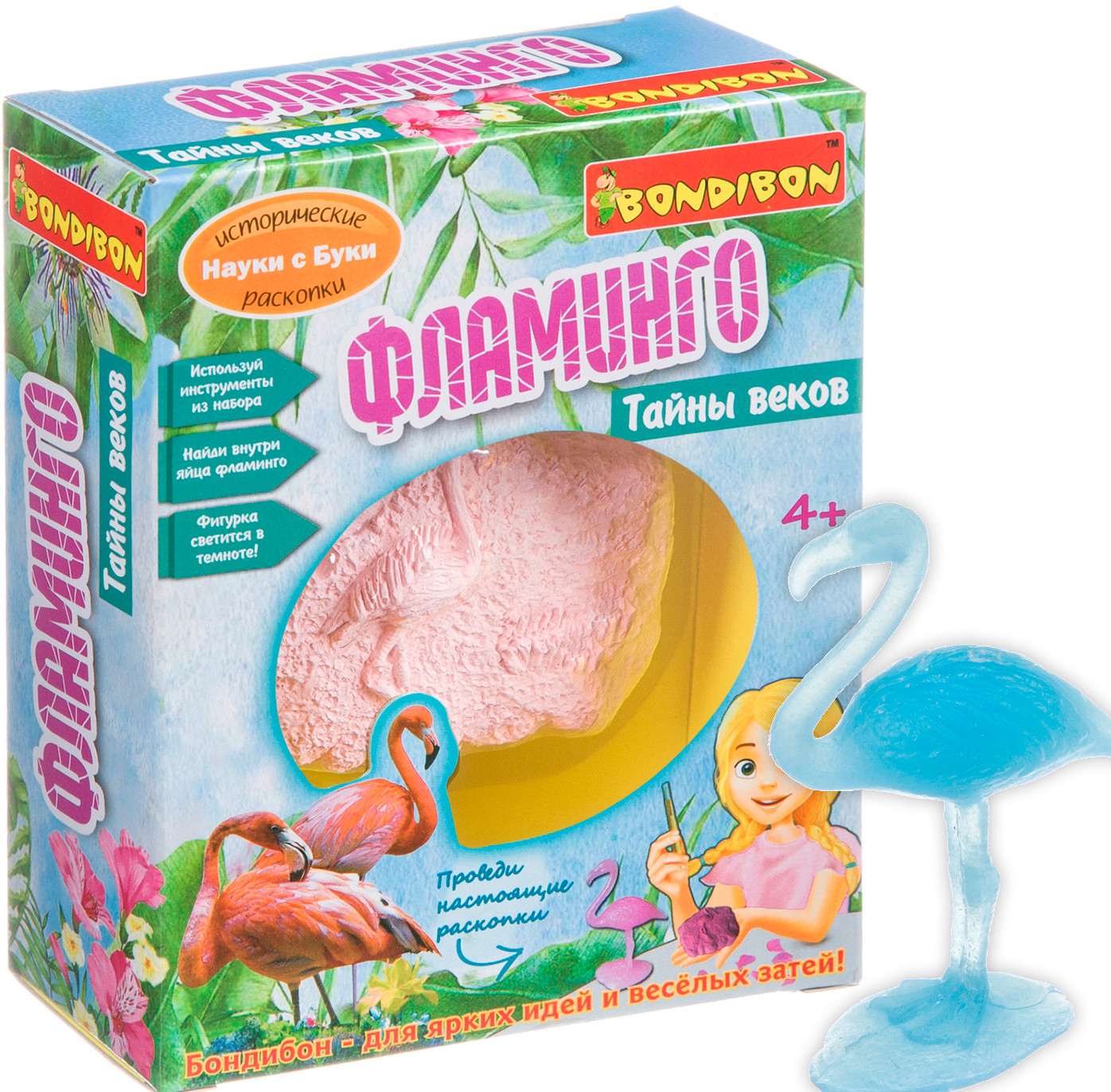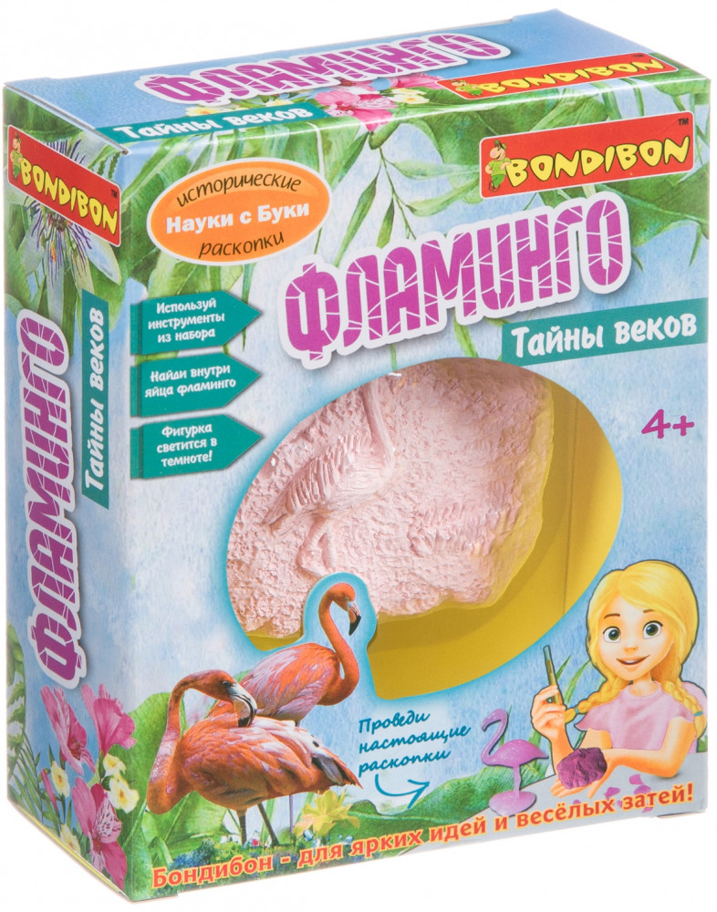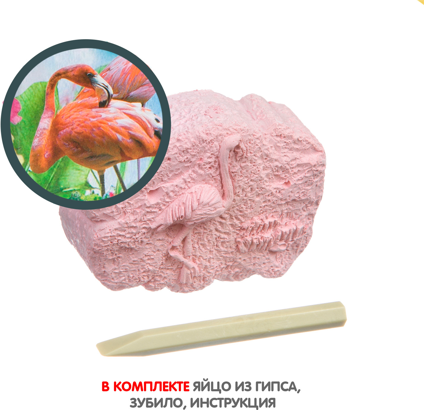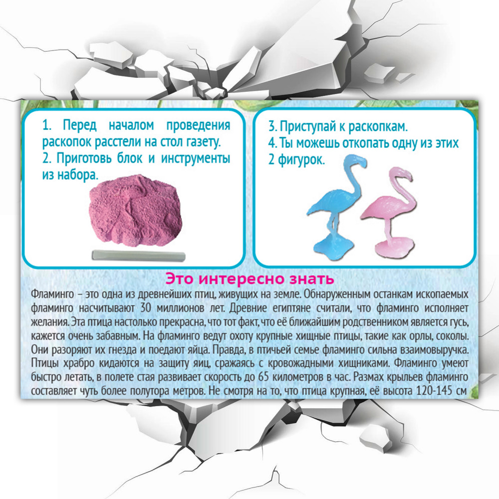 Проведи настоящие раскопки, используя инструмент из набора. Найди внутри гипсового блока прекрасного фламинго. Узнай некоторые интересные факты об этой удивительной птице, существовавшей на нашей планете ещё много веков назад.