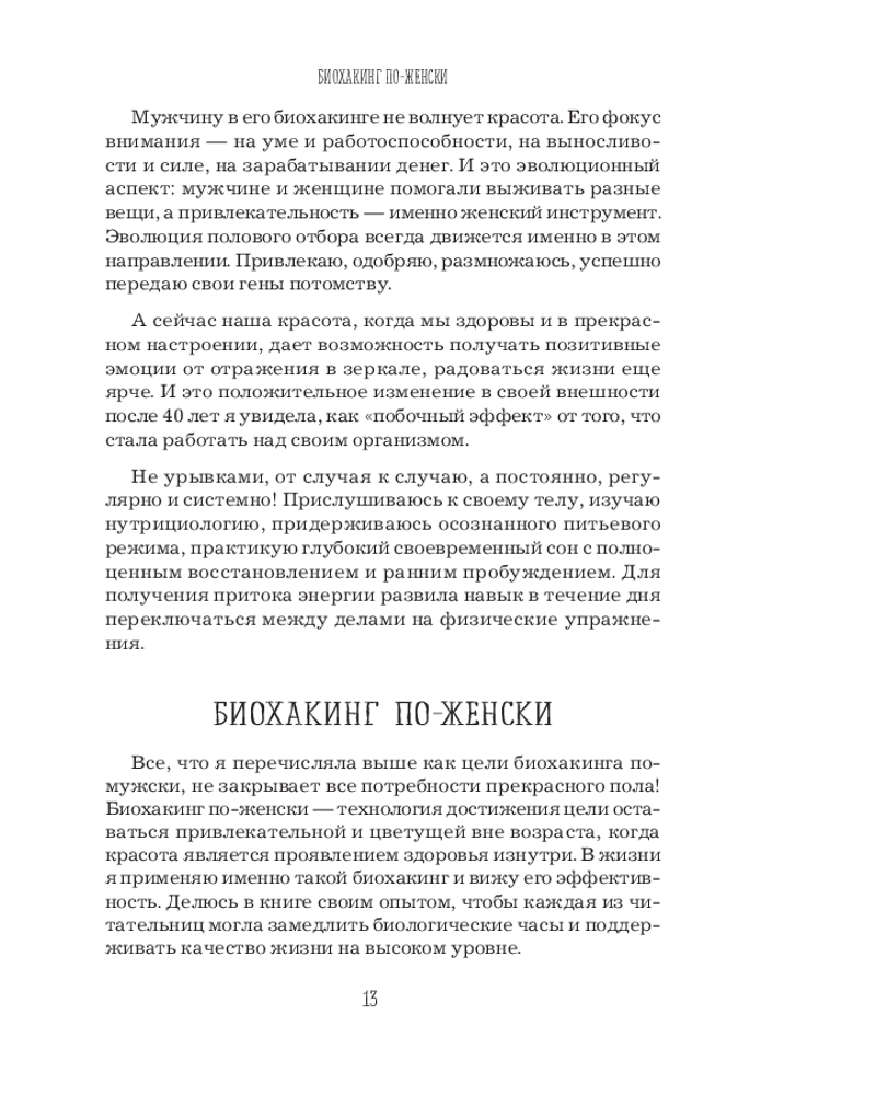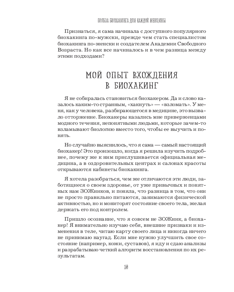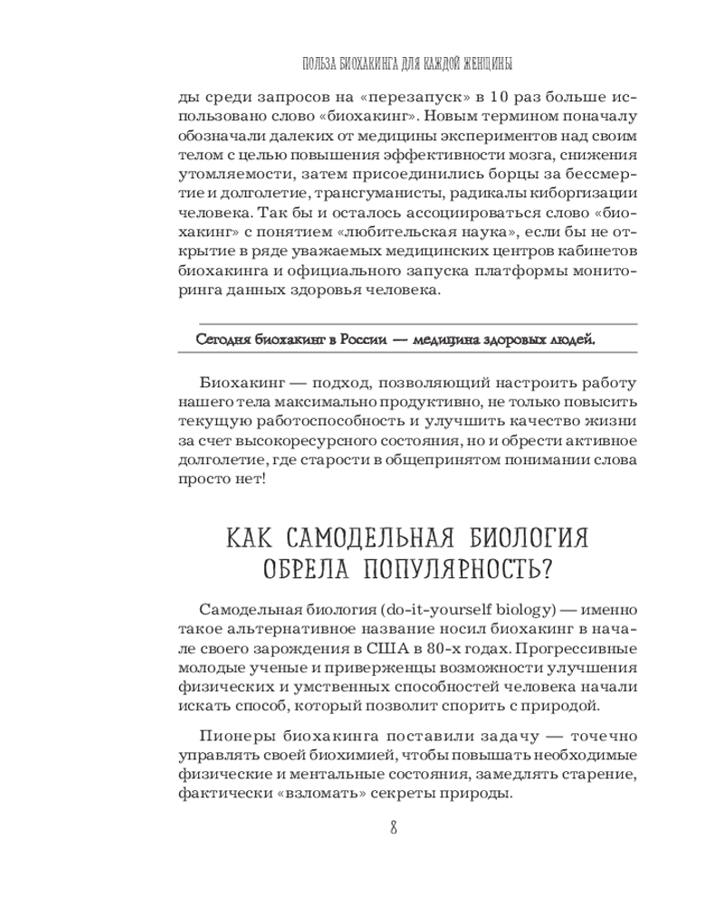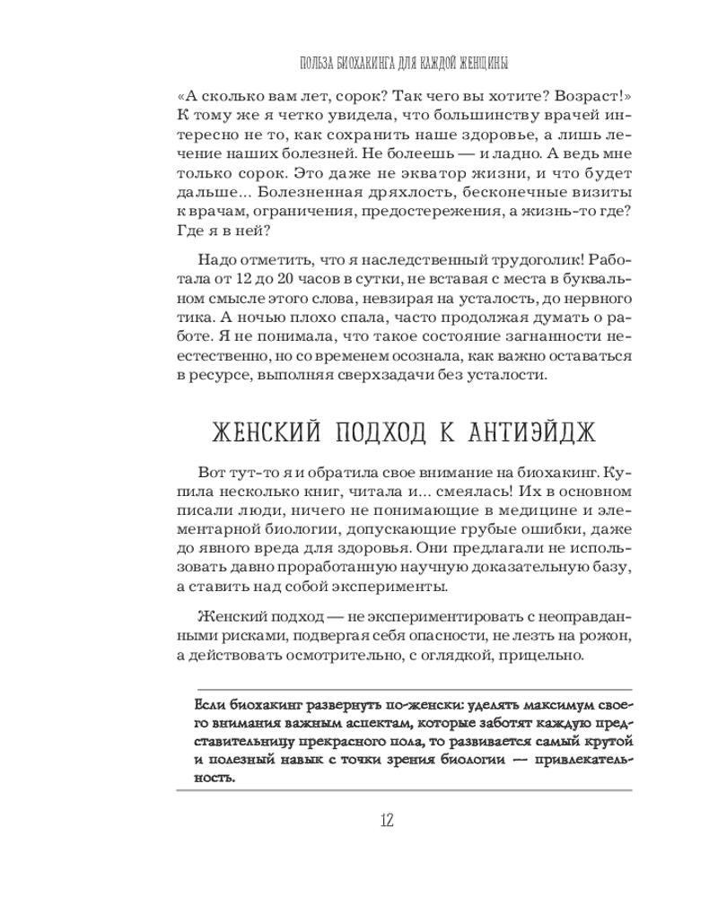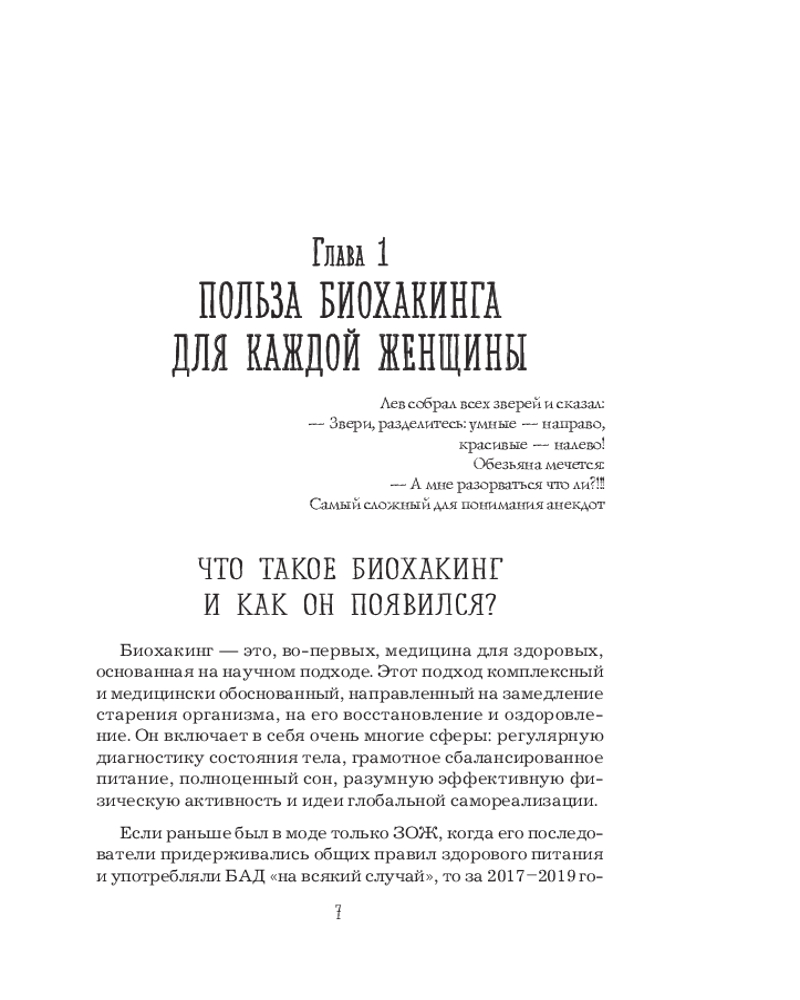 Биохакинг по-женски. Как запустить программу снижения биологического возрастаВ данный момент этот товар отсутствует в продаже. Возможно, у нас найдется аналогичный или похожий товар здесь. Серия: Главные секреты женской красоты и здоровья Биохакинг по-женски использует эффективные — от инновационных до проверенных веками, — при этом доступные каждому технологии, которые сделают так, что медицина станет ресурсом, инструментом для людей, которые хотят сохранять и поддерживать свое здоровье. Вы сможете легко снизить биологический возраст, а вместе с ним повысить эстетическую привлекательность через грамотную и комплексную профилактику и эффективную коррекцию организма. В основе всего будет лежать мониторинг данных здоровья клеток, диагностика плюс система, которую автор разработала и проверила на себе. Женский апгрейд — это и есть биохакинг, которым вы сможете заниматься здесь и сейчас. |
