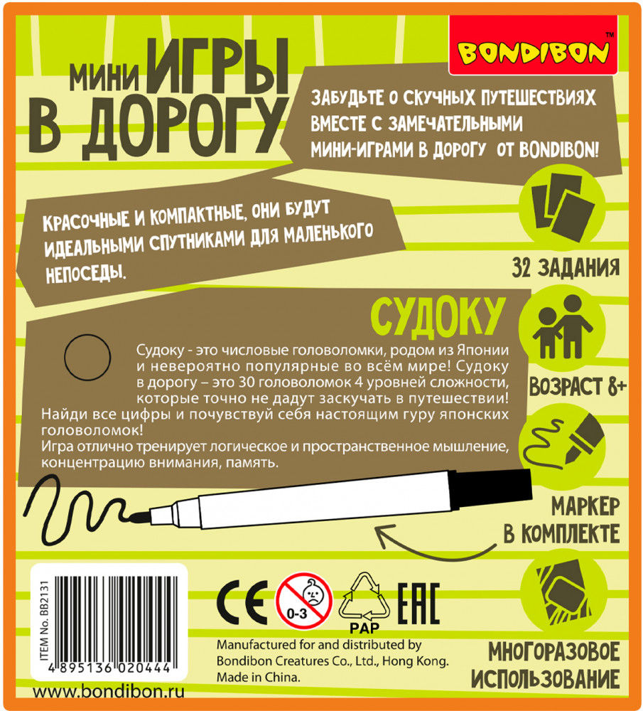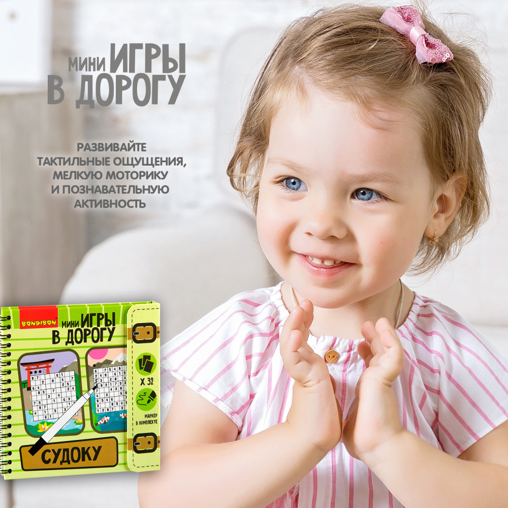 Bondibon Мини-игры в дорогу «Судоку»В данный момент этот товар отсутствует в продаже. Возможно, у нас найдется аналогичный или похожий товар здесь. Забудьте о скучных путешествиях вместе с замечательными мини-играми в дорогу от BONDIBON Красочные и компактные, они помогут провести время весело и с пользой Судоку - это числовые головоломки, родом из Японии и невероятно популярные во всём мире Судоку в дорогу это 30 головоломок 4 уровней сложности, которые точно не дадут заскучать в путешествии Найди все цифры и почувствуй себя настоящим гуру японских головоломок Игра отлично тренирует логическое и пространственное мышление, концентрацию внимания, память. |