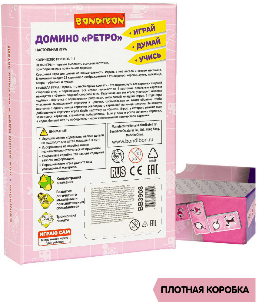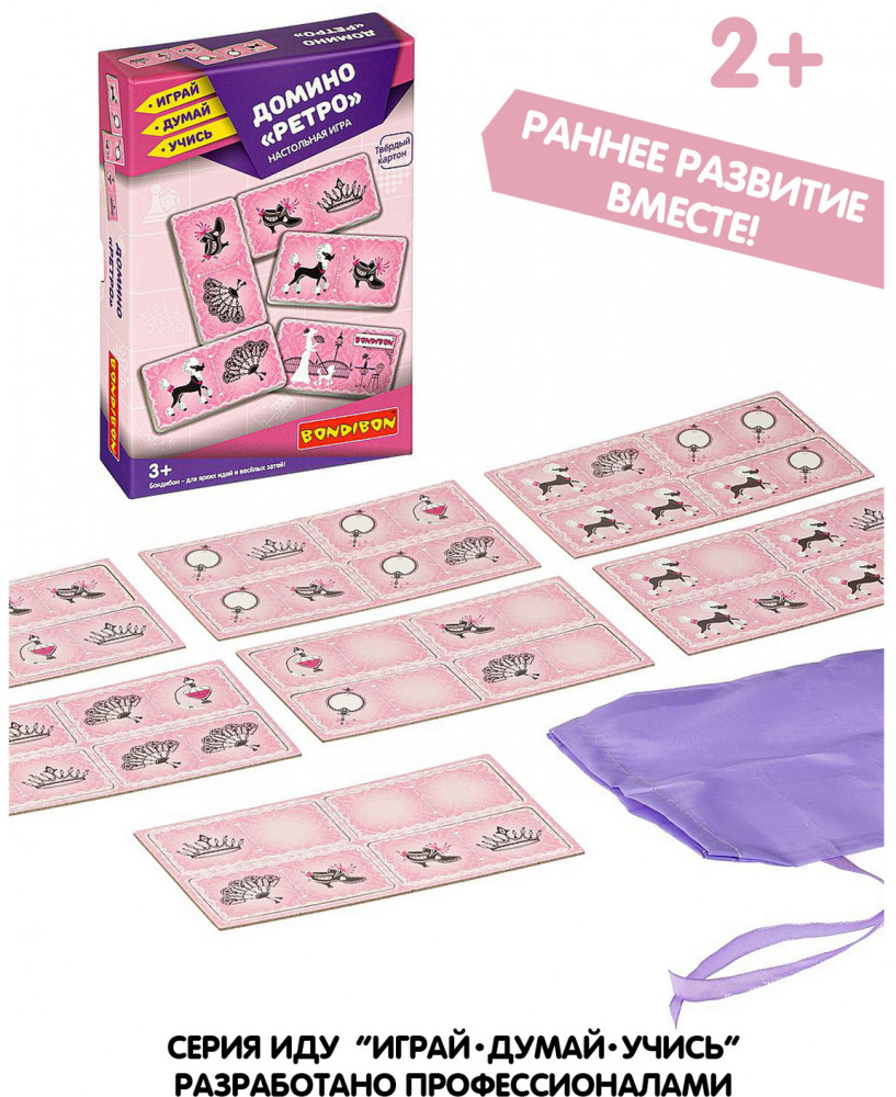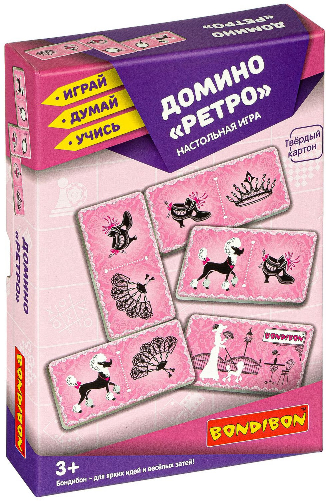 Серия: Играй. Думай. Учись Домино «Ретро» серии «Играй Думай Учись» от «Bondibon» развивает внимательность детей. Играть в неё весело и совсем несложно. Цель игры — первым выложить все свои карточки, присоединяя их в правильном порядке. |