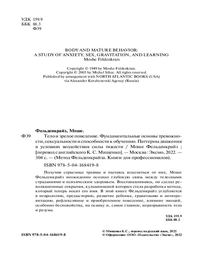 💳 Оплатить за товар можно при получении 🇰🇿 Есть бесплатная доставка по Казахстану от 1 дня 🎁 Копите бонусы с каждой покупки Серия: Метод Фельденкрайза. Книги для профессионалов Тело и зрелое поведение — это основополагающая работа творческого гения Фельденкрайза. В книге автор излагает философские основы развития своего экстраординарного подхода к человеческому росту и обучению, ныне известному как метод Фельденкрайза. Вы познакомитесь с понятием «целостная ситуация», научитесь применять системный подход к оценке физического движения, мыслей, эмоций, ощущений и окружающей среды. |