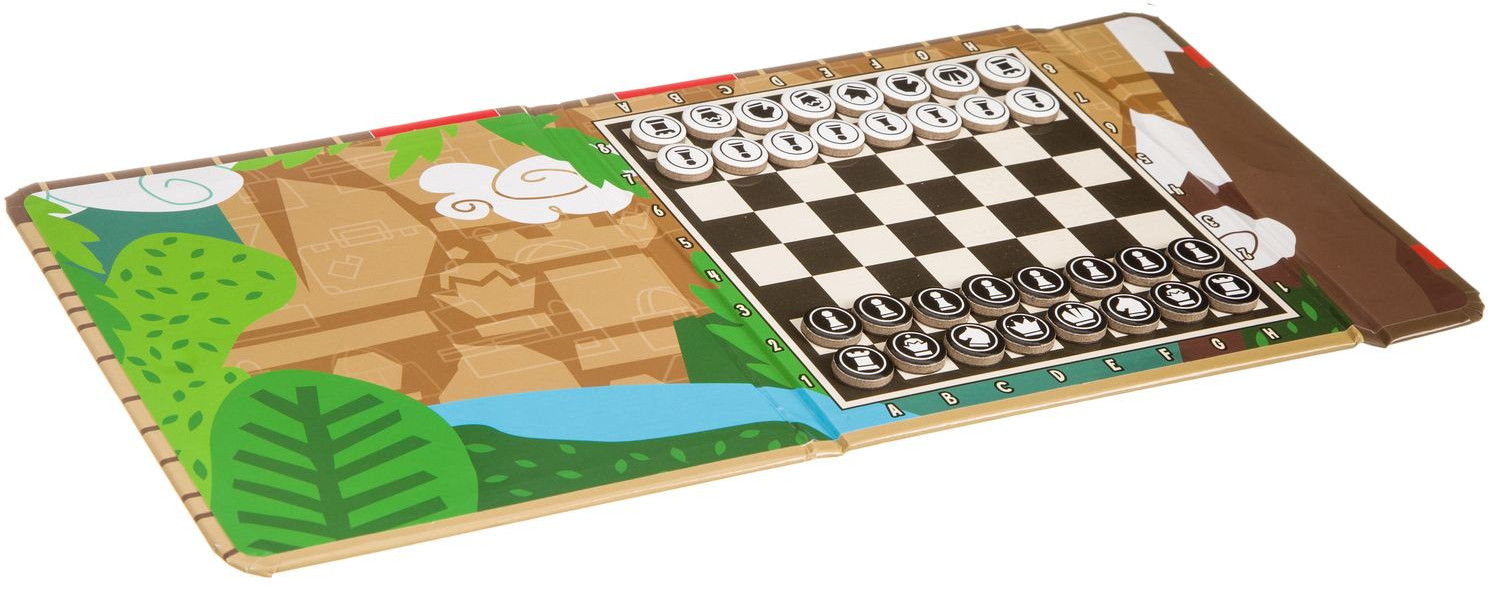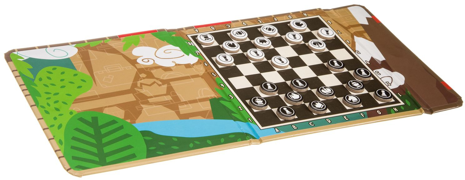 "Мини-игры в дорогу «Шашки и шахматы» (Bondibon) - хорошая упаковка, хорошие шахматы. В игре нет шашек, только шахматы. По-видимому, подразумевается, что шахматами можно играть и как шашками, т.е. не обращать внимания на шахматные обозначения. Шахматы из прочного картона, на магнитиках. Довольно красиво выполнены. Игра хорошая, но магнитики слабые, недостаточно прочно держат шахматы на игровом поле. Поэтому снизила оценку.