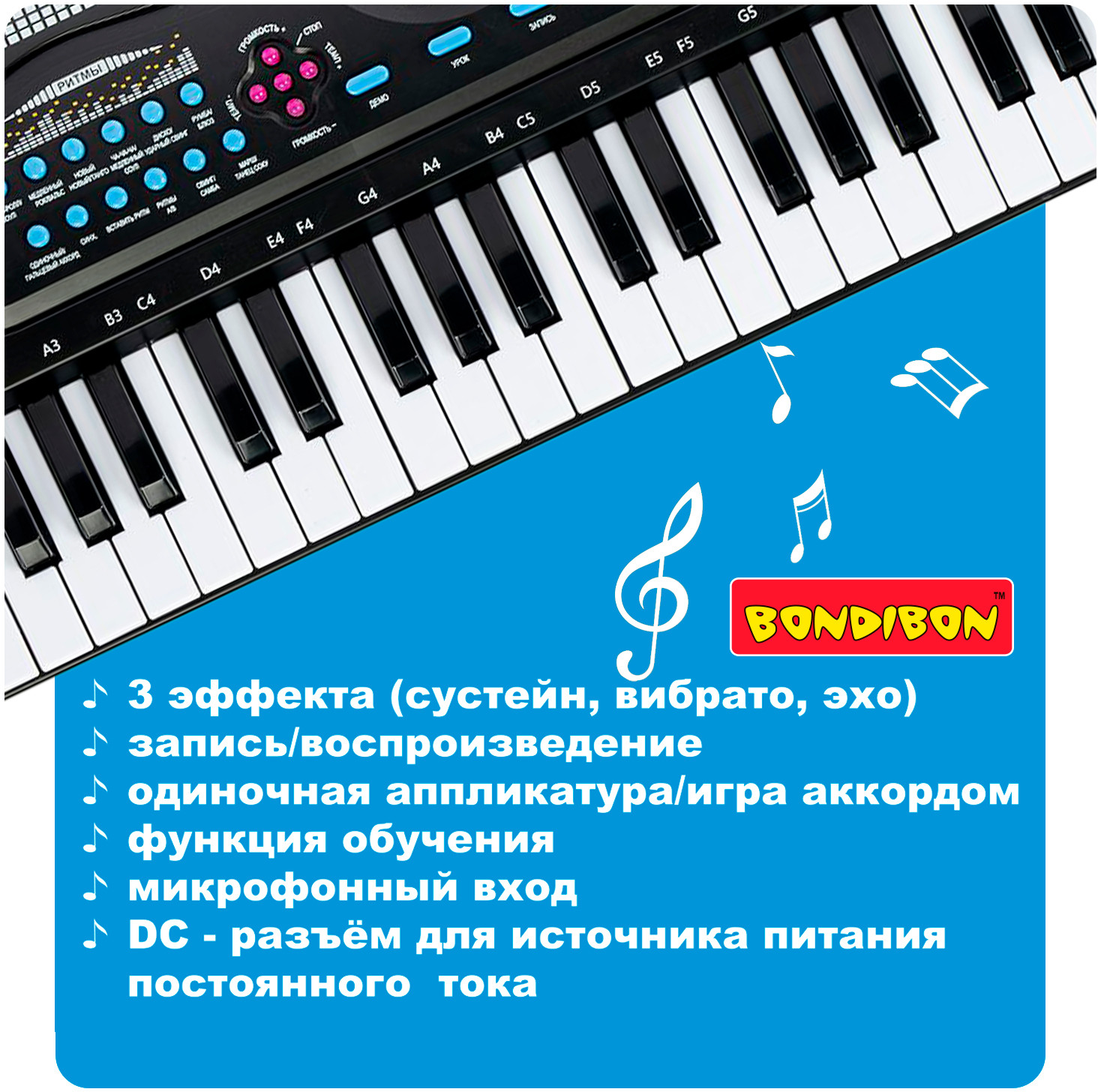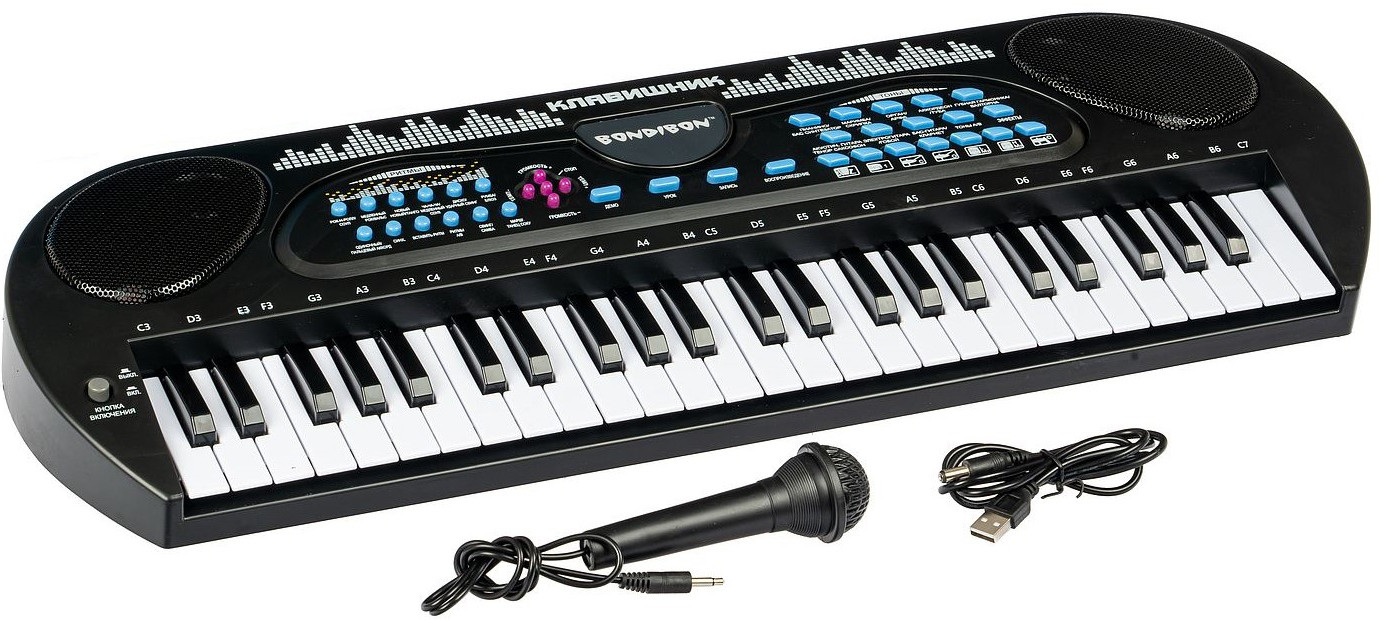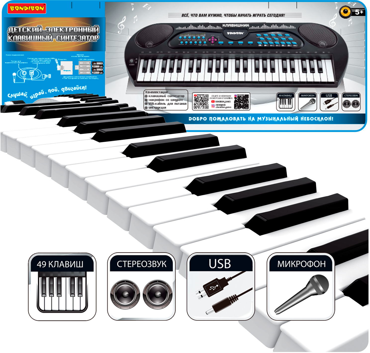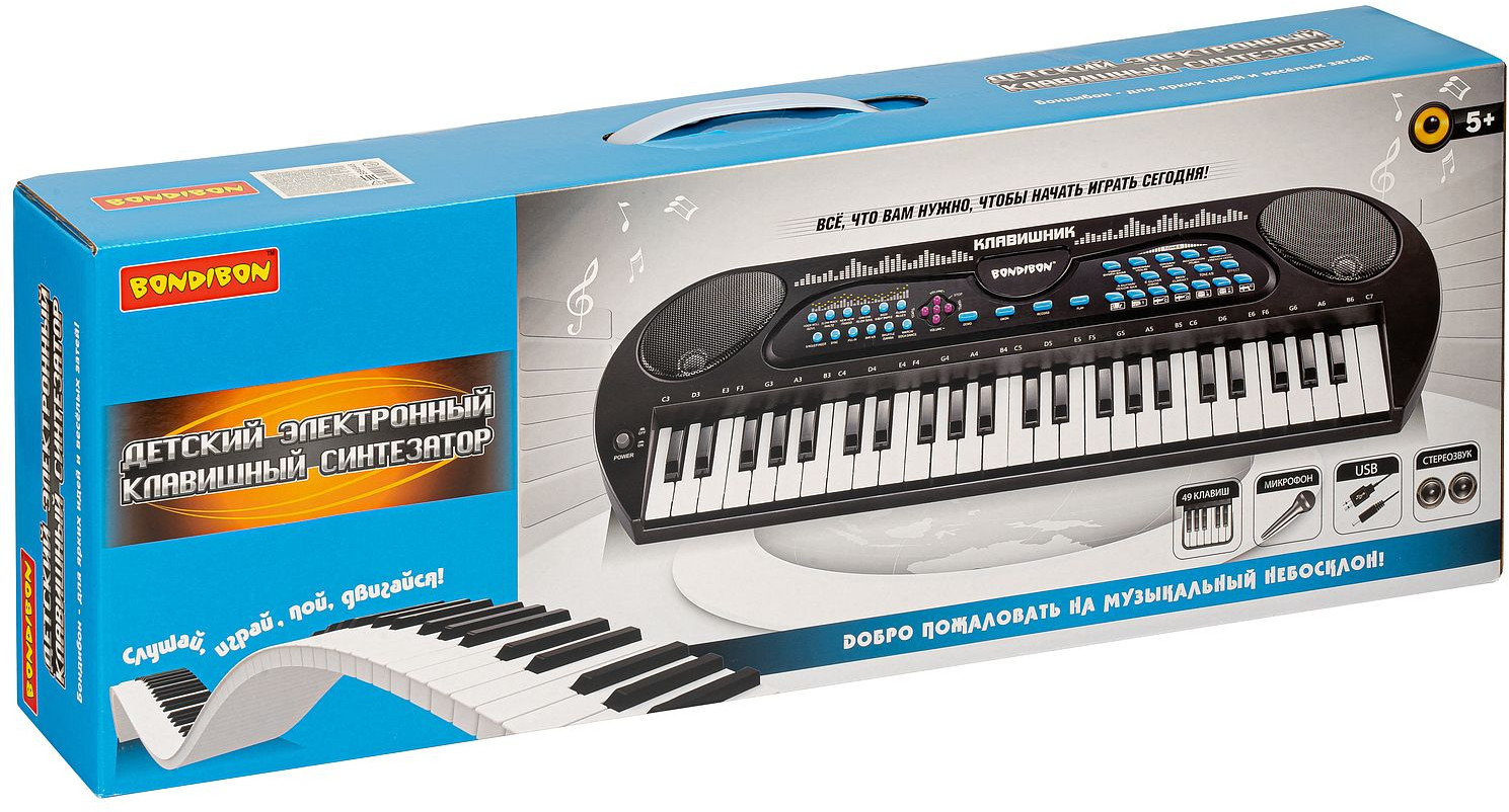 Синтезатор детский «Клавишник» с микрофоном и блоком питания ТМ Bondibon познакомит ребенка с миром музыки, позволит самостоятельно учиться играть на синтезаторе, развивая музыкальный слух, способствуя гармоничному развитию с малых лет. Компактный синтезатор не займет дома много места, поэтому его очень удобно использовать в качестве домашнего музыкального инструмента. Клавиатура синтезатора состоит из 49 клавиш, две колонки обеспечивают качественный стереозвук. Синтезатор имеет функции записи и воспроизведения мелодий, регулировки громкости и обучения.