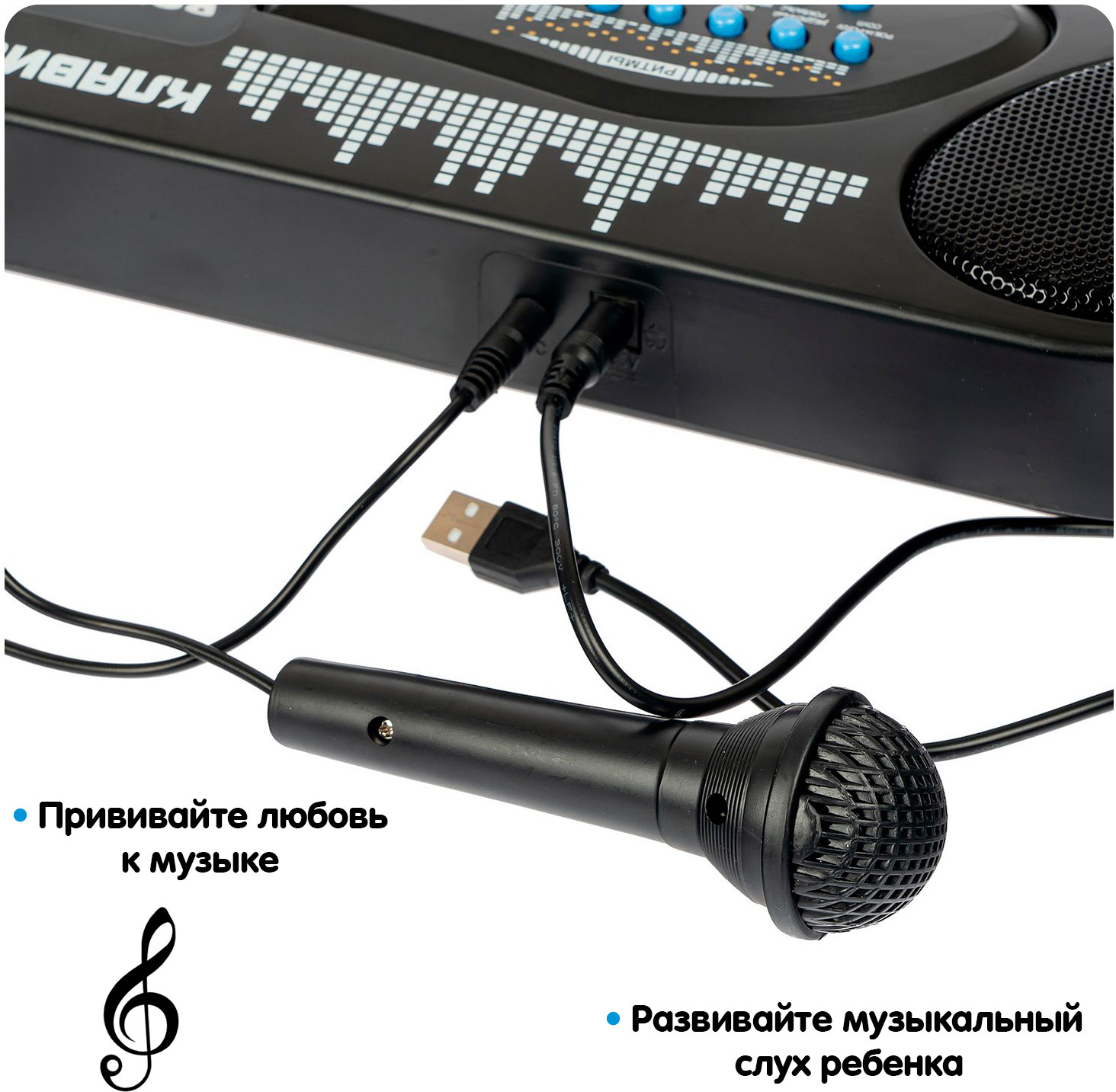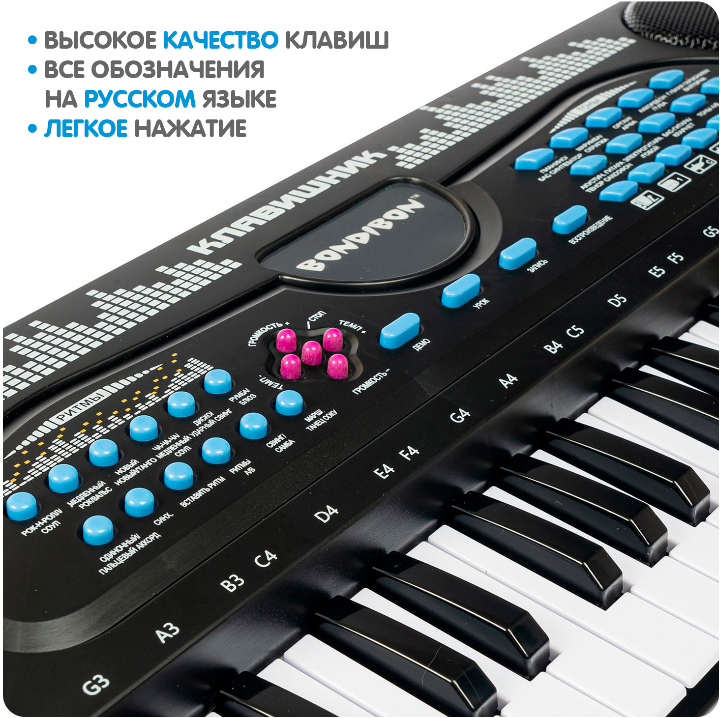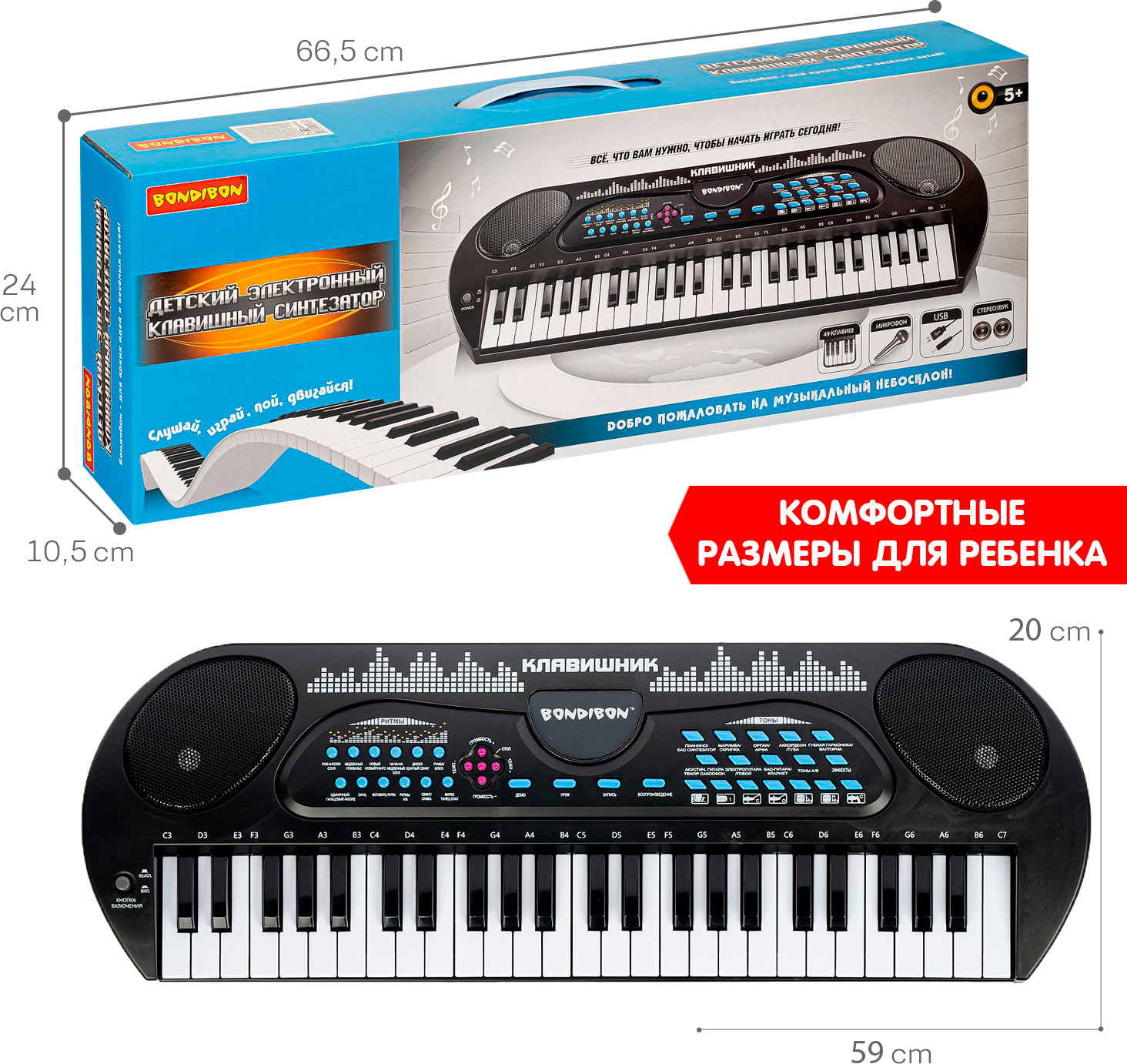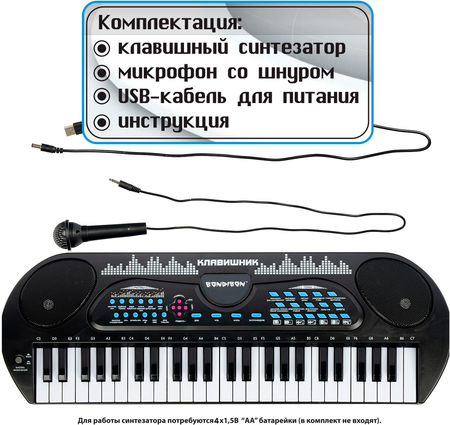 Синтезатор детский «Клавишник» с микрофоном и блоком питания ТМ Bondibon познакомит ребенка с миром музыки, позволит самостоятельно учиться играть на синтезаторе, развивая музыкальный слух, способствуя гармоничному развитию с малых лет. Компактный синтезатор не займет дома много места, поэтому его очень удобно использовать в качестве домашнего музыкального инструмента. Клавиатура синтезатора состоит из 49 клавиш, две колонки обеспечивают качественный стереозвук. Синтезатор имеет функции записи и воспроизведения мелодий, регулировки громкости и обучения.