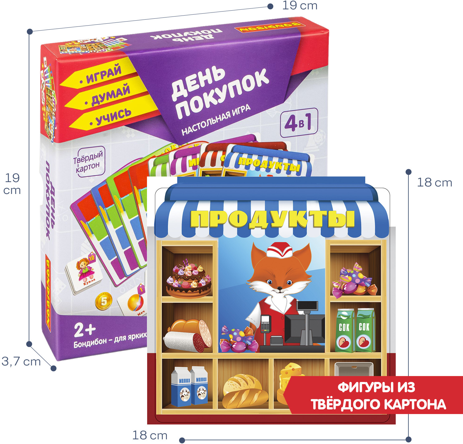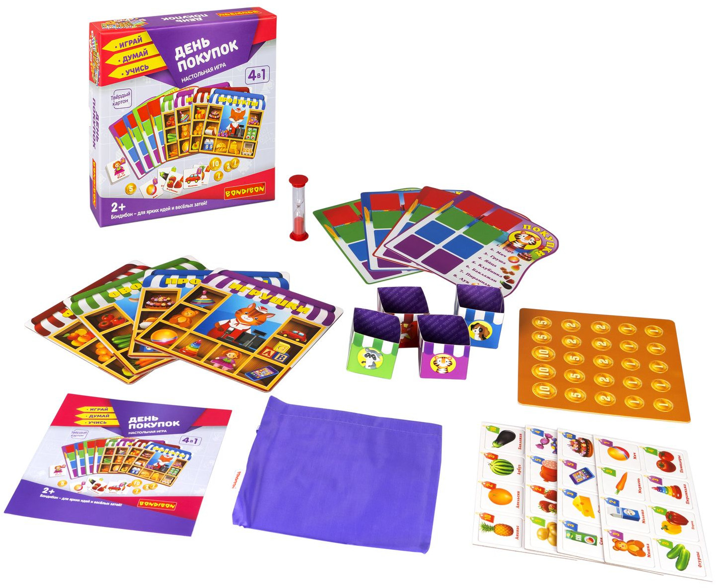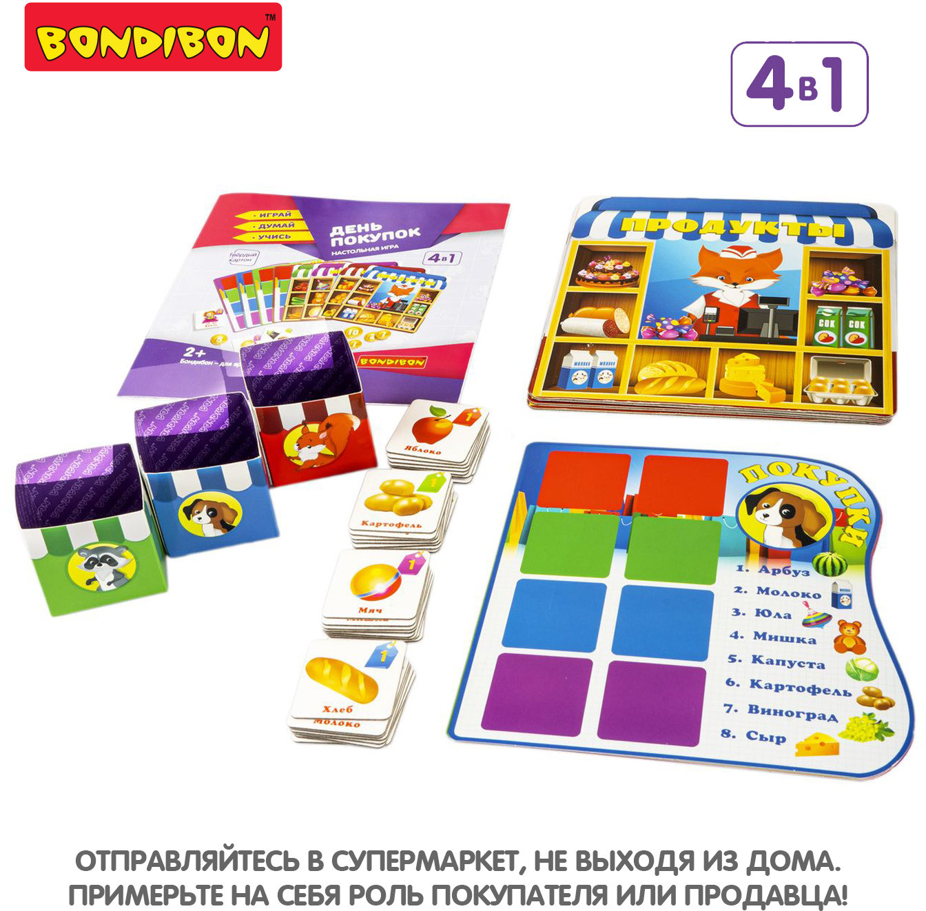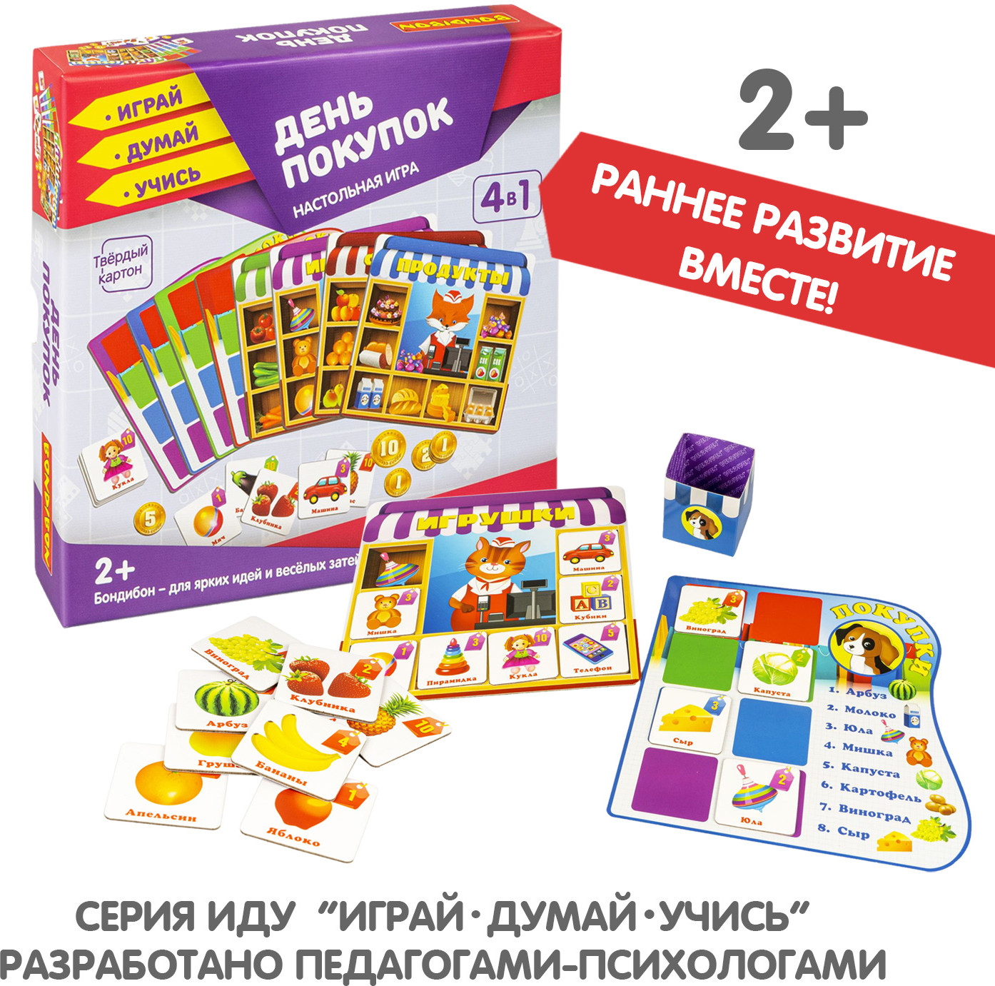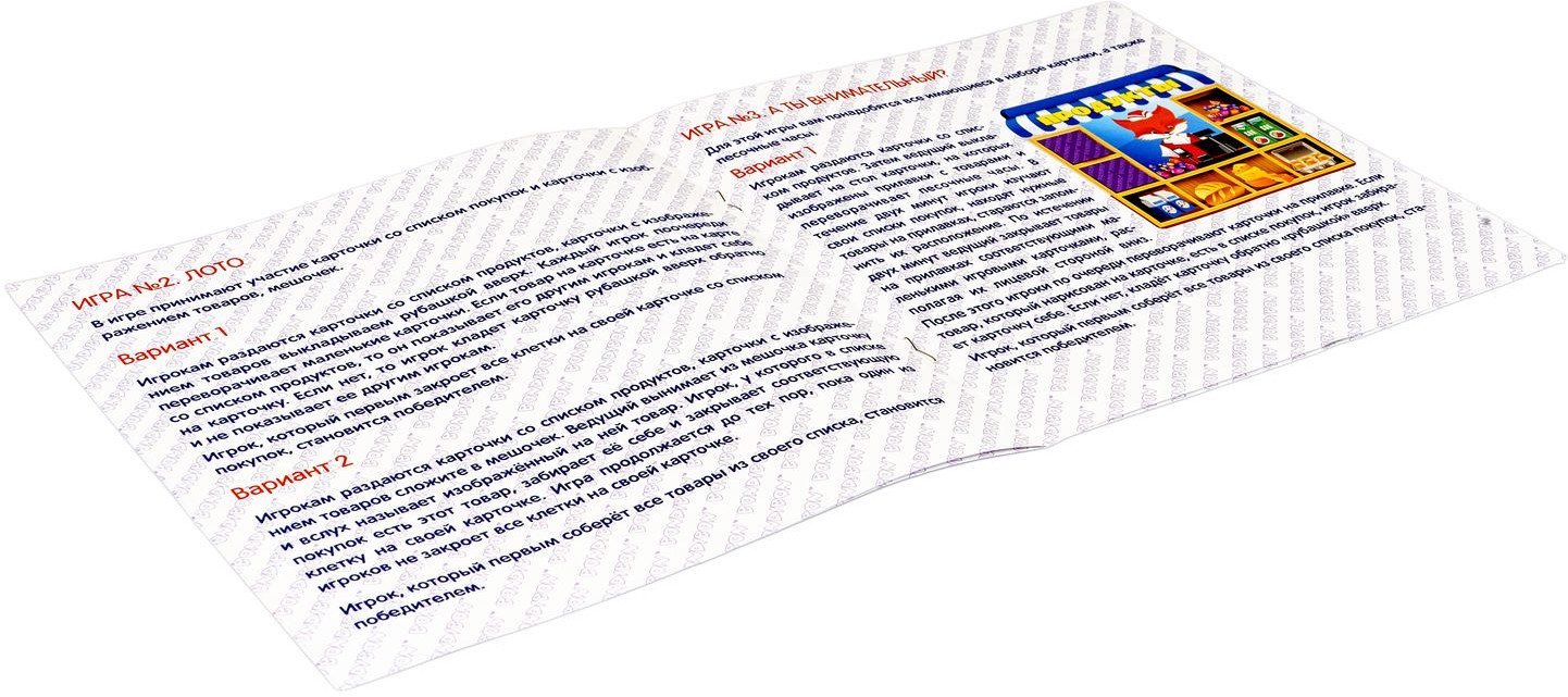 💳 Оплатить за товар можно при получении 🇰🇿 Есть бесплатная доставка по Казахстану от 1 дня 🎁 Копите бонусы с каждой покупки Серия: Играй. Думай. Учись Как провести время всей семьей с интересом и пользой? Настольная игра «День покупок» 4 в 1 от «Bondibon» определенно именно то, что Вам нужно! Серия «Играй Думай Учись» разработана специалистами в области психологии и педагогики и помогает тренировать память, концентрацию внимания и логическое мышление. Отправляйтесь в супермаркет, не выходя из дома, примеряйте на себя роль продавца или покупателя, совершайте покупки по списку и загляните в отдел игрушек. 4 способа игры позволят разнообразить игру и увлечься ею еще больше. Игра развивает зрительную память, образное мышление, а также способствует увеличению словарного запаса и улучшению коммуникативных навыков. |