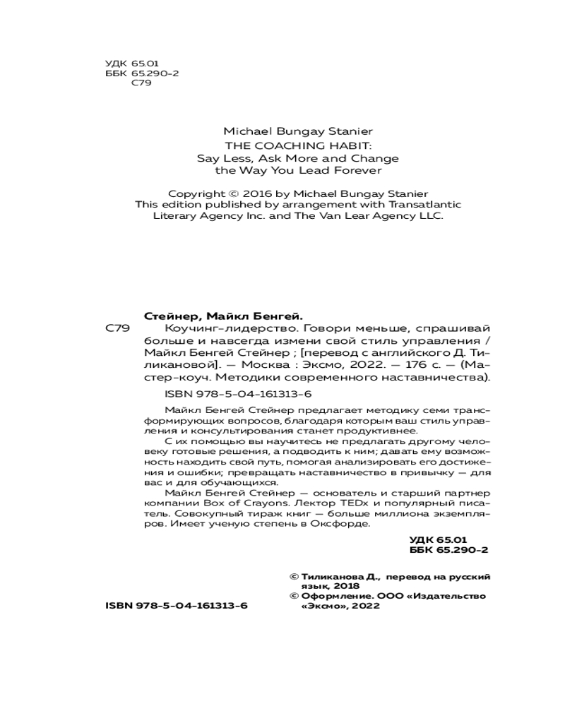 💳 Оплатить за товар можно при получении 🇰🇿 Есть бесплатная доставка по Казахстану от 1 дня 🎁 Копите бонусы с каждой покупки Серия: Мастер-коуч. Методики современного наставничества Автор этой книги убежден, что опытному коучу достаточно 10 минут в день, чтобы повысить эффективность своих сотрудников и клиентов. Главное — задавать правильные вопросы. Майкл Бенгей Стейнер, ведущий бизнес-тренер, предлагает методику семи трансформирующих вопросов, благодаря которым ваш стиль управления и консультирования станет продуктивнее. |