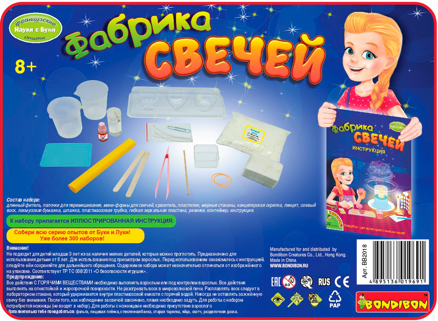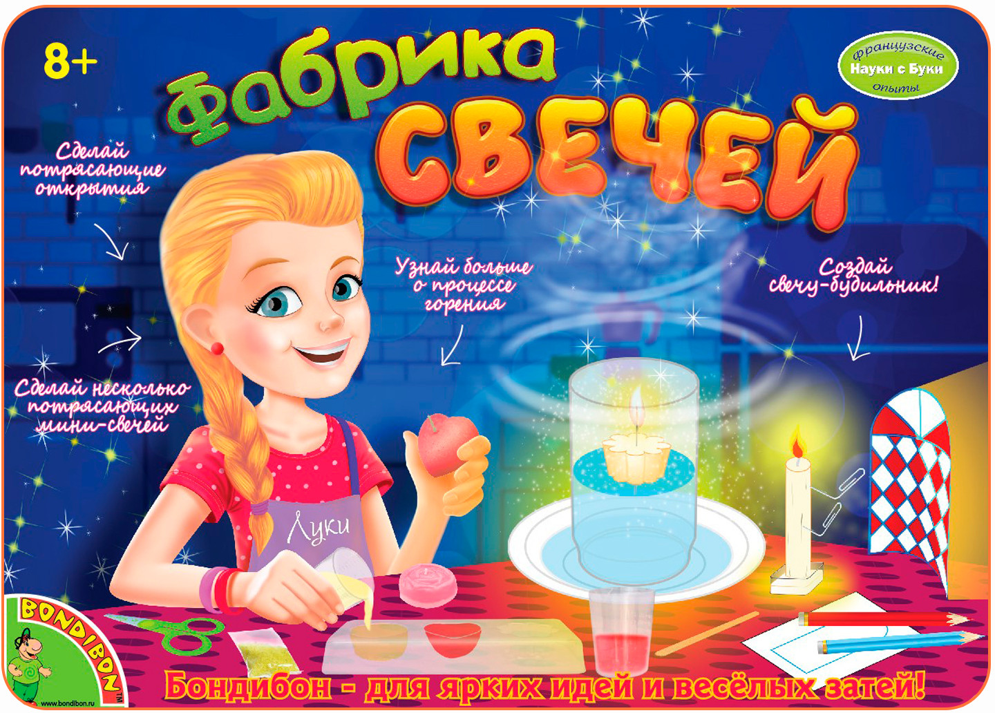 Серия: Науки с Буки. Французские опыты Свечи — это красиво, таинственно и романтично! Казалось бы, мы знаем всё об этом простом предмете. Но можно узнать еще больше с набором от Bondibon! Узнайте больше о процессе горения, создайте милые, разнообразные свечки и даже свечу-будильник! Как? Все подробности — в подробной инструкции! |
