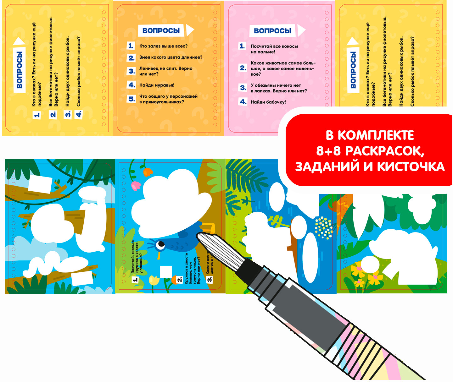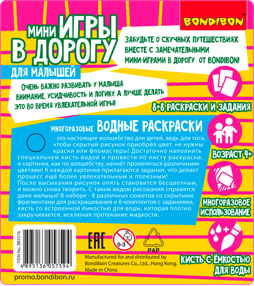 💳 Оплатить за товар можно при получении 🇰🇿 Есть бесплатная доставка по Казахстану от 1 дня 🎁 Копите бонусы с каждой покупки Серия: Мини-игры в дорогу Просто добавь воды! Многоразовые водные раскраски от «Bondibon» — это замечательный тренажер для обучения маленького ребенка рисованию и раскрашиванию. Такие игры активно развивают моторику у малышей и способствуют подготовке детской руки к письму. А еще это настоящее волшебство! Достаточно наполнить специальную кисть водой и провести по листу раскраски, и картинка начнет проявляться различными цветами! При раскрашивании не происходит смешивания цветов с разных участков изображения, поэтому независимо от навыка рисования, рисунок получается аккуратный. |